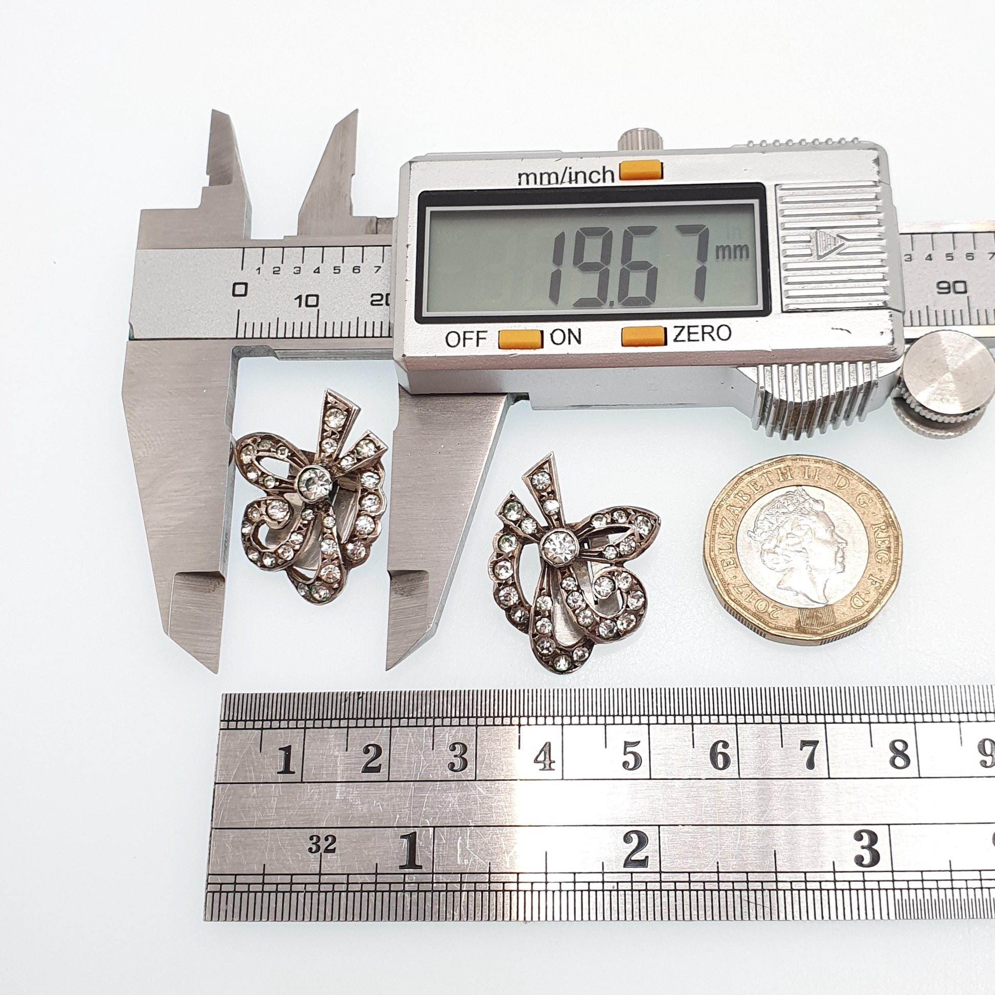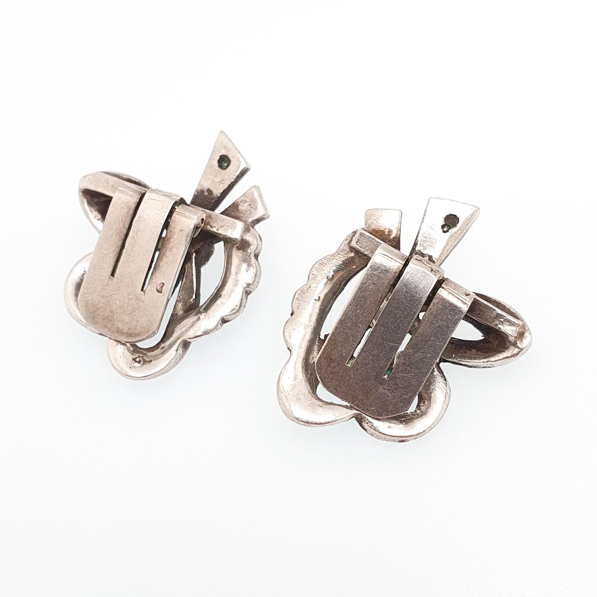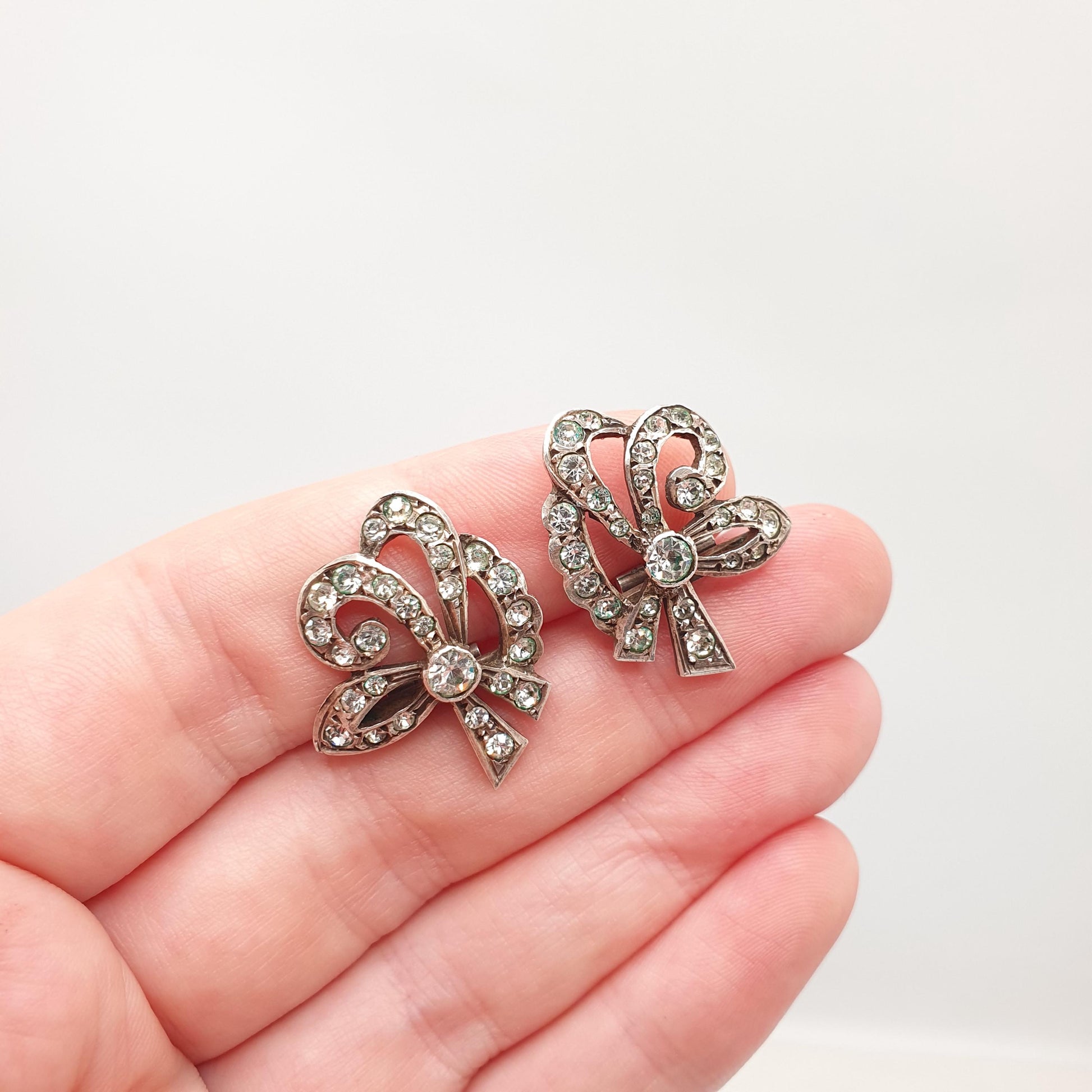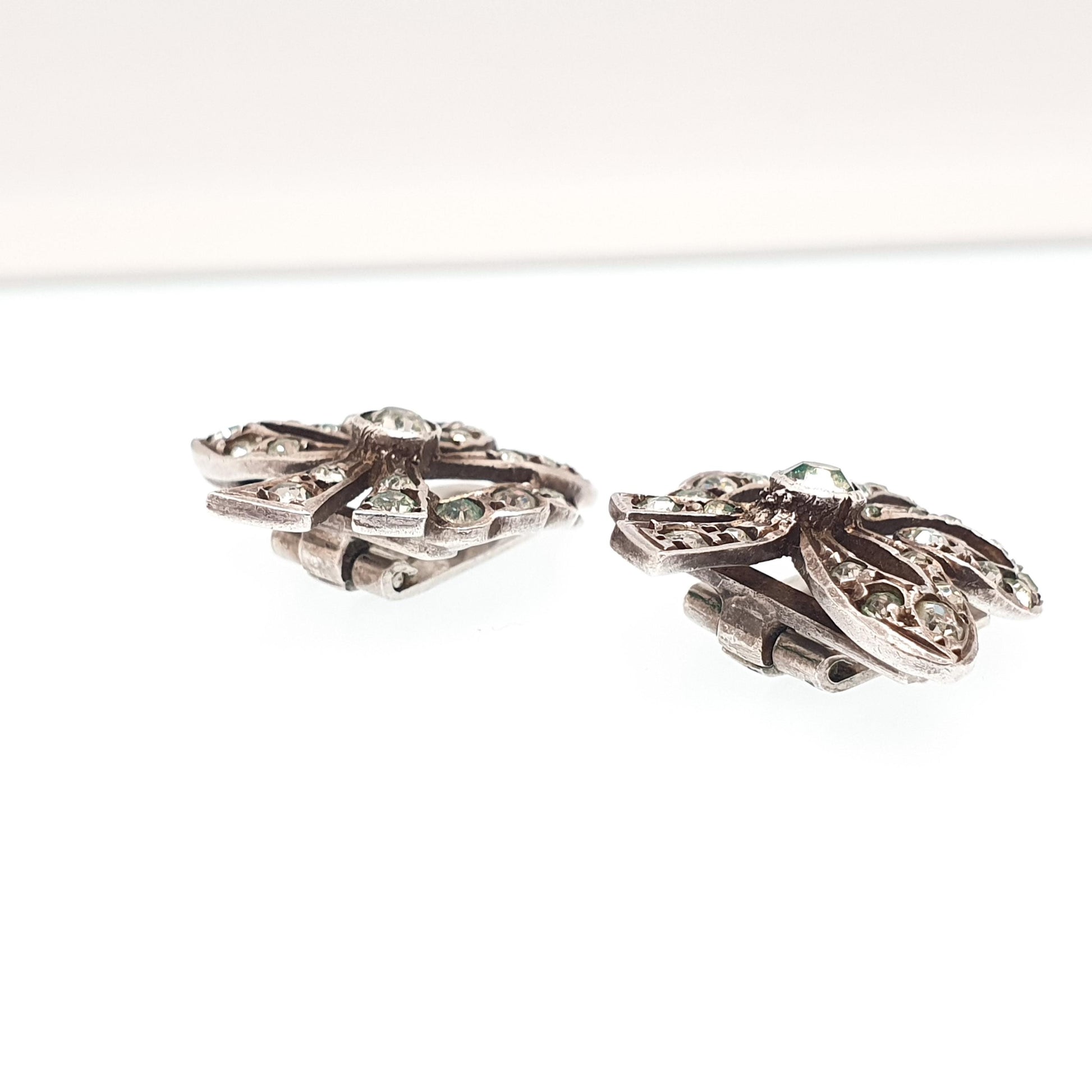 Antique Art Deco Solid Silver Bow Earrings Diamond Paste 1920s Clip On Flapper Cocktail Vintage Sparkly Jewelry Jewellery