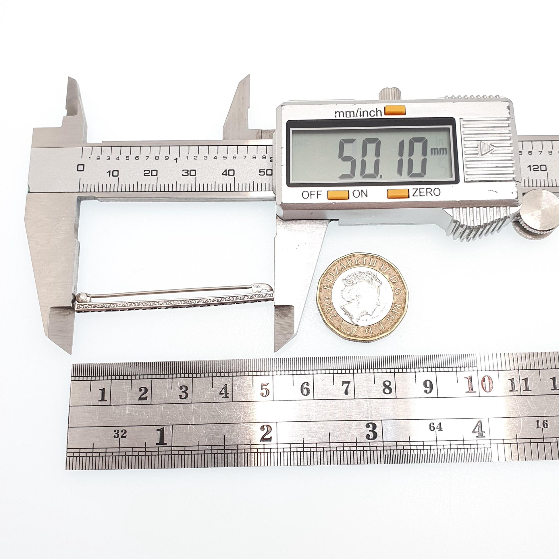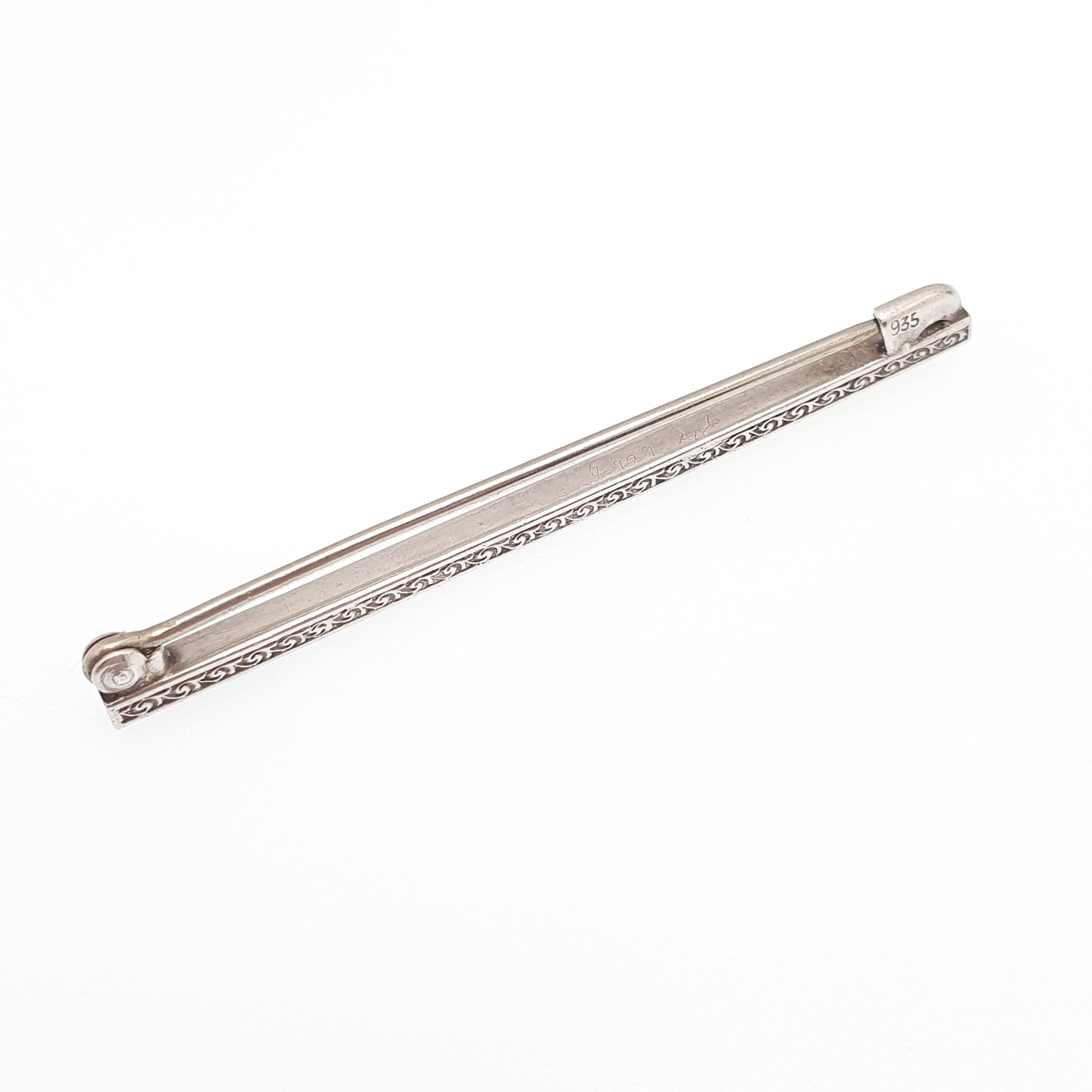DESCRIPTION: A stunning and sparkly antique art deco (c1920s) sterling silver brooch pin, adorned with square cut diamond pastes. The brooch is stamped "935" for silver and weighs approx. 1.90g. The size dimensions are in the later photos.