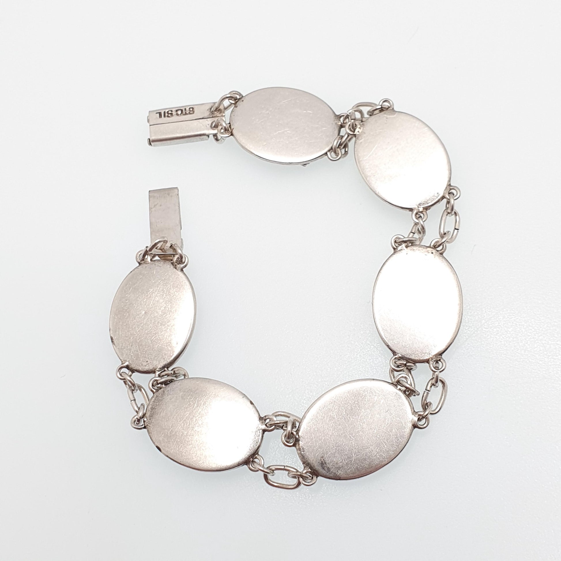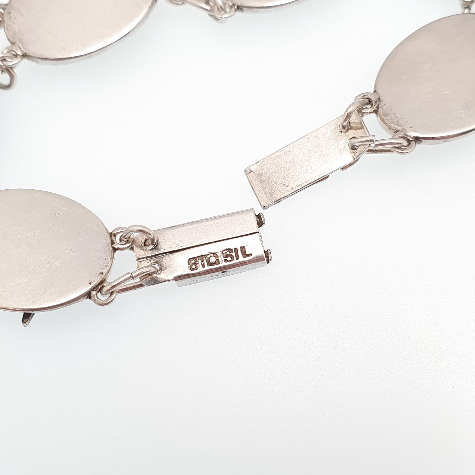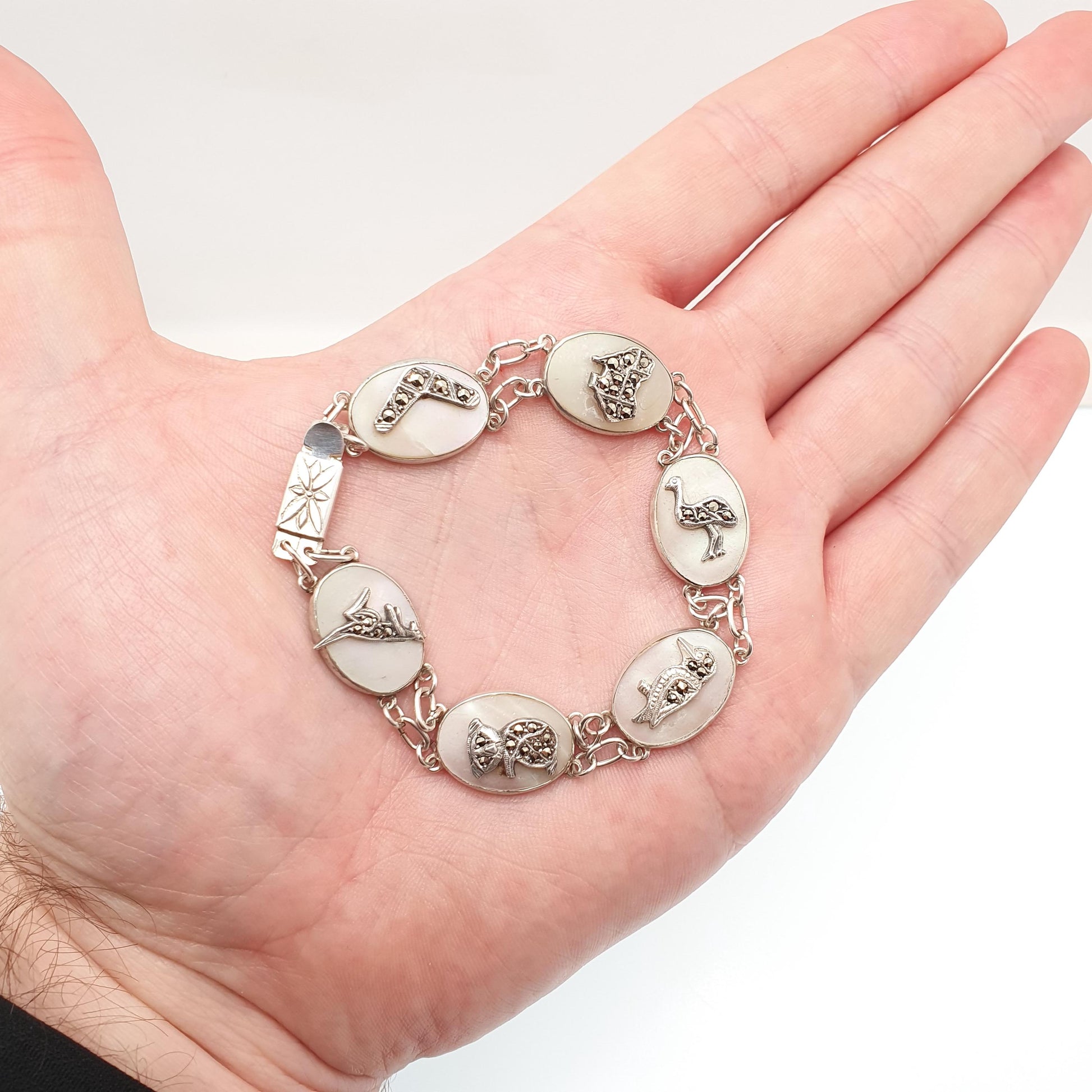 DESCRIPTION: A superb antique art deco sterling silver marcasite and mother of pearl bracelet, adorned with various Australian native decorations. The bracelet has been beautifully crafted and finished to a high standard. It's stamped "STG SIL" for sterling silver. It weighs approx. 17.77g and measures approx. 19cm or 7.5" in unfastened length.