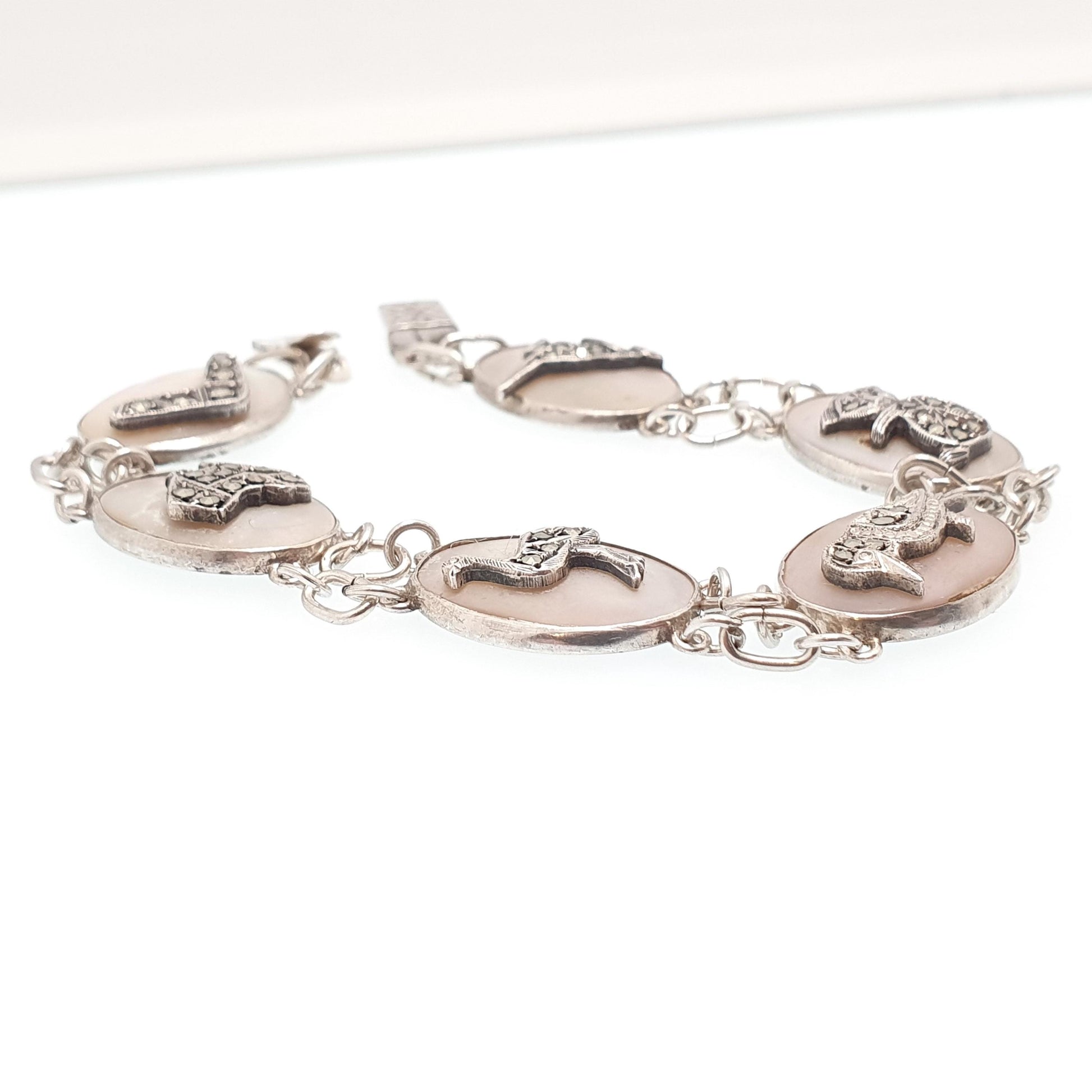 Antique Australian Sterling Silver Marcasite Bracelet Kangaroo Boomerang Emu Australia Art Deco Mother of Pearl 1920s Jewelry Jewellery