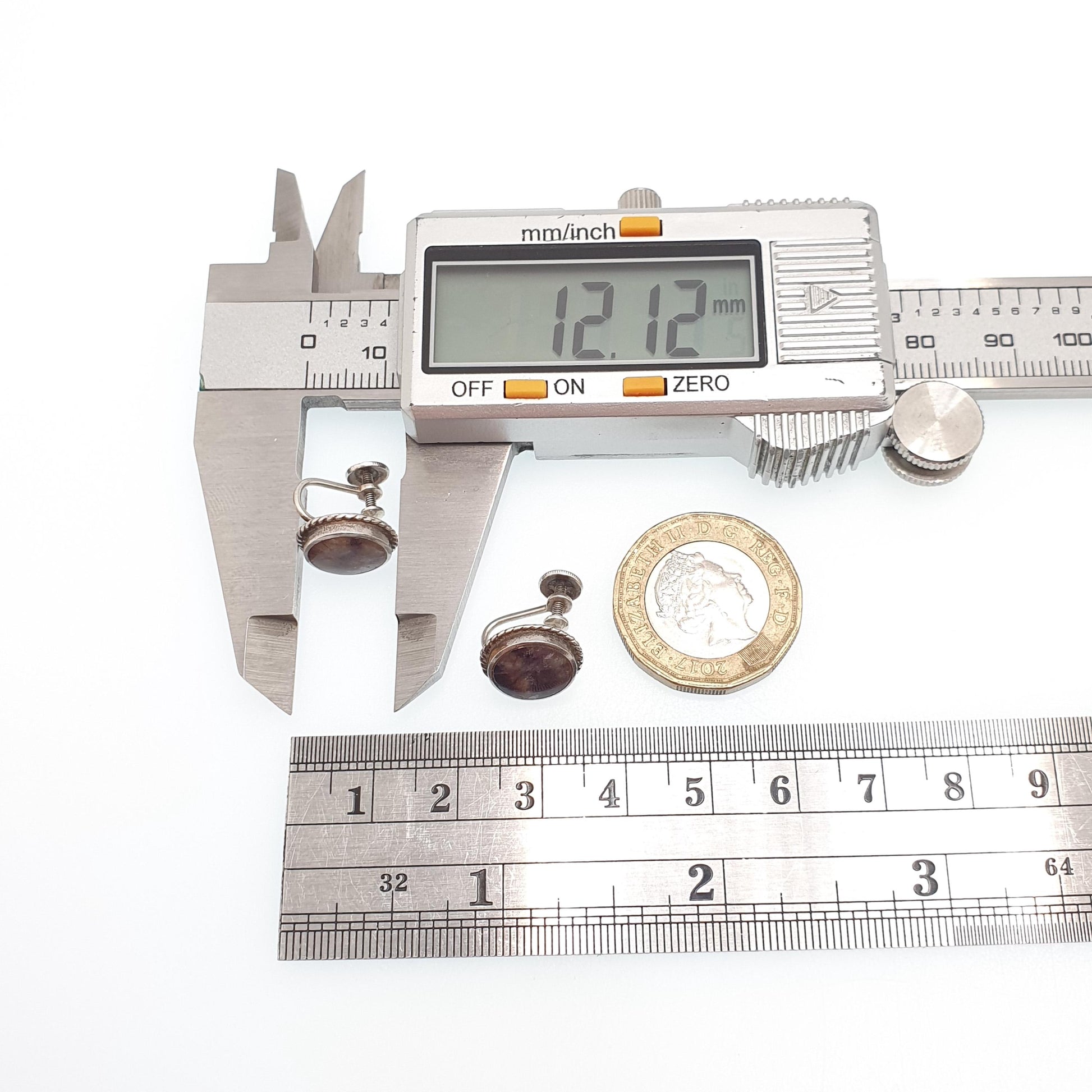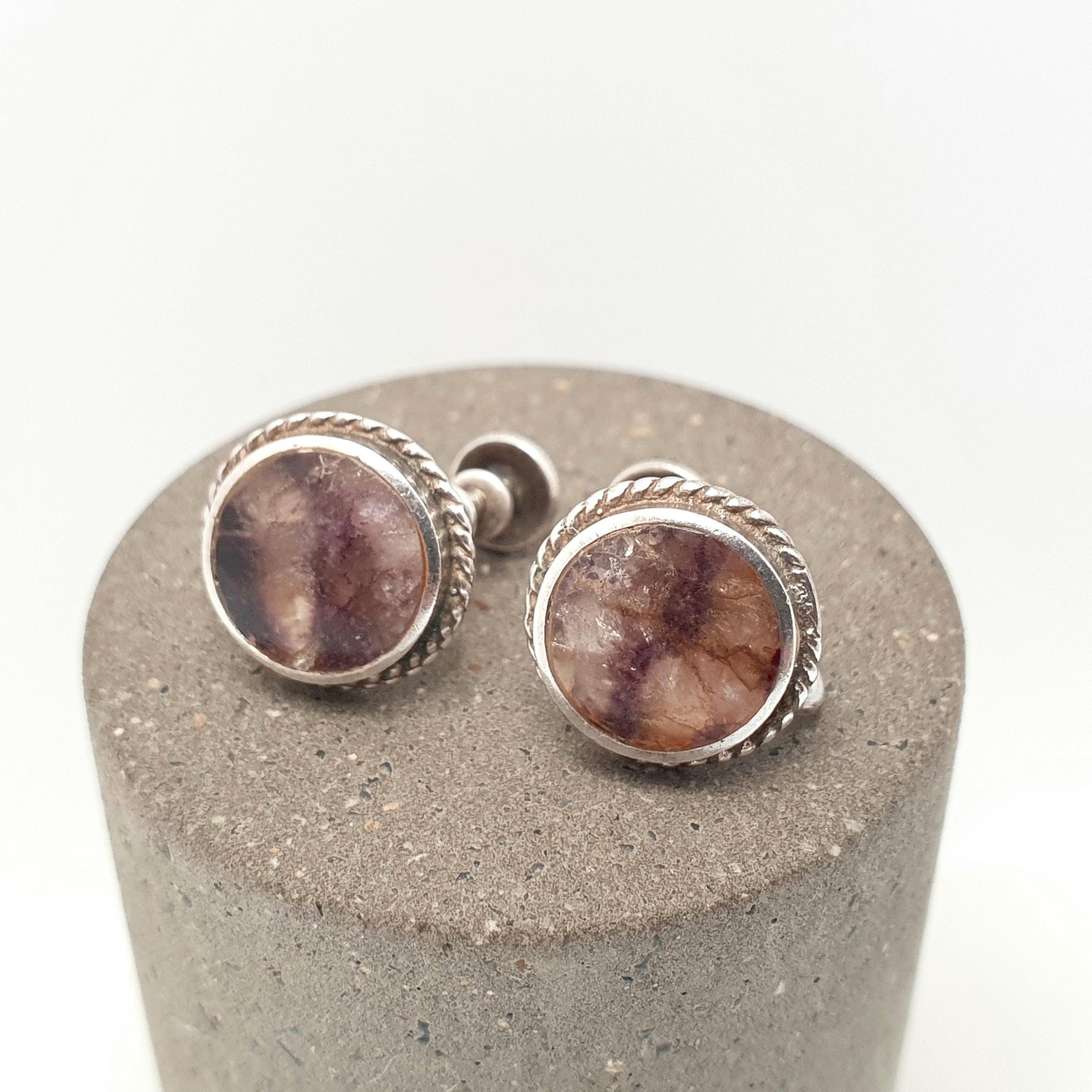 DESCRIPTION: A rare pair of antique art deco (c1920s) sterling silver and genuine blue john earrings. Blue john is an extremely rare mineral and can only be found in Derbyshire in the UK (not far from me), it is in fact Britain's rarest mineral. The earrings are stamped "SILVER" and the screws open/close well. They weigh a combined total of approx. 4.07g and the size dimensions are in the later photos.
