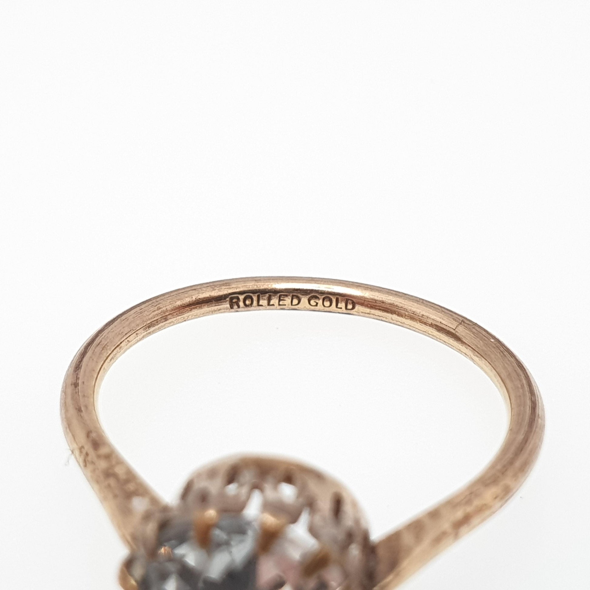 DESCRIPTION: A gorgeous antique rolled gold solitaire ring, adorned with a large diamond paste. The ring is stamped "ROLLED GOLD". It sizes at approx. UK L or US 5.75 and it weighs approx. 1.40g. As to be expected with age and use, the rolled gold finish has worn in areas, see pictures video.