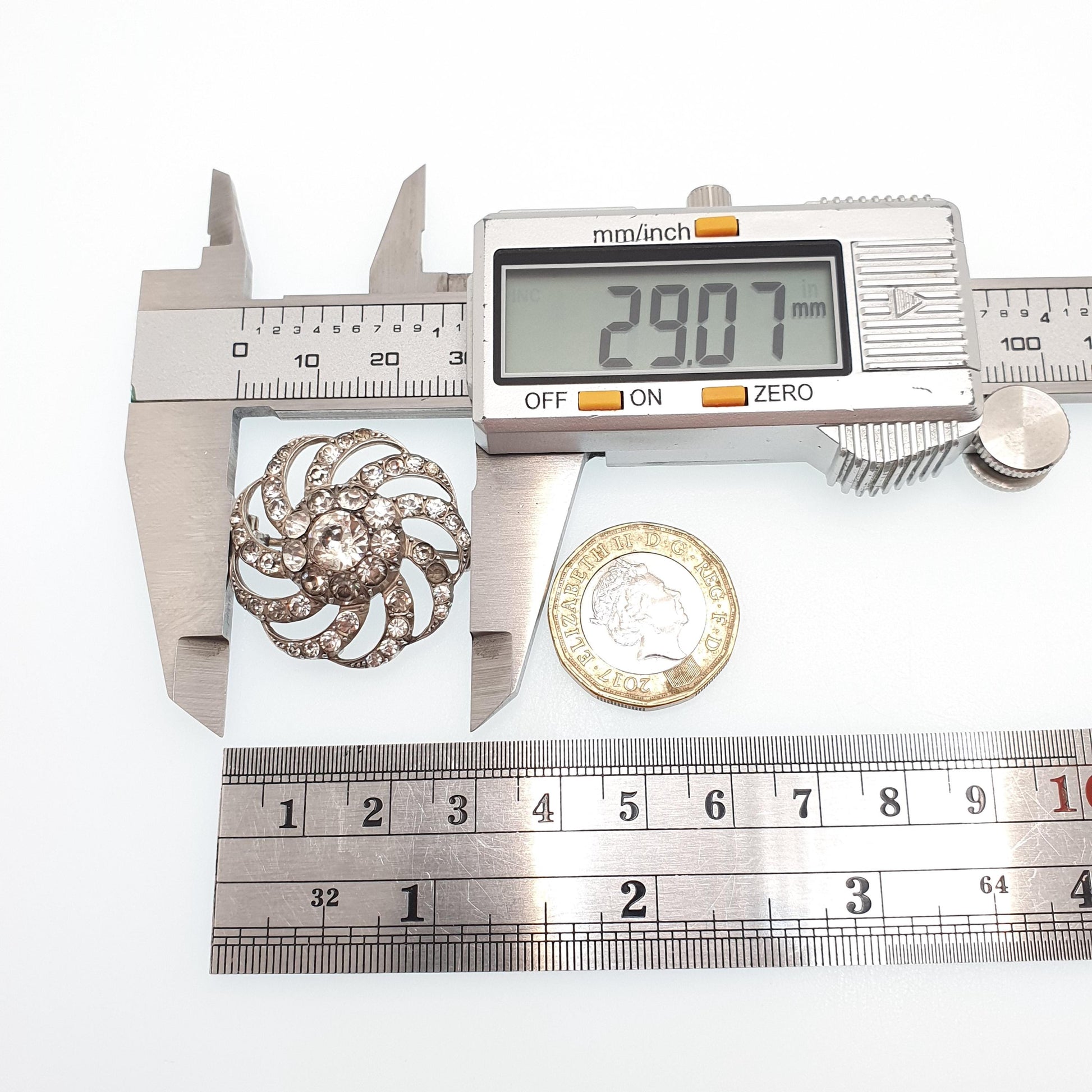 DESCRIPTION: A gorgeous antique Victorian solid silver diamond paste spiral brooch. The brooch is made by The Parisian Diamond Company who were prominent paste jewellery markers in the 1890s/1900s. It weighs approx. 9.01g and the size dimensions are in the later photos. It's stamped "900" for silver and stamped with a markers symbol. PLEASE NOTE: It looks like a number of pastes have been replaced at some point in the items life (see pictures/video), they're slightly different to the other pastes. I've altered the price accordingly.