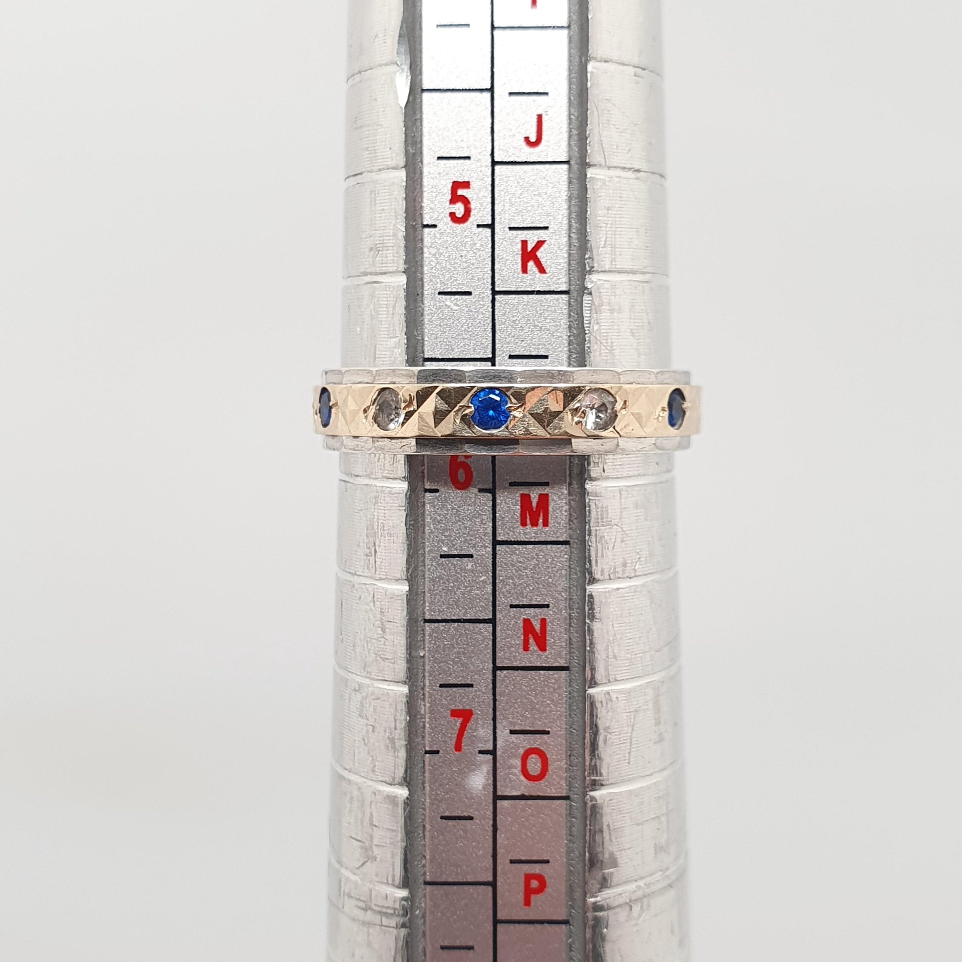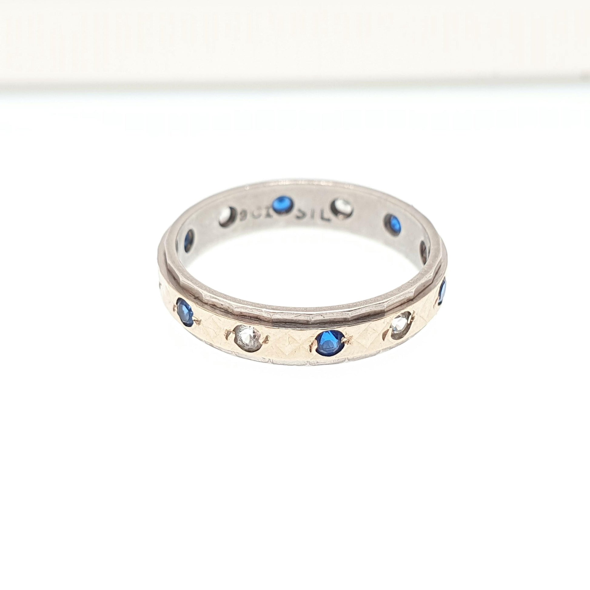 DESCRIPTION: A beautiful antique art deco 1920s vintage solid 9k 375 gold and sterling silver eternity ring, adorned with white & sapphire blue spinel gemstones. The ring sizes at approx. UK L or US 5.75. The ring is stamped "9ct SIL" and weighs approx. 2.03g.