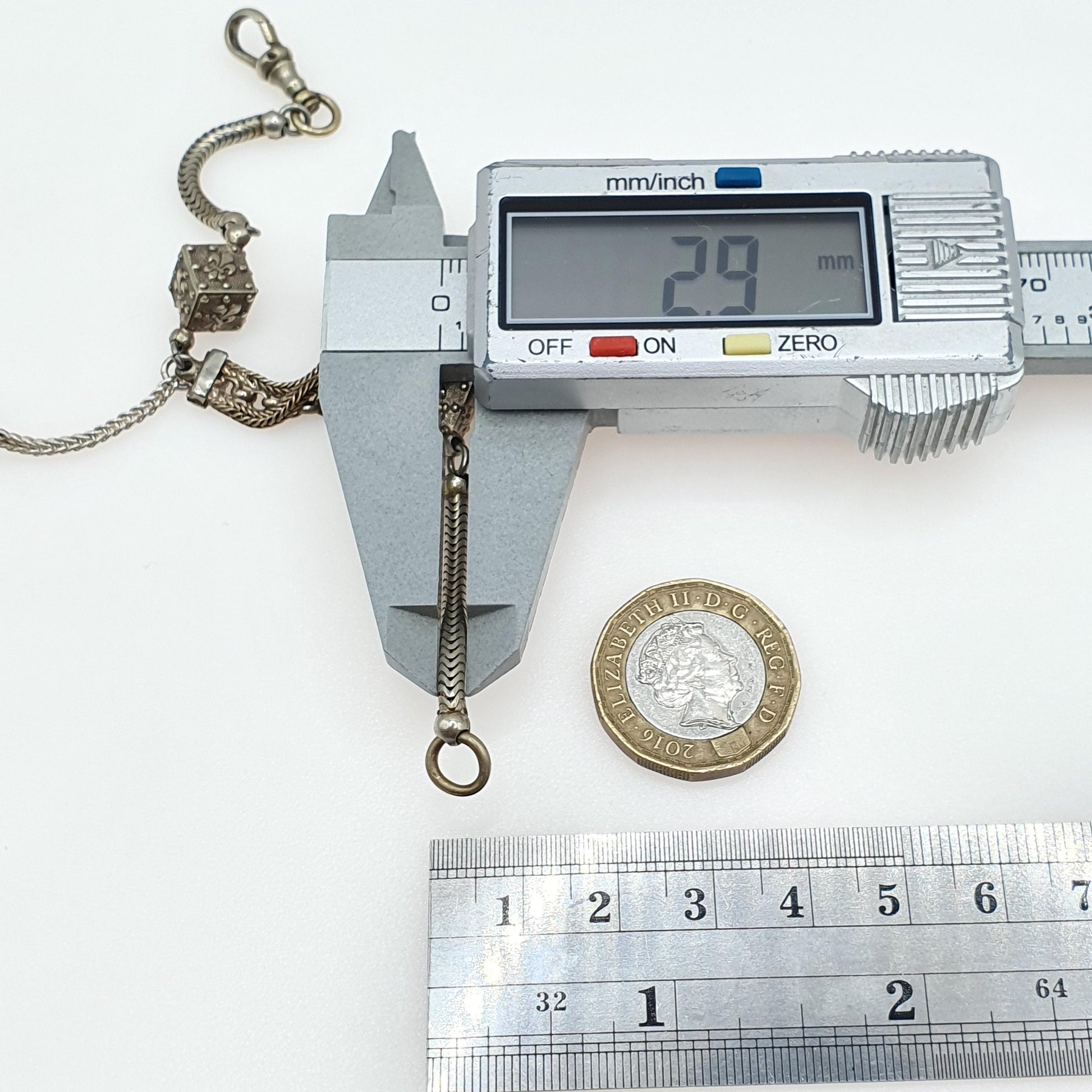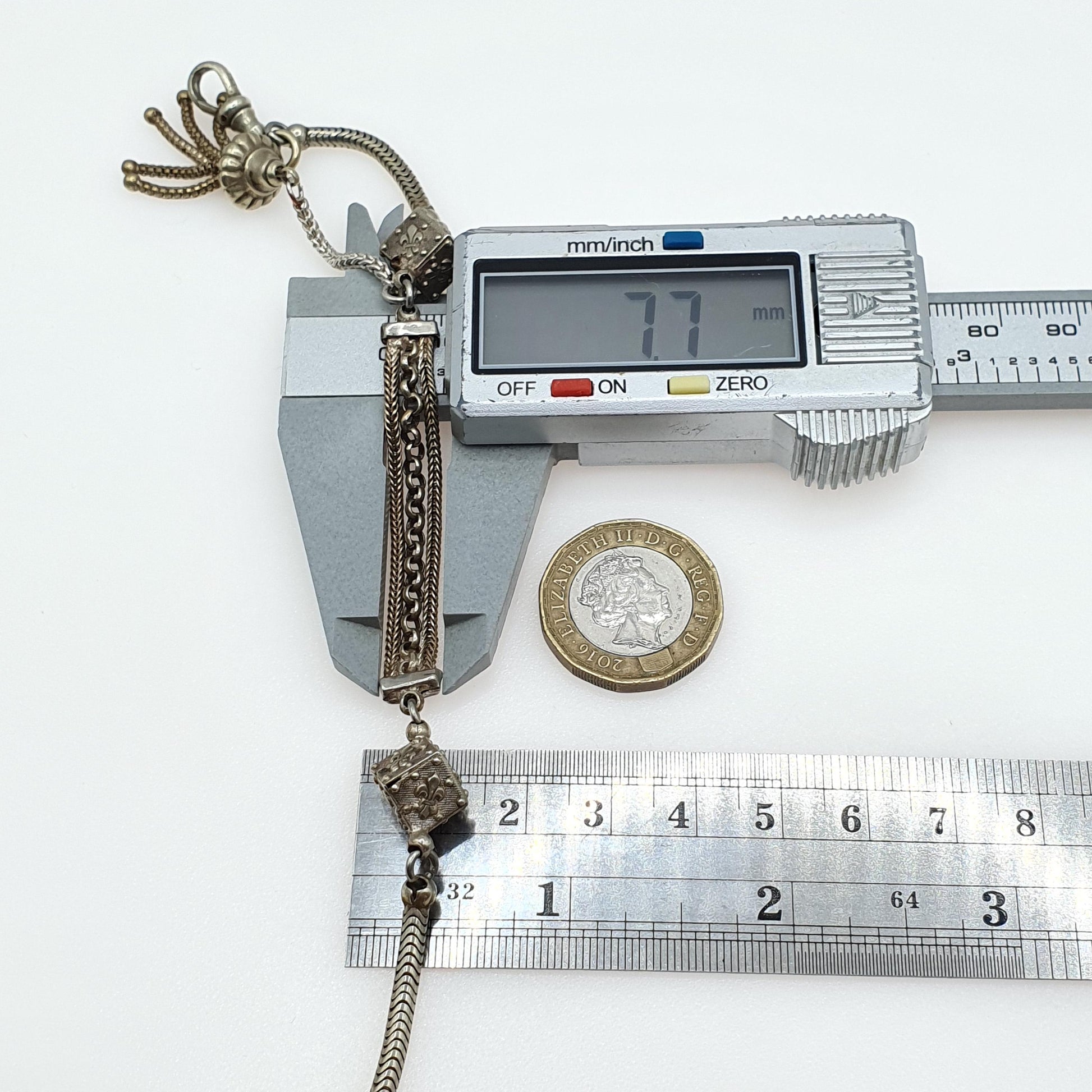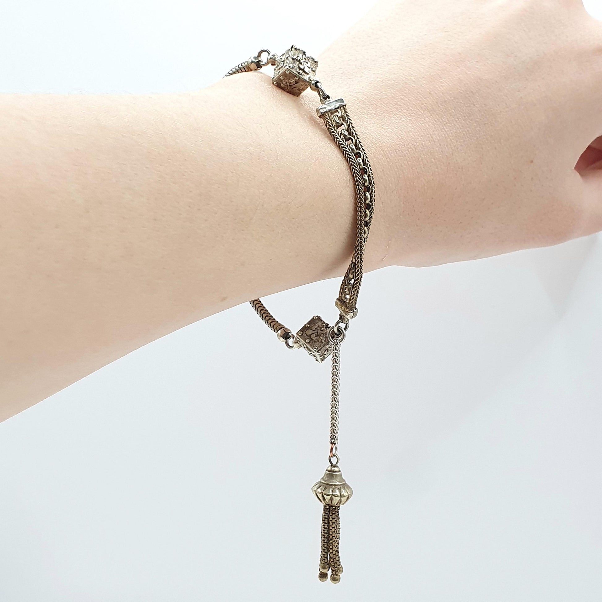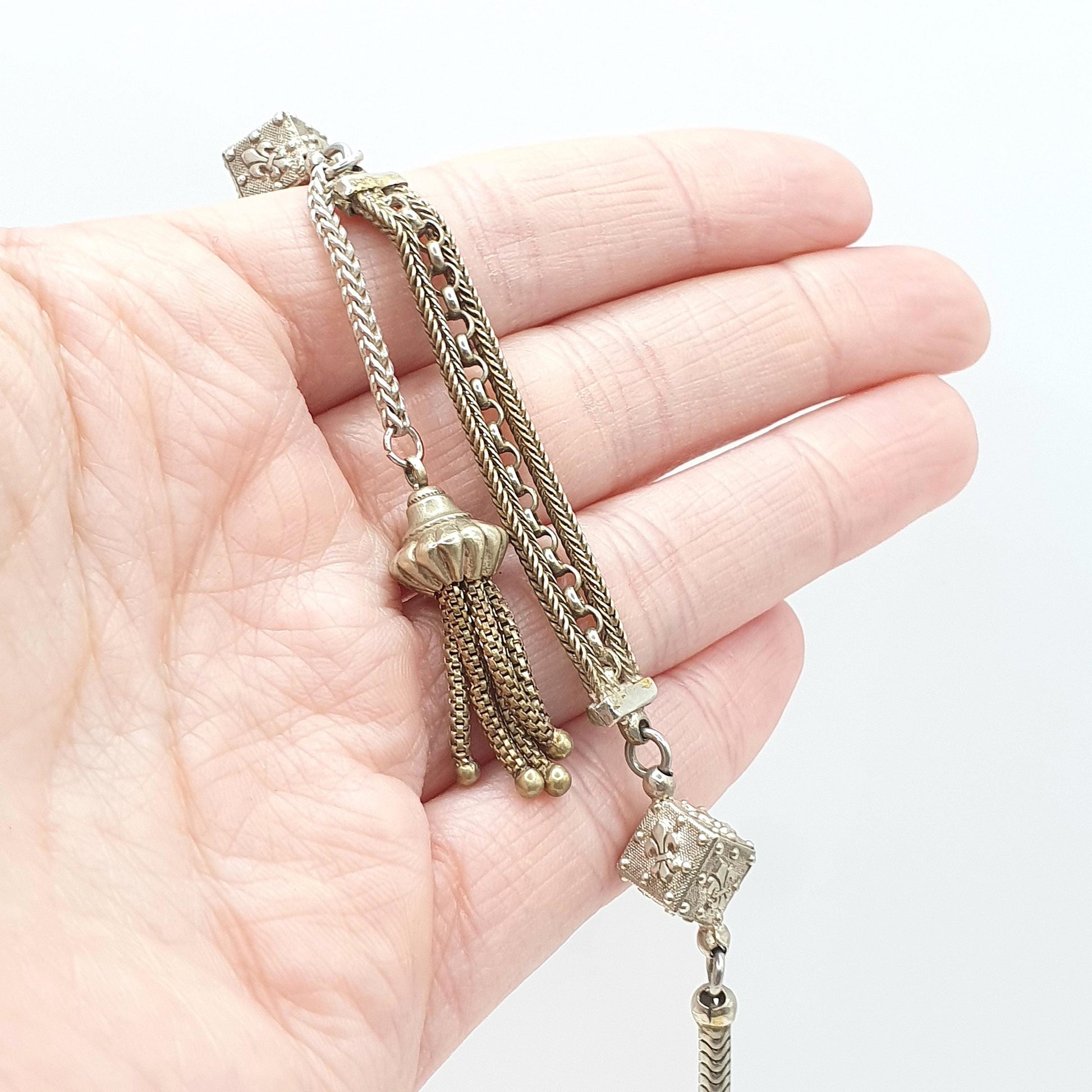 DESCRIPTION: A genuine antique Victorian silver tone base metal albertina bracelet. The bracelet is has 2 cube shaped links adorned with fleur de lys. It also has it's original tassel and dog clip. The bracelet measures approx. 19.5cm or 7.67" in length when unfastened and weighs 11.16g.