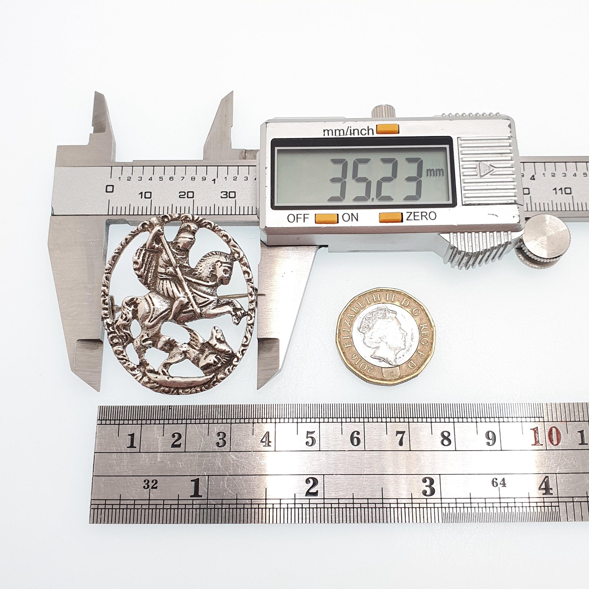 DESCRIPTION: A rare antique early Victorian or possibly Georgian solid silver St George and the Dragon brooch. The item is stamped "800" for silver. It weighs approx. 12.52g and the size dimensions are in the later photos.