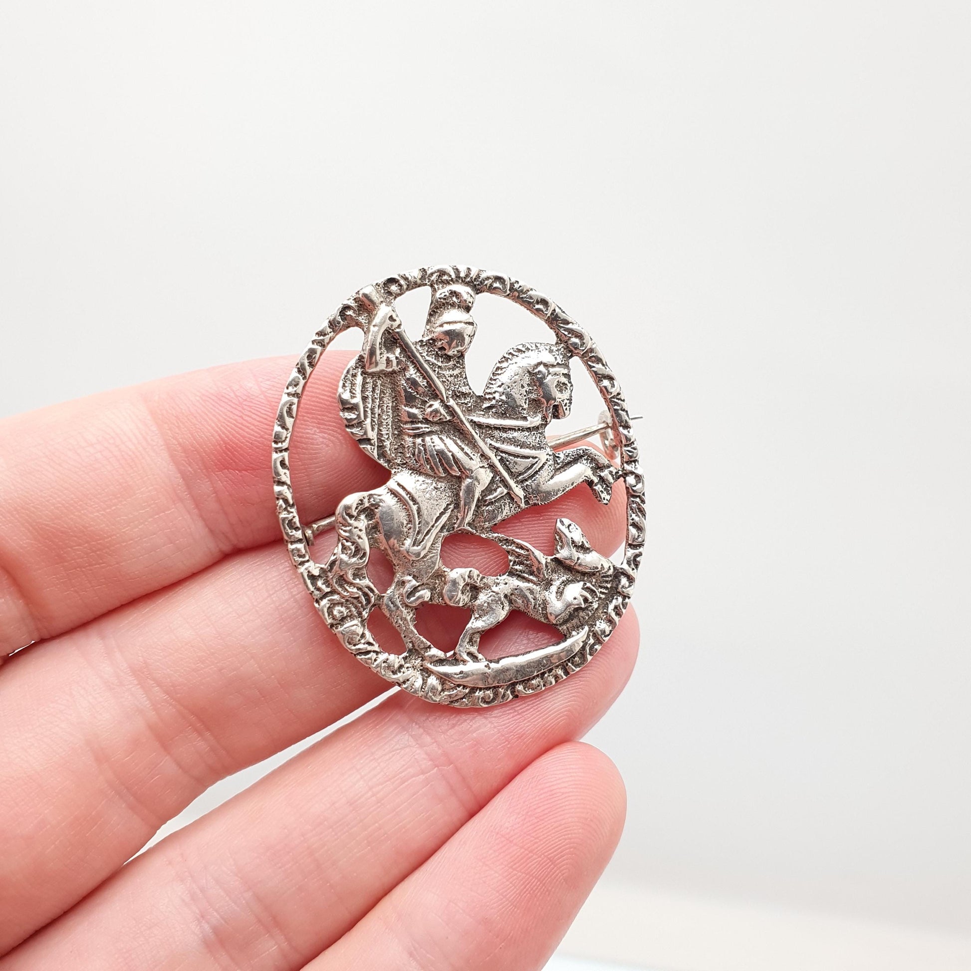 Antique George & Dragon Solid Silver Brooch Early Victorian Possibly Georgian St George Horse Knight Rare Unique Jewelry Womens Jewellery