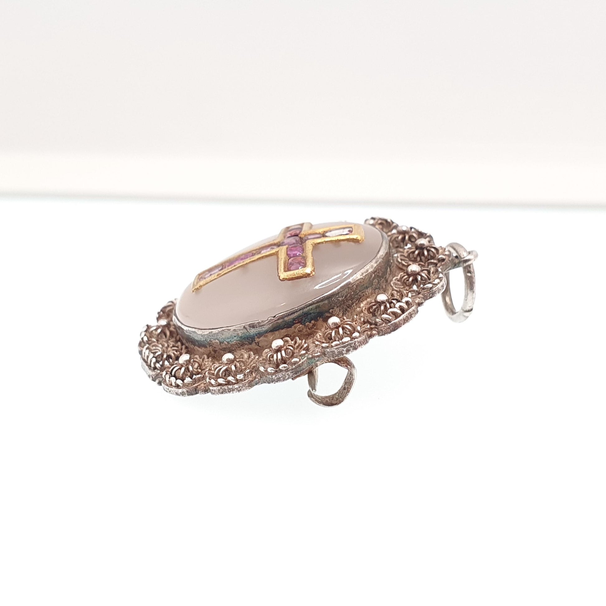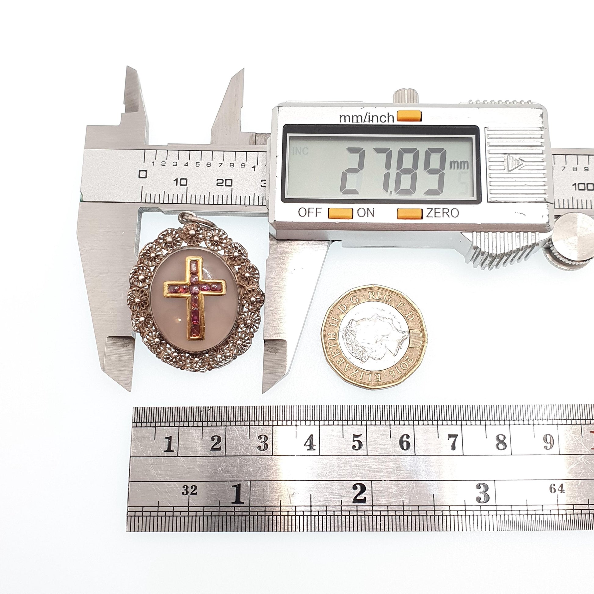 DESCRIPTION: A beautiful antique Georgian solid silver and 18ct gold crucifix brooch, adorned with genuine rubies and white chalcedony. The silver tone metal is solid silver and the gold crucifix is solid 18ct gold. As to be expected with age and use, it isn't stamped/hallmarked, it tests for high grade silver. It weighs approx. 10.16g and the size dimensions are in the later photos. PLEASE NOTE: One of the filigree nipples is missing around the border, see pictures/video.