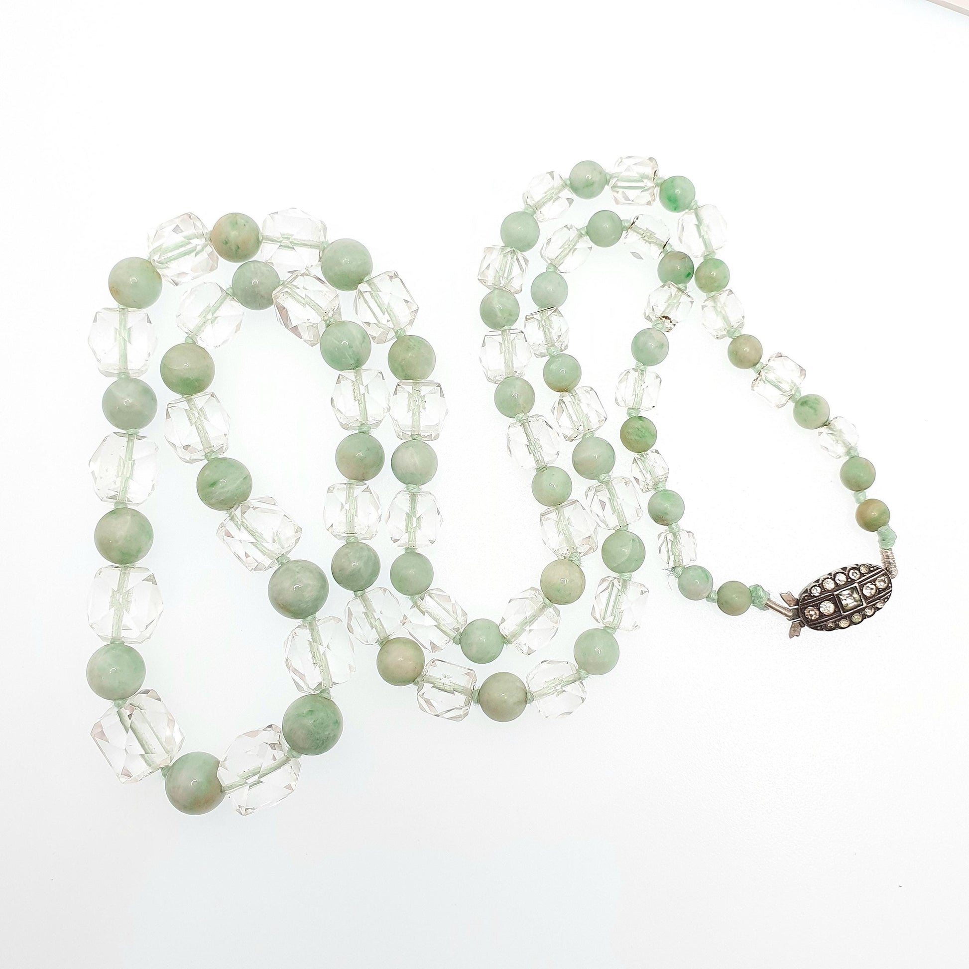 DESCRIPTION: A beautiful and rare genuine authentic art deco genuine jade and rock crystal quartz bead necklace (100% tested), with a solid silver clasp decorated with pastes. The necklace is very long, measuring approx. 73cm or 28.7" in unfastened length. It weighs approx. 68.90g and the size dimensions are in the latter photos. The clasp is stamped "900" for silver. There are minor chips and frays as to be expected with age and use, one of the jade beads has a larger chip (see picture 9).