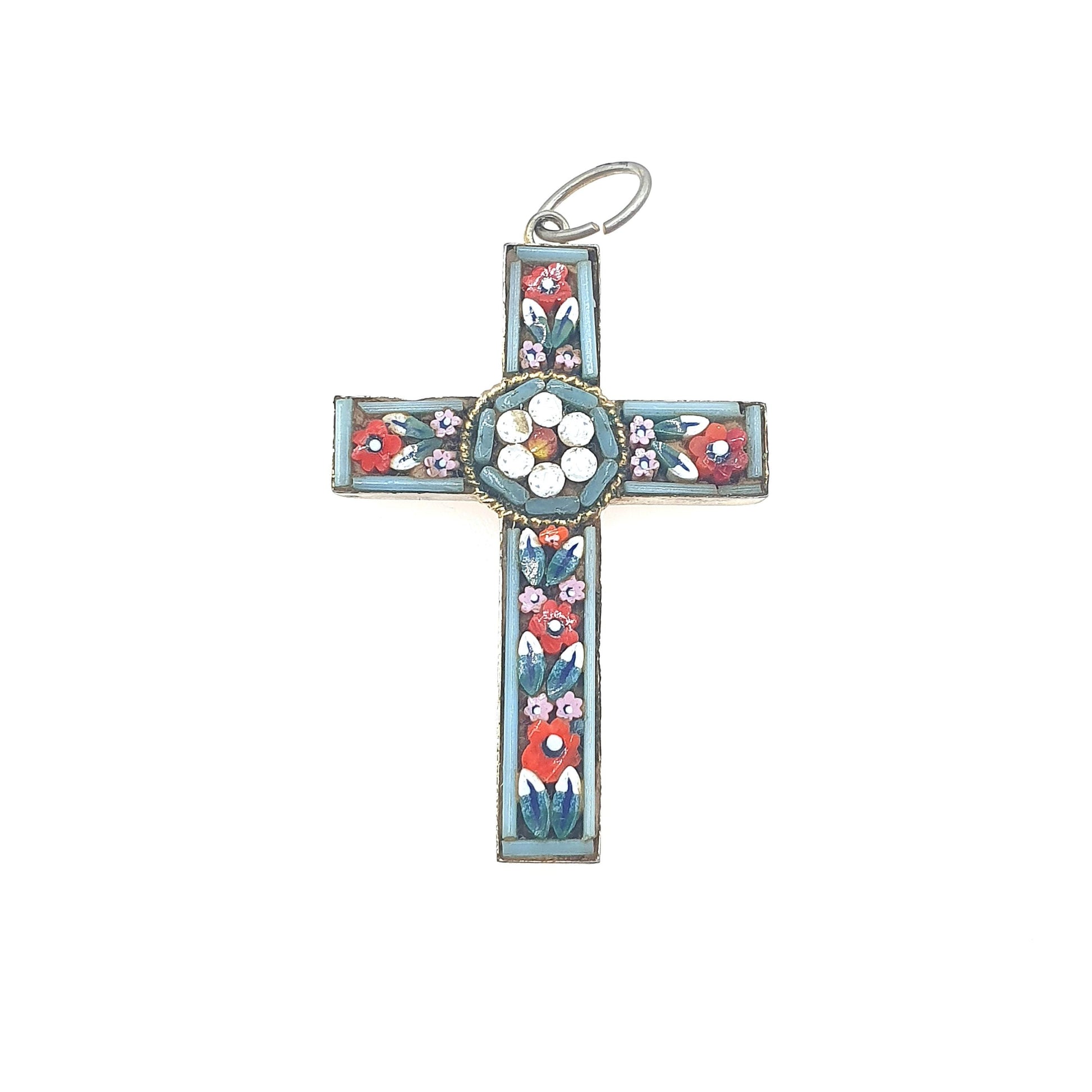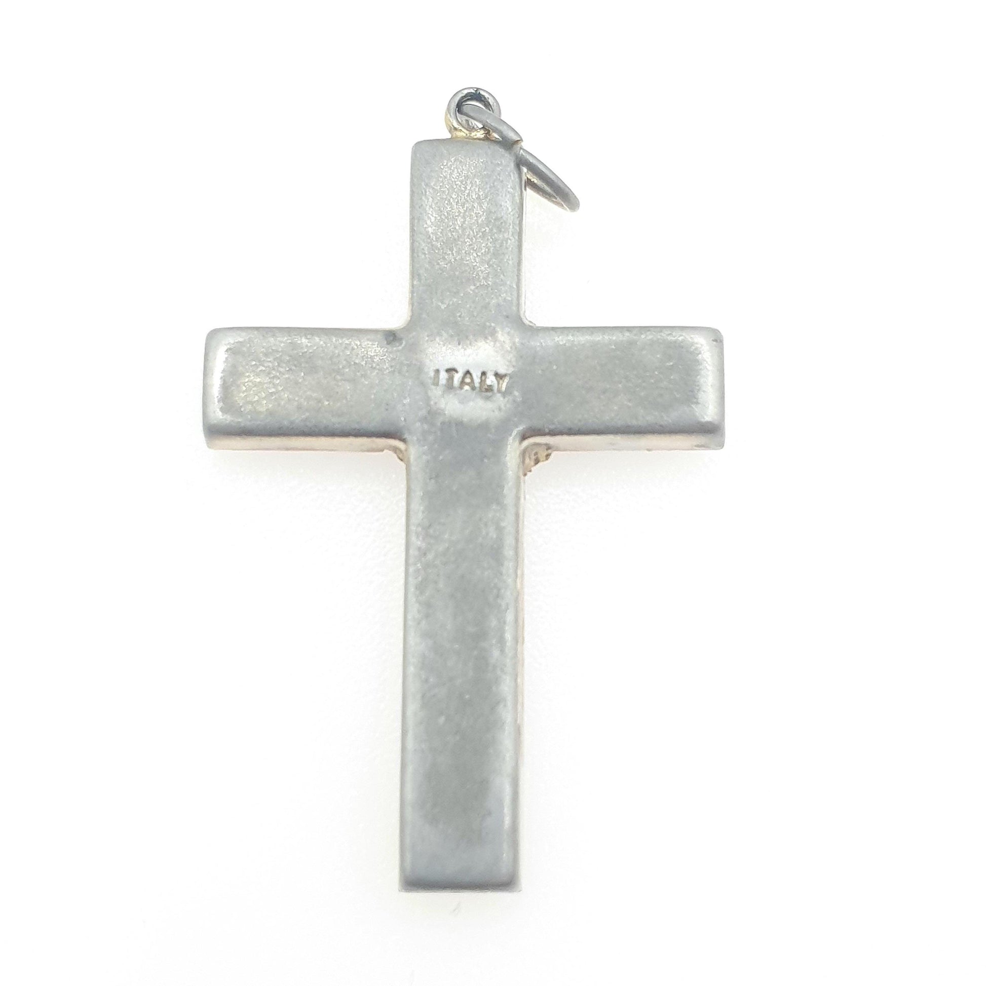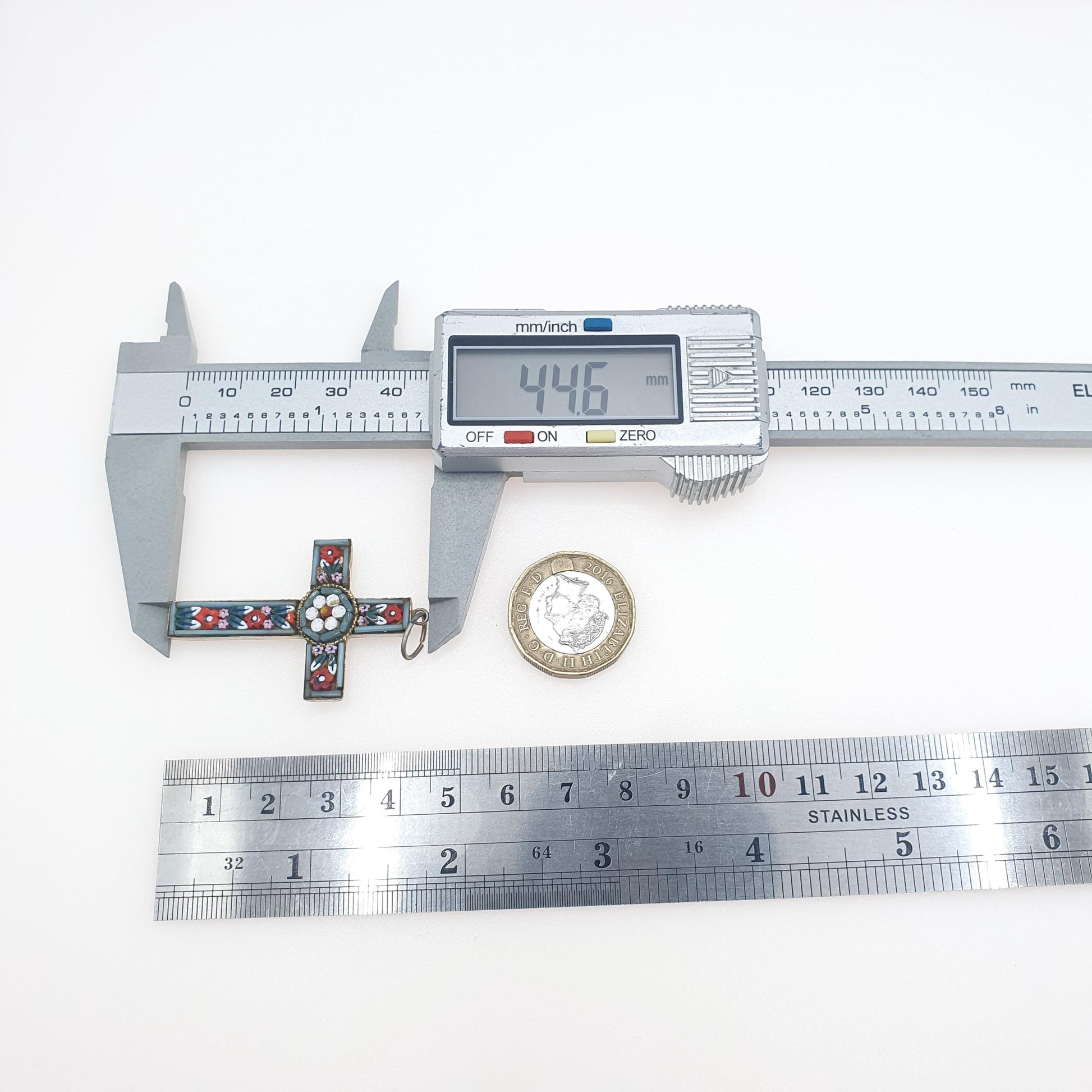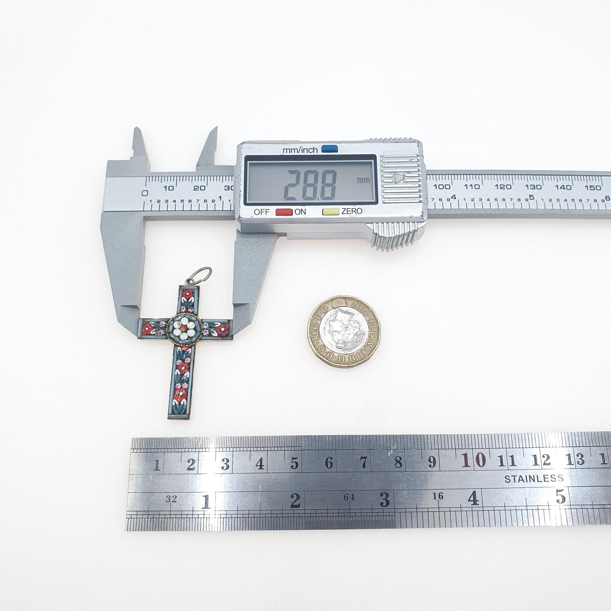 DESCRIPTION: A beautiful and intricate antique micro mosaic crucifix cross pendant. It's made from a silver tone base metal and is stamped 'ITALY'. The item weighs approx. 5.23g and the size dimensions are in the later photos. The item looks like it was original gold plated, this has worn with age, showing the silver tone base metal underneath.