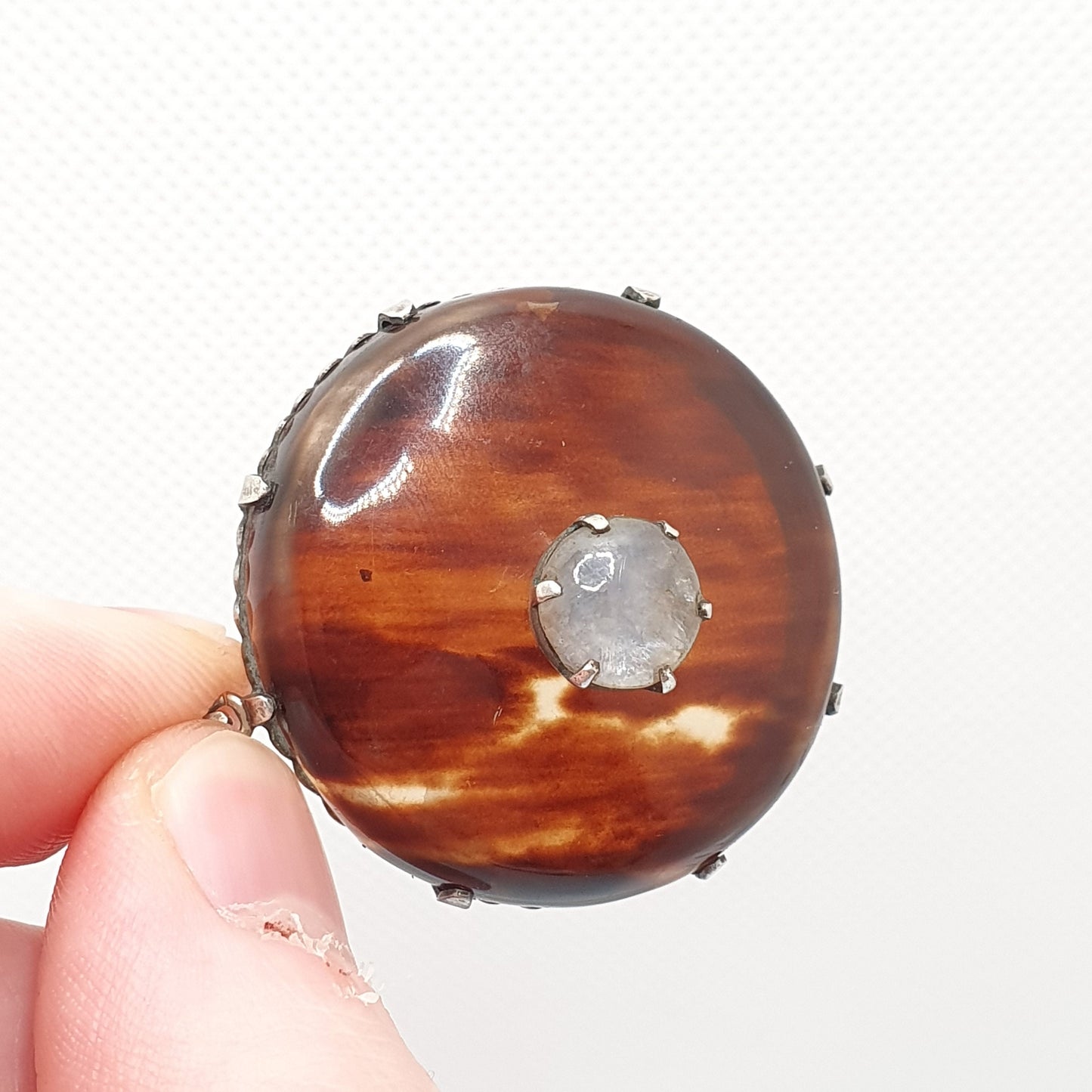 DESCRIPTION: A genuine antique faux pique pendant, adorned with a genuine moonstone. The item is mounted in a silver tone base metal. The item weighs approx. 5.92g and the size dimensions are in the later photos.