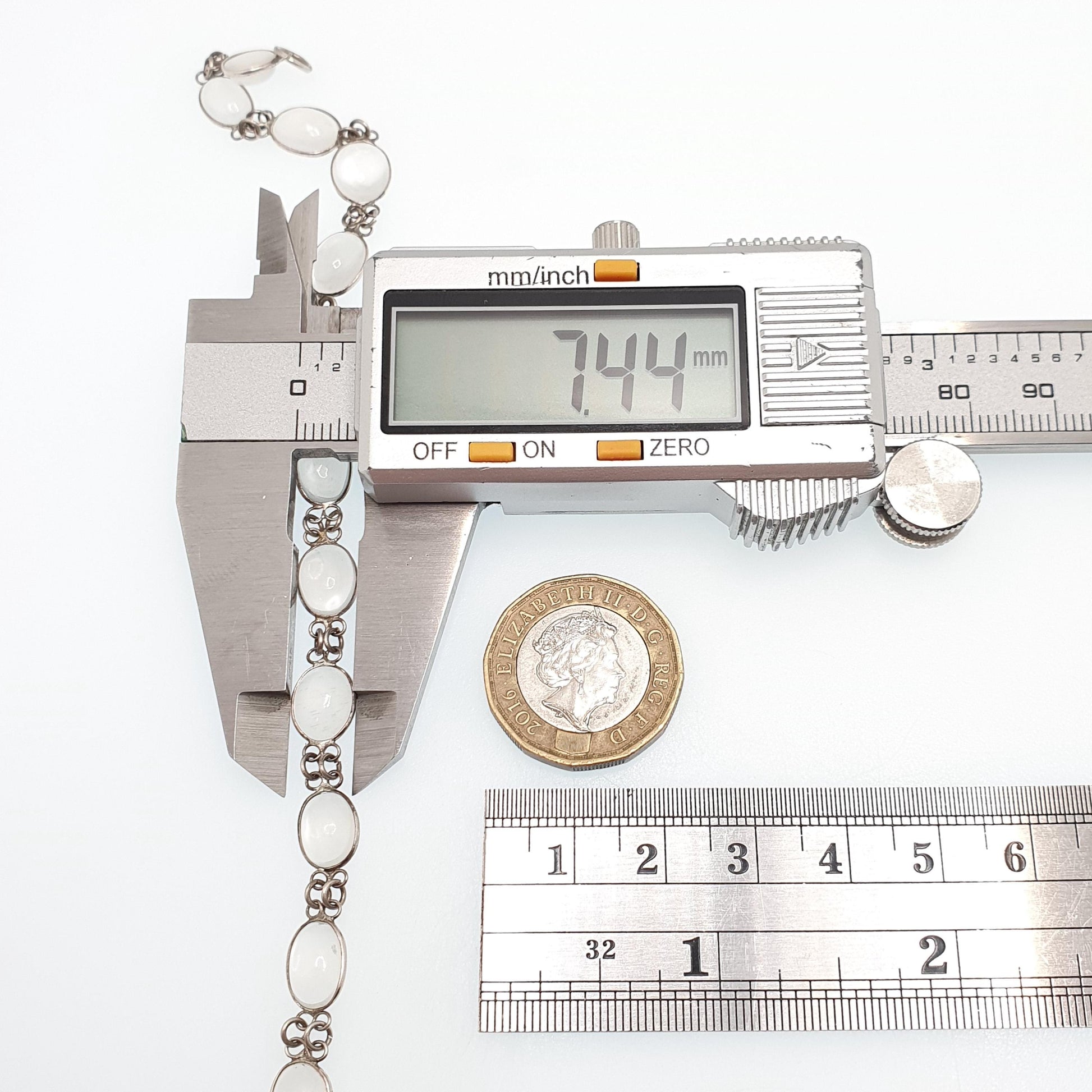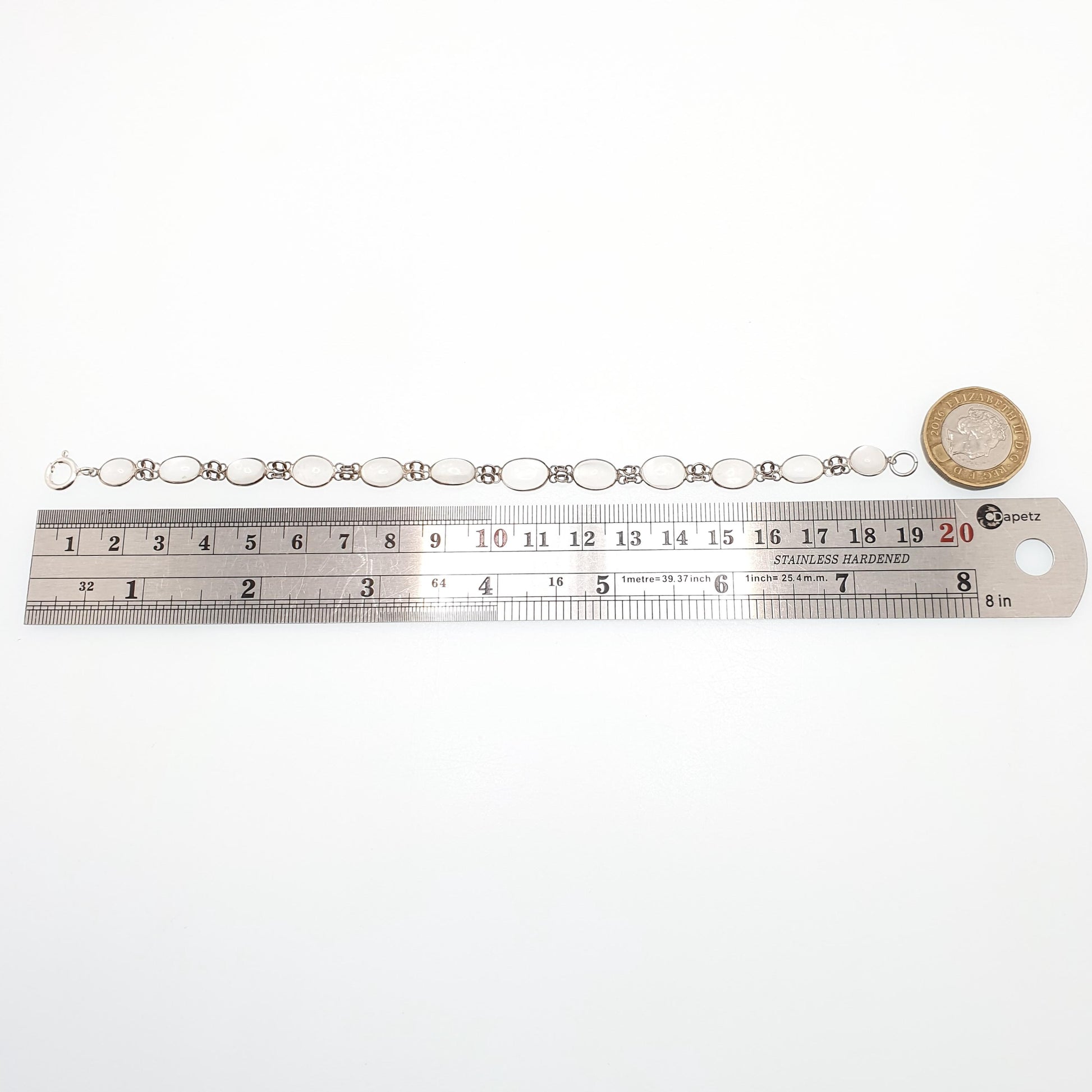 DESCRIPTION: A gorgeous antique solid silver moonstone bracelet. Each moonstone has been hand cut, hand polished and hand set, which was typical of this type of antique jewellery. The bracelet measures approx. 19cm or 7.5" in unfastened length weighs approx. 5.49g. As to be expected with the items age, it isn't stamped/hallmarked, it tests for high grade silver (800+). The clasp is a modern sterling silver replacement.