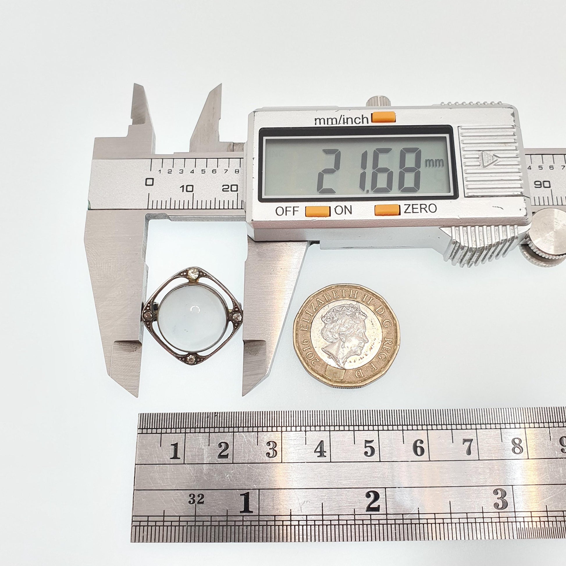 DESCRIPTION: A beautiful and rare antique genuine moonstone sterling silver brooch, adorned with diamond pastes on the border. It weighs approx. 4.48g and the size dimensions are in the later photos. It's stamped "STERLING SILVER". The pastes on the border have darkened with age and the moonstone has some surface marks on it.