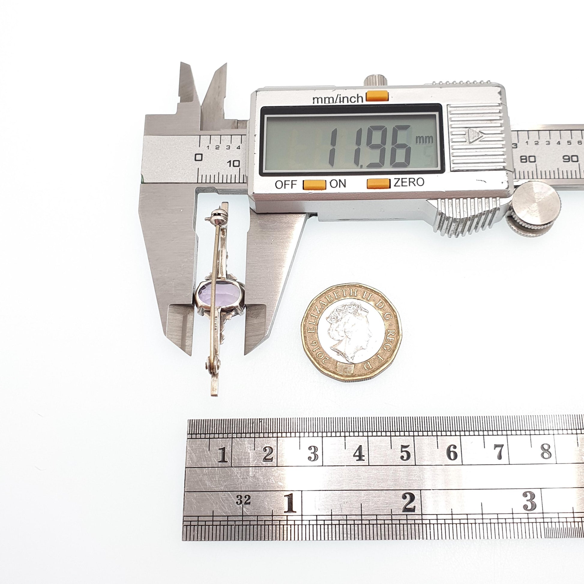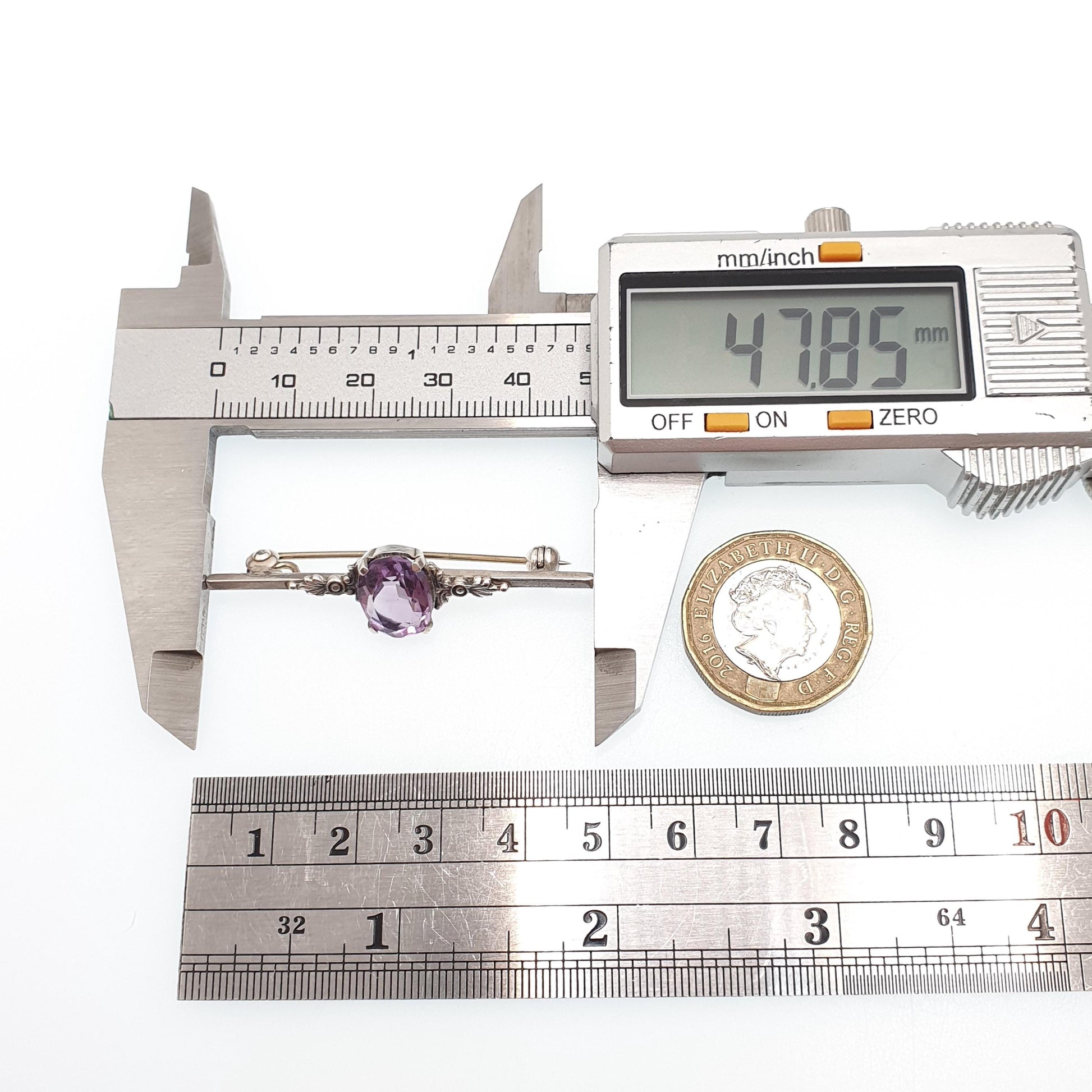 DESCRIPTION: A lovely antique art deco solid silver brooch, adorned with an oval cut amethyst gemstone (100% tested). It weighs approx. 3.97g and the size dimensions are in the later photos. The item is stamped "SILVER".