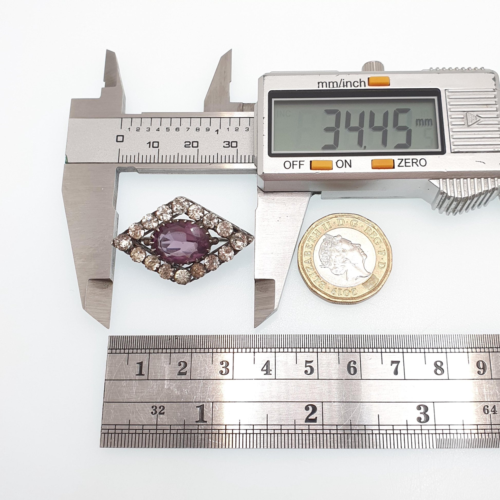 DESCRIPTION: A gorgeous antique Victorian solid silver brooch, adorned with amethyst tone and diamond tone pastes. It weighs approx. 6.26g and the size dimensions are in the later photos. As to be expected with the items age, it isn't stamped/hallmarked, it tests for high grade silver (800+). The amethyst paste is on a bit of an angle, with some marks on the face. Some of the diamond pastes have darkened slightly with age, see pictures/video.