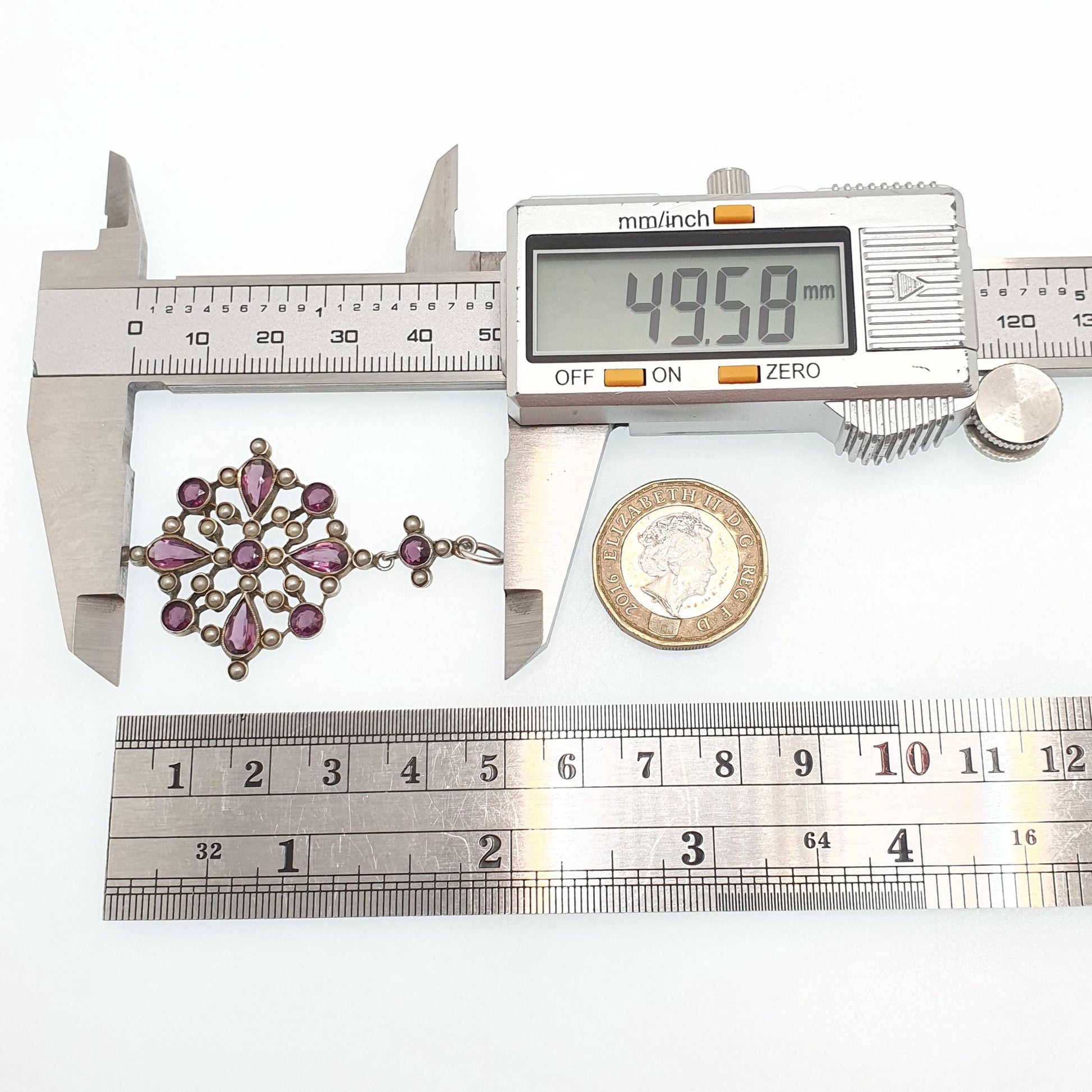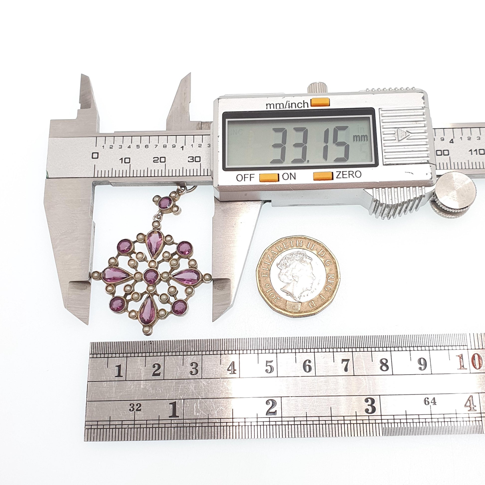 DESCRIPTION: A gorgeous antique Victorian solid silver amethyst tone paste and simulated seed pearl pendant. The item is large in size and has been handmade. It weighs approx. 6.18g and the size dimensions are in the later photos. It's stamped "900" on the rear for silver. There is a small amount of the border around the central paste missing, see pictures/video.