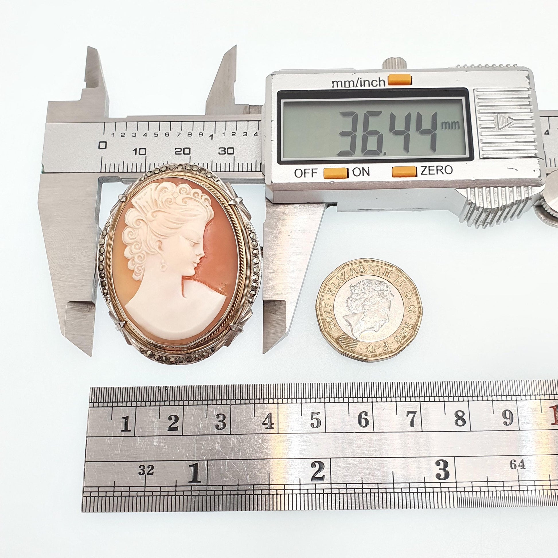 DESCRIPTION: A large and heavy 1920s antique solid silver cameo brooch, decorated with marcasites. The cameo is nicely detailed and has been hand carved from shell. The frame is stamped "800" and the item weighs approx. 15.89g. The size dimensions are in the later photos. The safety clasp functions but catches a little on rotation.