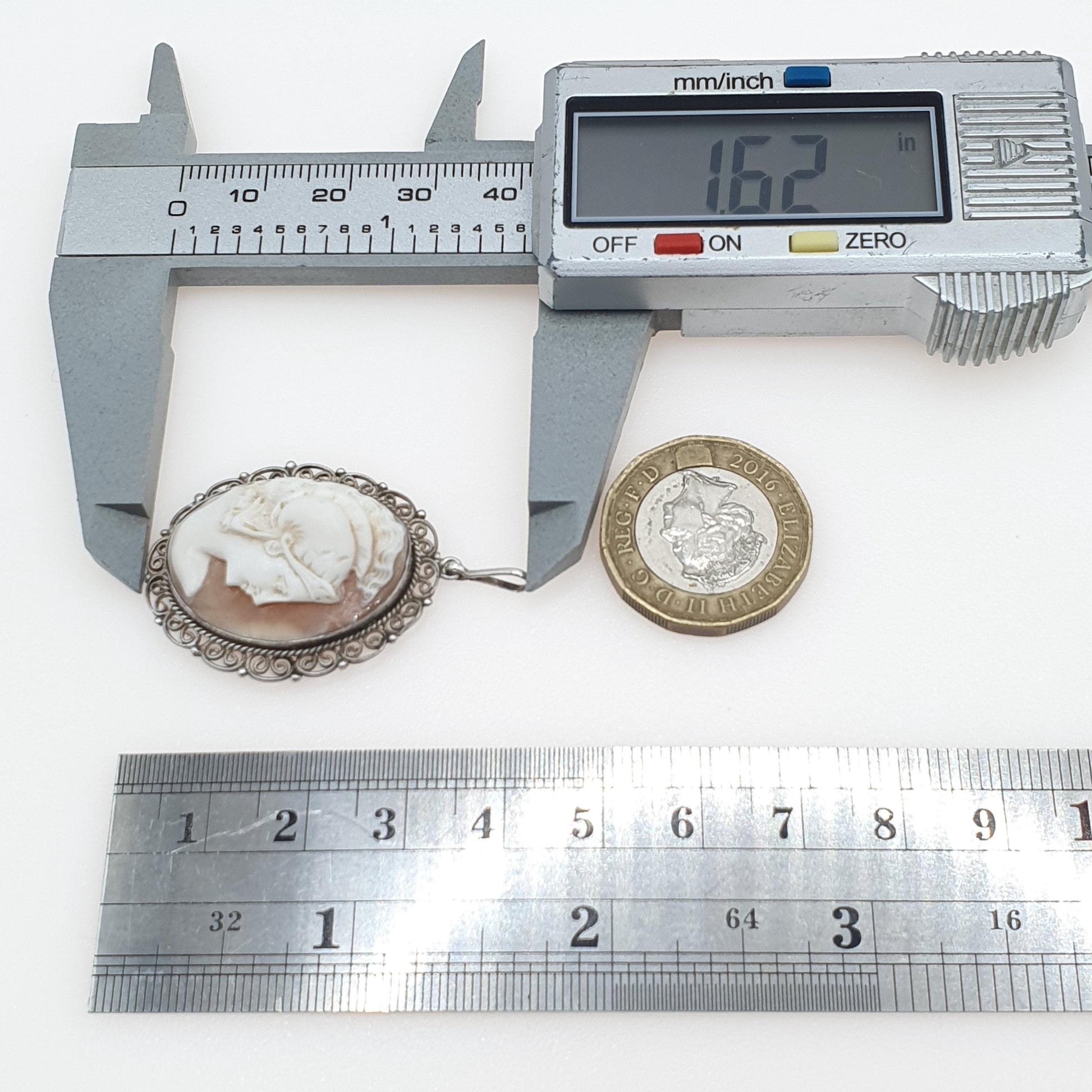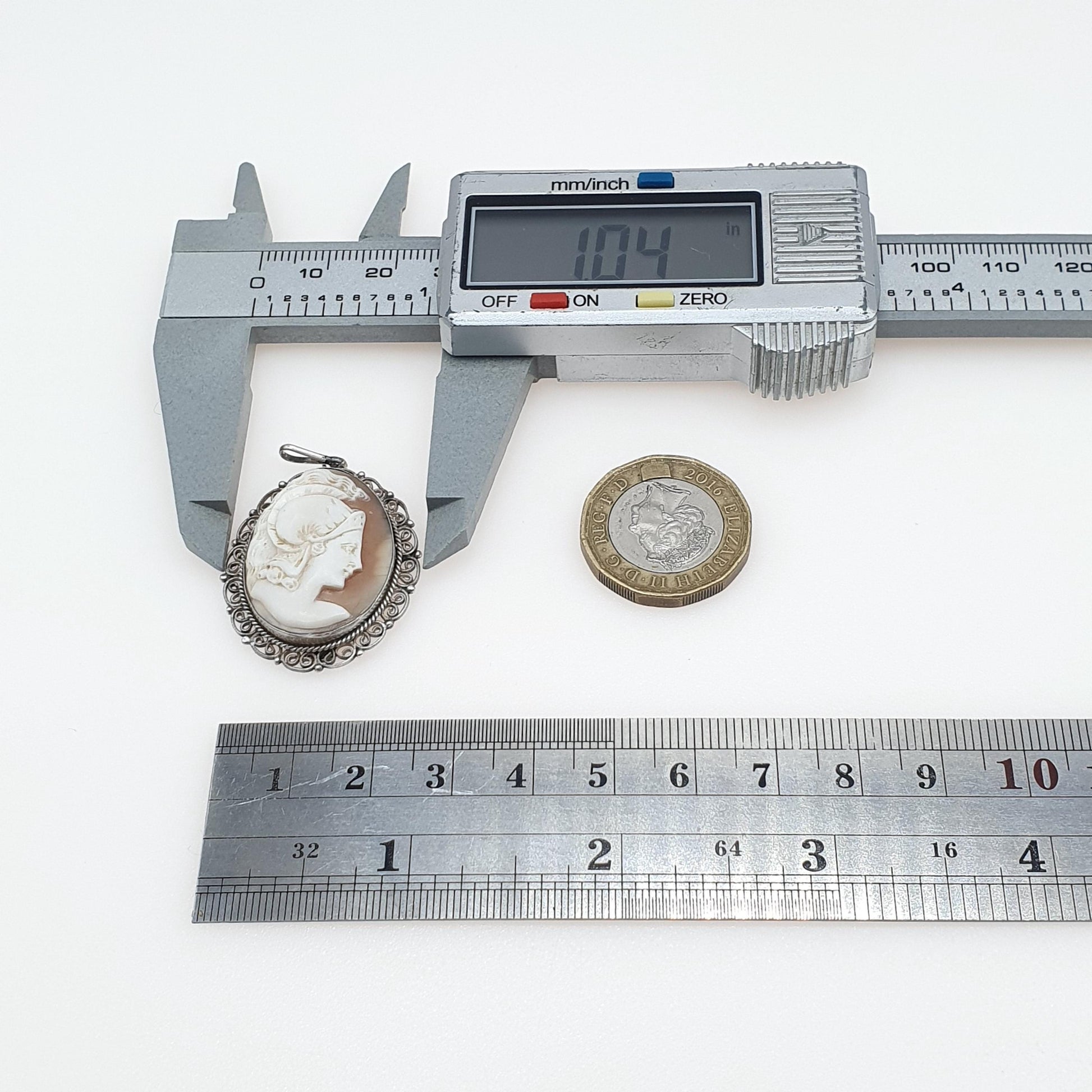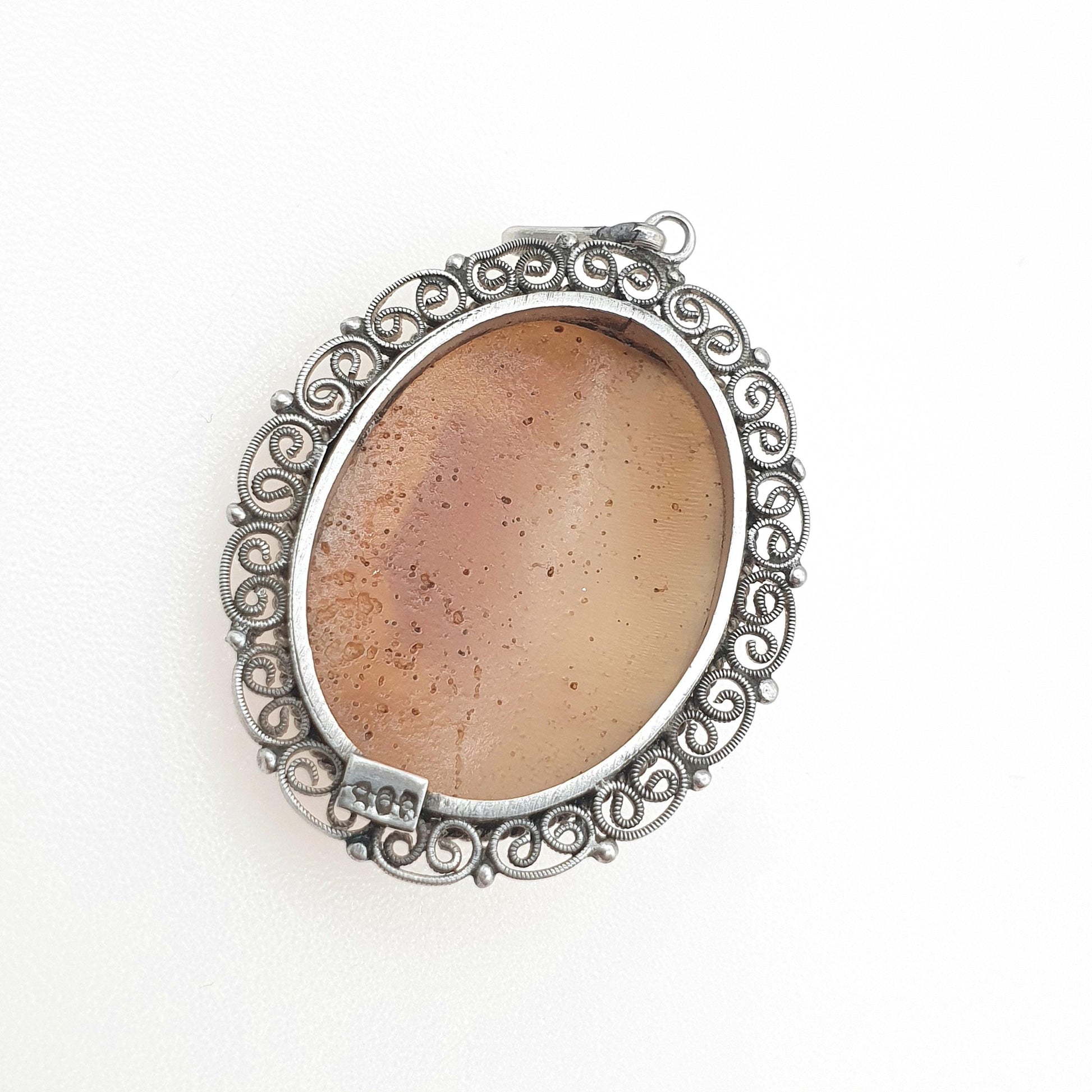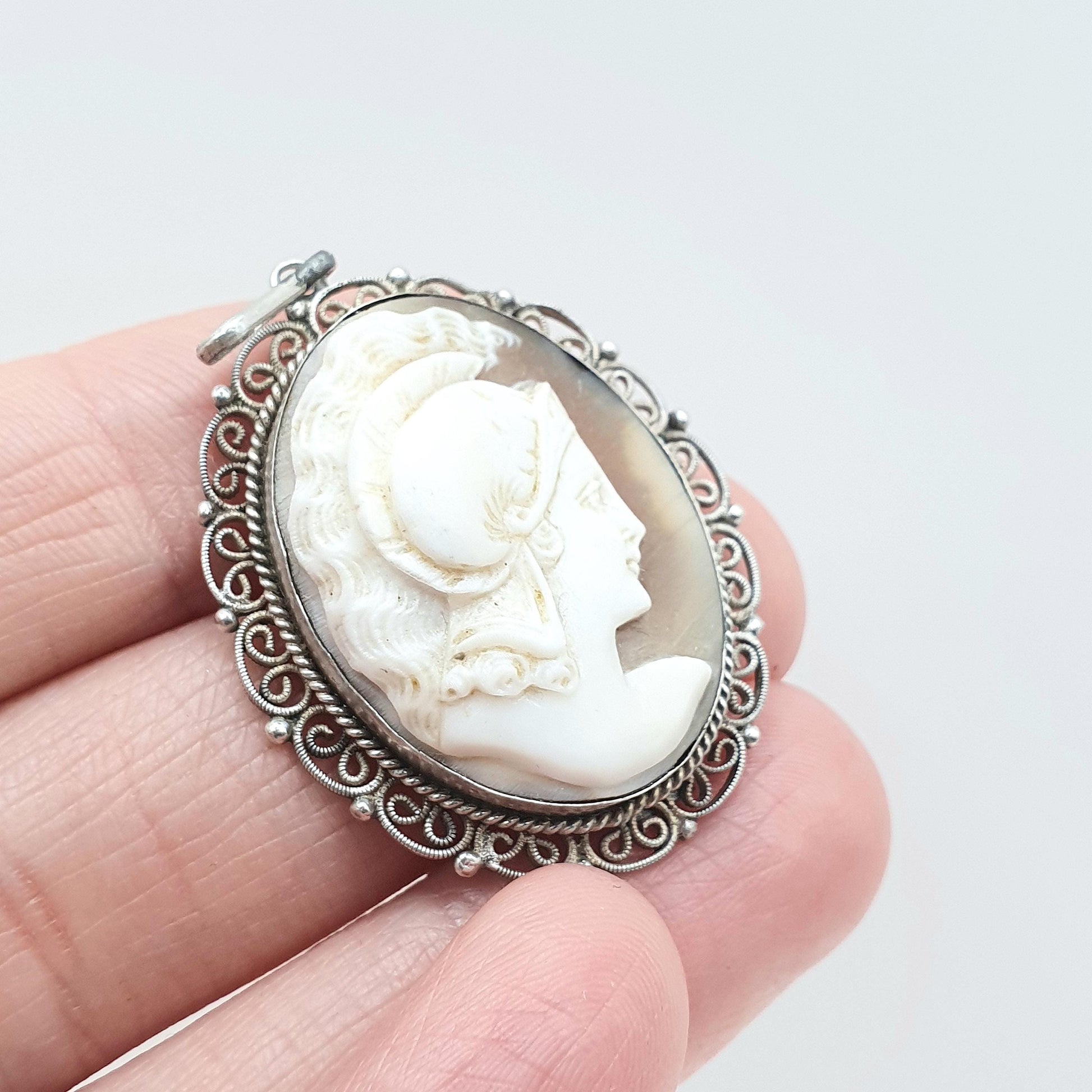 DESCRIPTION: A beautiful antique Roman centurion cameo pendant, mounted in solid silver and decorated with a filigree border. The cameo is genuine hand carved shell and has good detail. The item weighs approx. 4.91g and the size dimensions are in the latter photos. It's stamped "800" for solid silver.