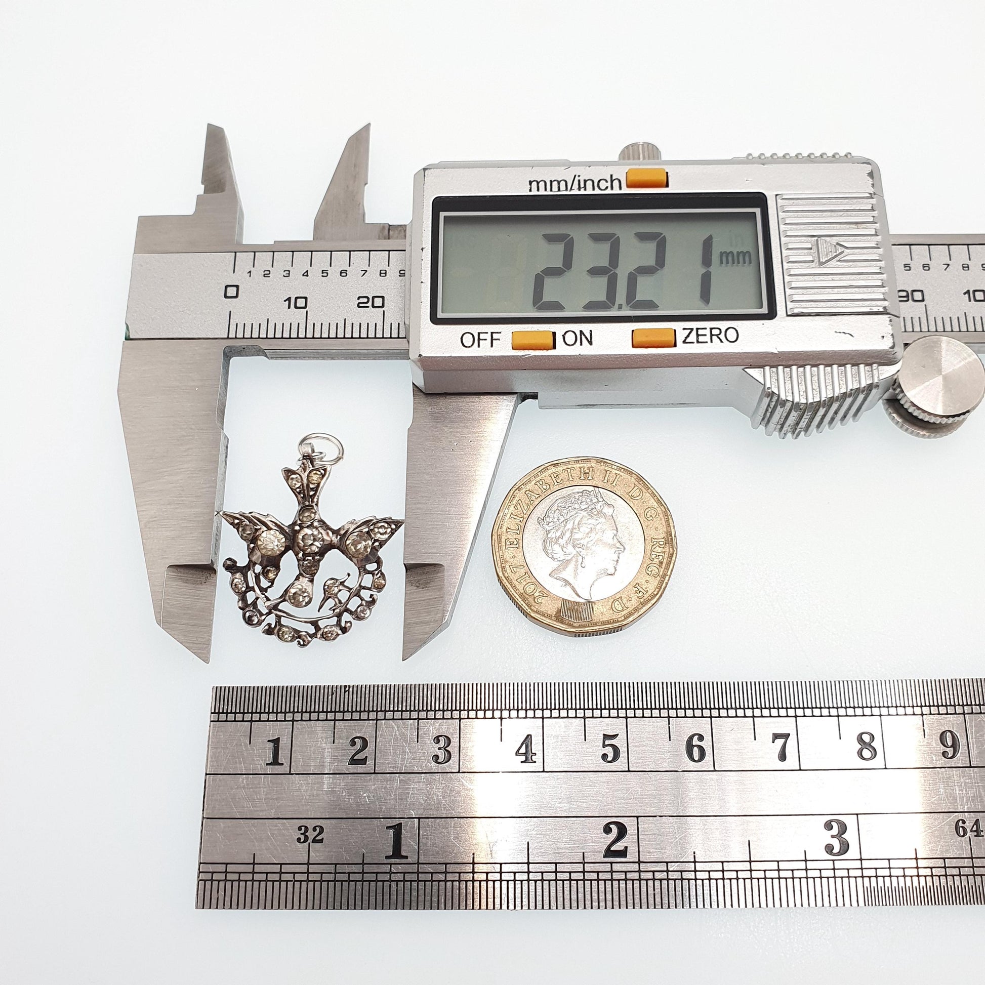 DESCRIPTION: A stunning antique Georgian solid silver bird pendant/brooch, adorned with numerous foiled pastes. The item isn't stamped/hallmarked but tests for high grade silver. It weighs approx. 3.10g and the size dimensions are in the later photos. The pastes have darkened with age and use, see pictures/video. The jump rings are modern sterling silver.