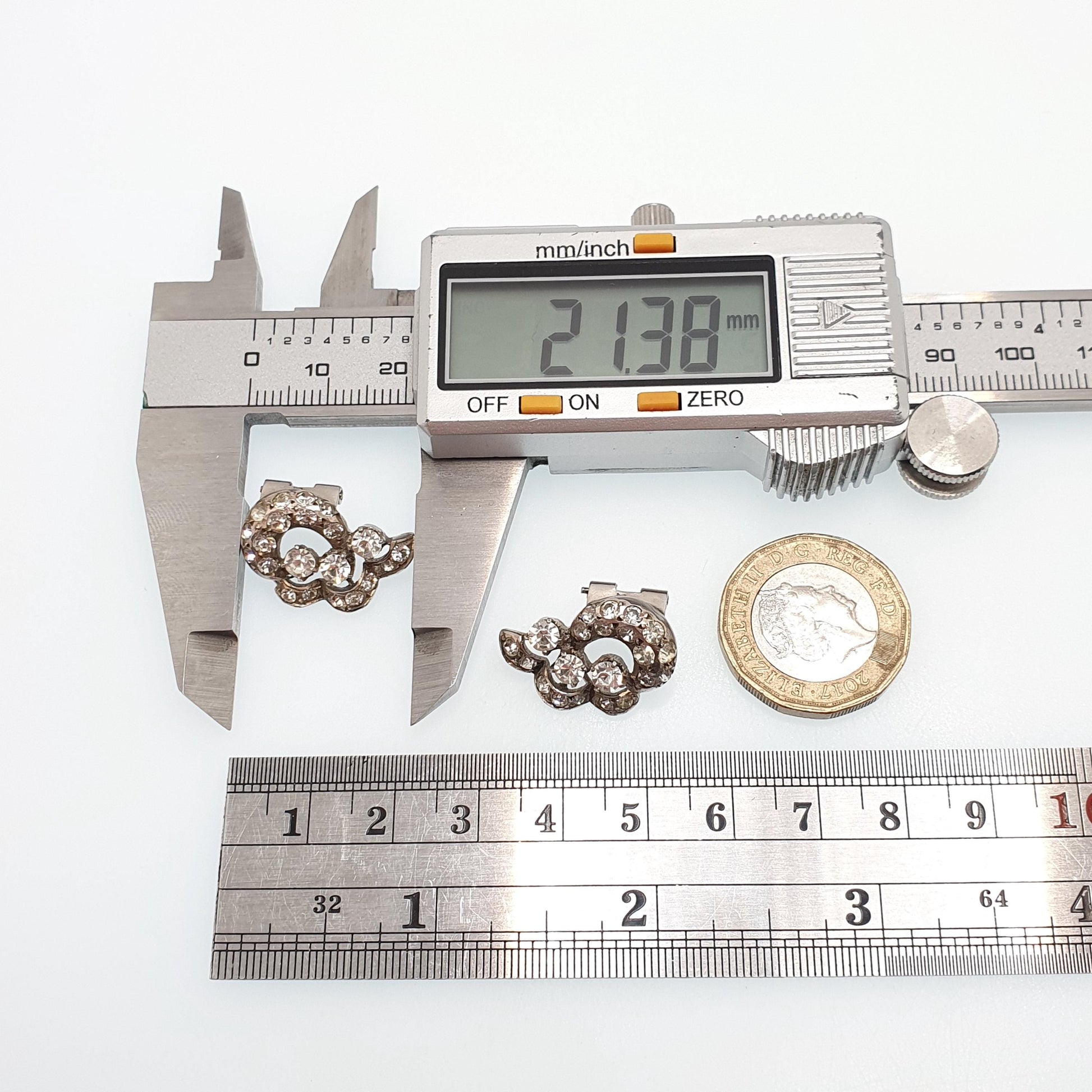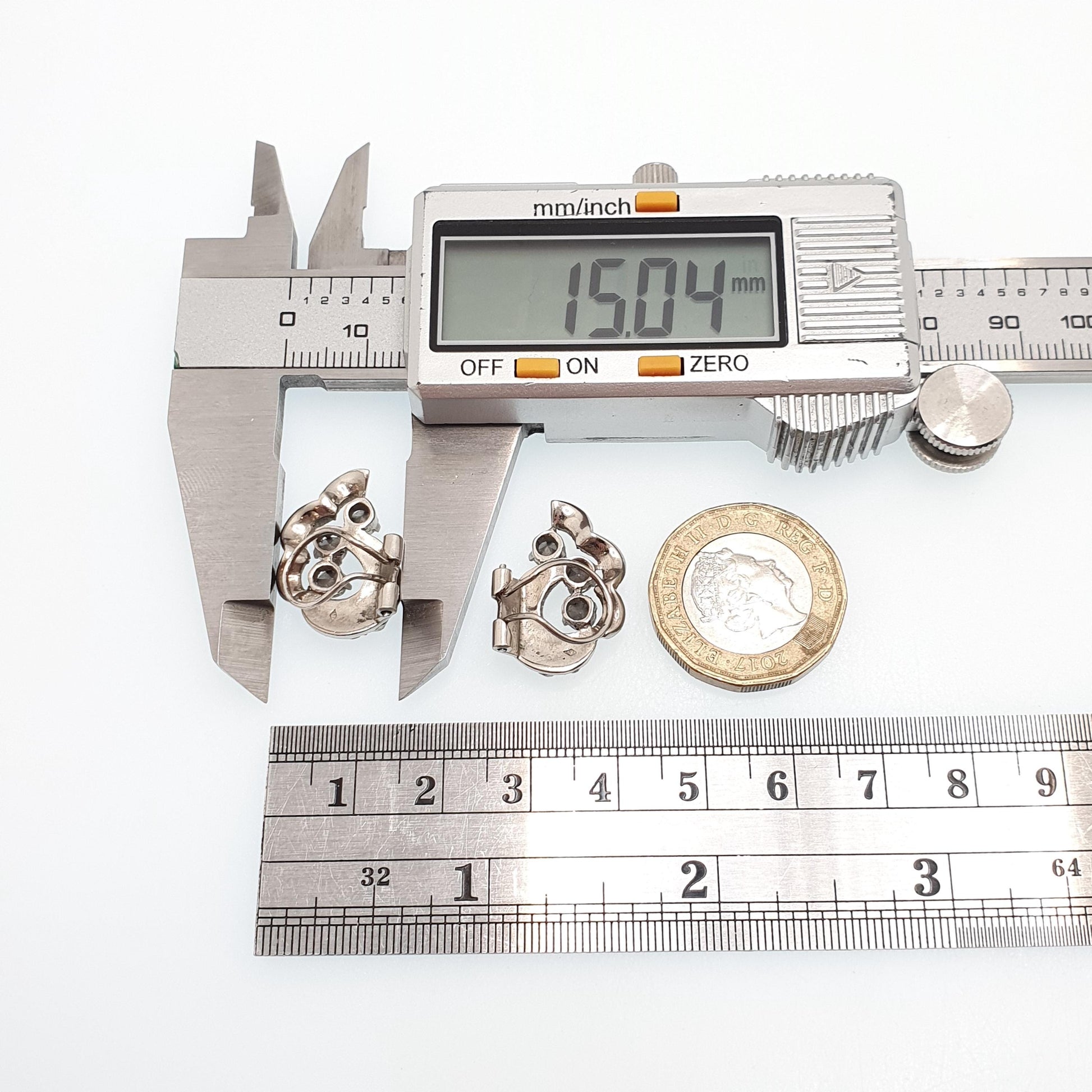 DESCRIPTION: A beautiful pair of antique art deco (c1920s) solid silver diamond paste earrings. The earrings are clip on and open/close tightly. They're in good condition and have a nice sparkle for their age. The total combined weight is approx. 7.50g and the size dimensions are in the later photos. They're stamped with French silver hallmarks.