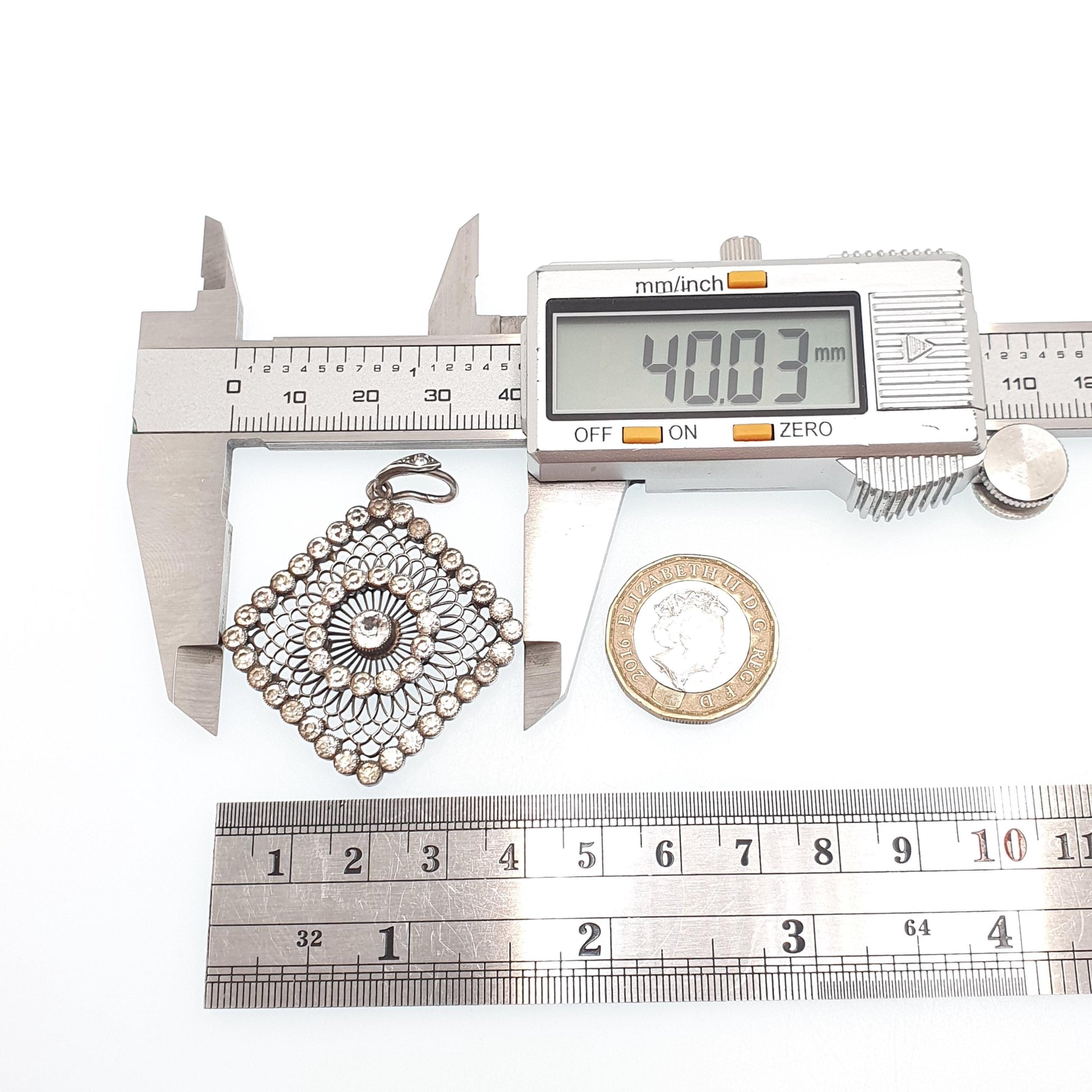 DESCRIPTION: A large and stunning antique solid silver dreamcatcher style pendant, adorned with diamond tone pastes. The item weighs approx. 6.82g and the size dimensions are in the later photos. As to be expected with the items age, it isn't stamped/hallmarked, it tests for high grade silver (800+). Some of the pastes have darkened with age and use, see pictures.