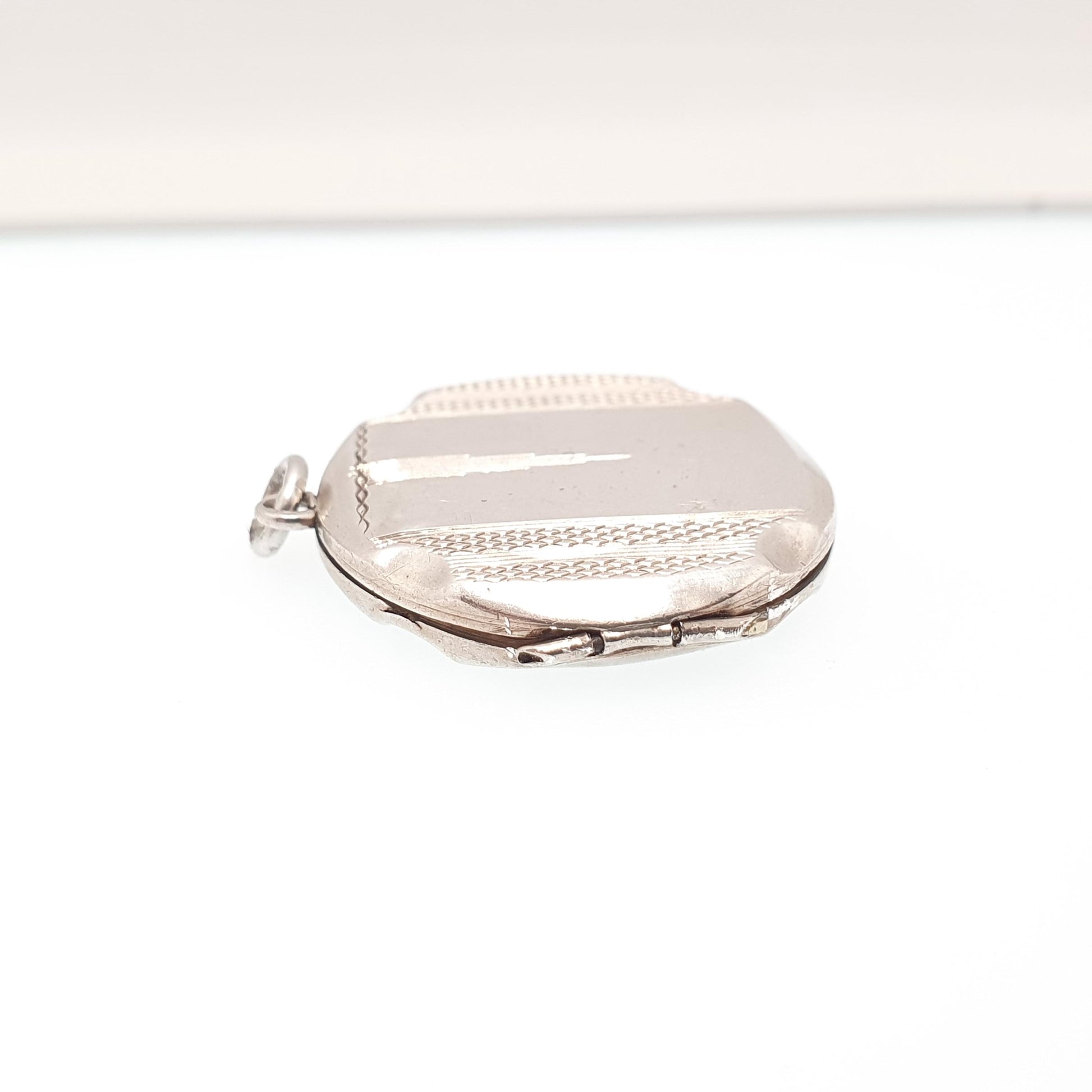 DESCRIPTION: A beautiful antique 1920s art deco solid silver locket, with a geometric pattern on the face. The locket clicks shut. It's stamped "SILVER", weighs approx. 5.16g and the size dimensions are in the later photos. The item has some dents on the faces (see pictures/video). There is a small gap in the seam near the hinge.
