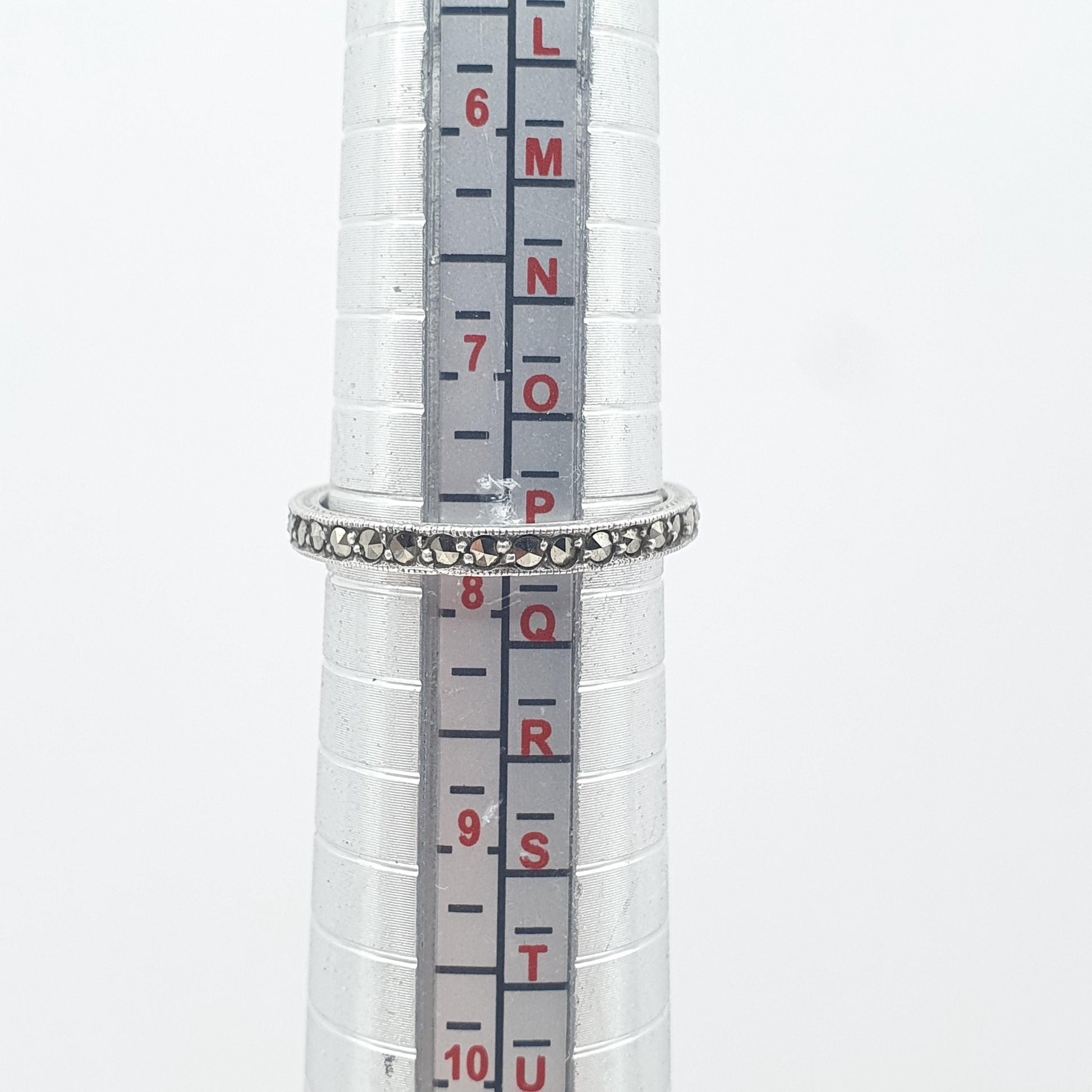 DESCRIPTION: A superb antique 1920s solid silver marcasite eternity band ring. The ring sizes at approx.UK P or US 7.75 and weighs approx. 2.06g. The ring is stamped "SIL" on the inside.