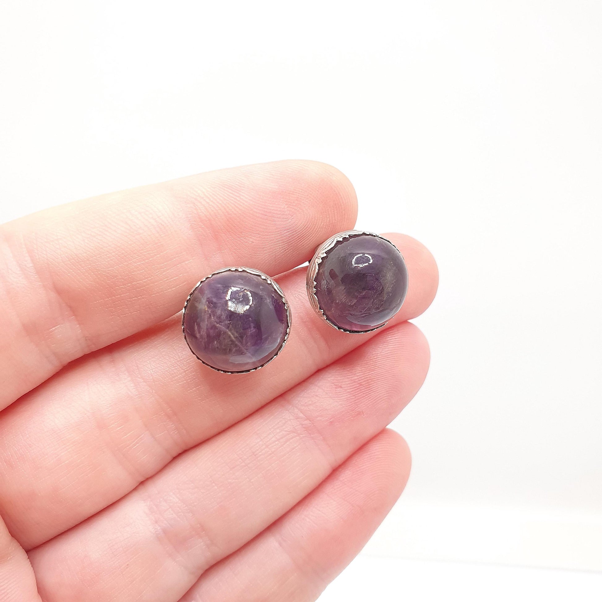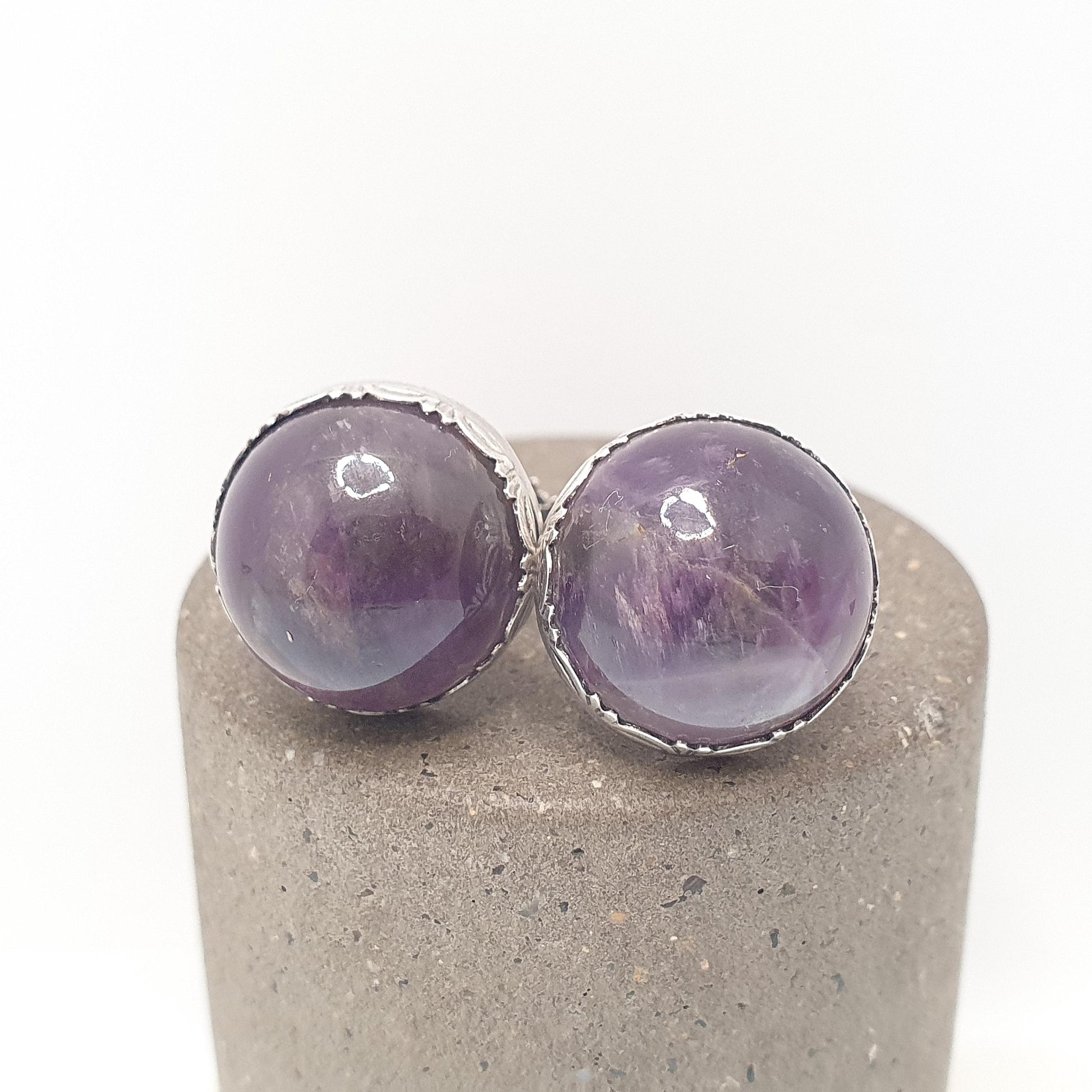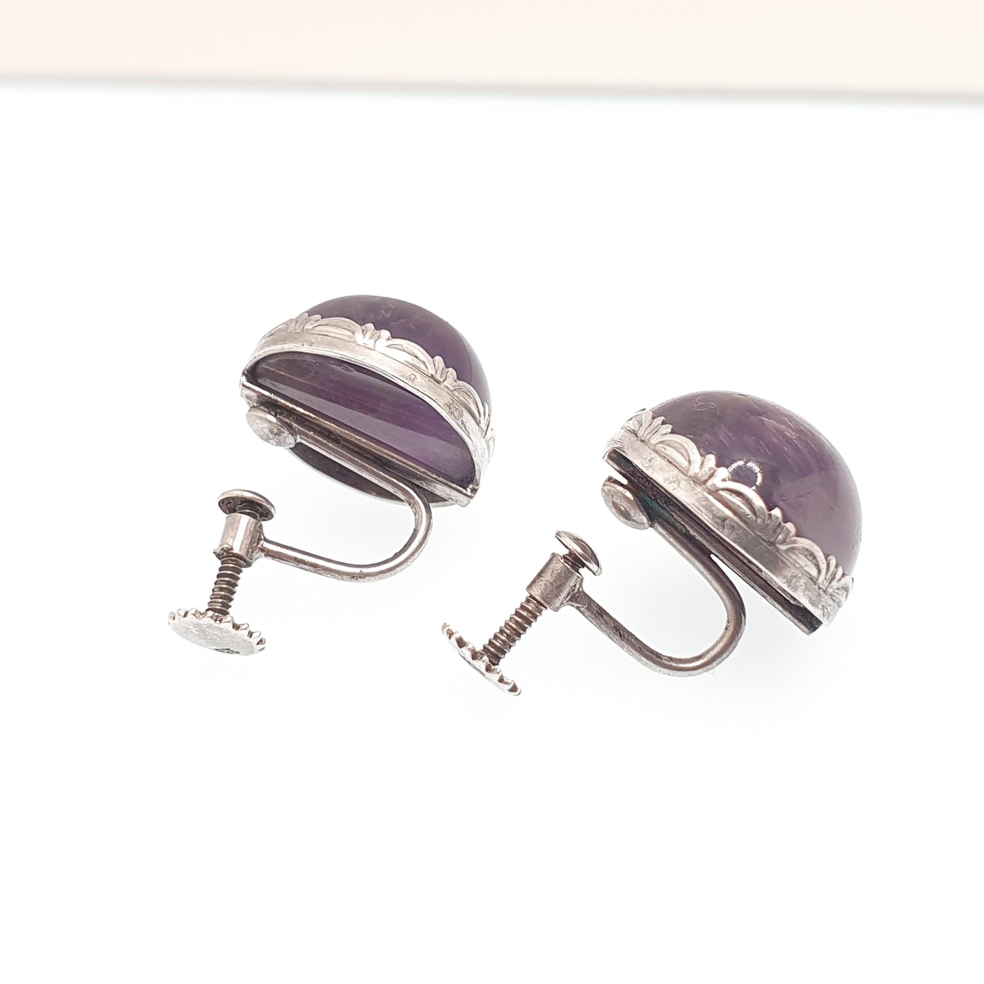 Antique Solid Silver Natural Amethyst Earrings Large Gemstone Cabochon Arts and Crafts Genuine Quartz Womens Ladies Jewelry