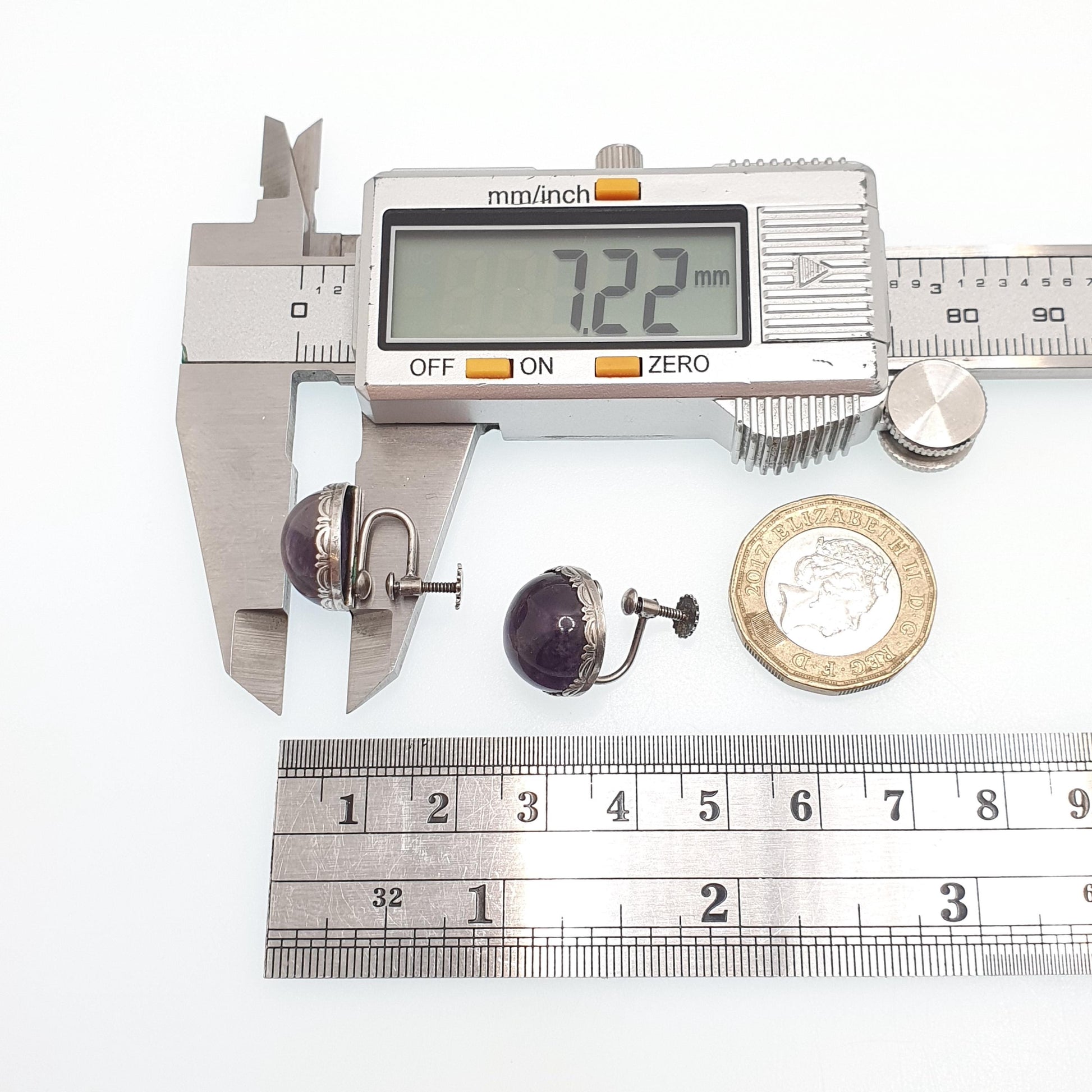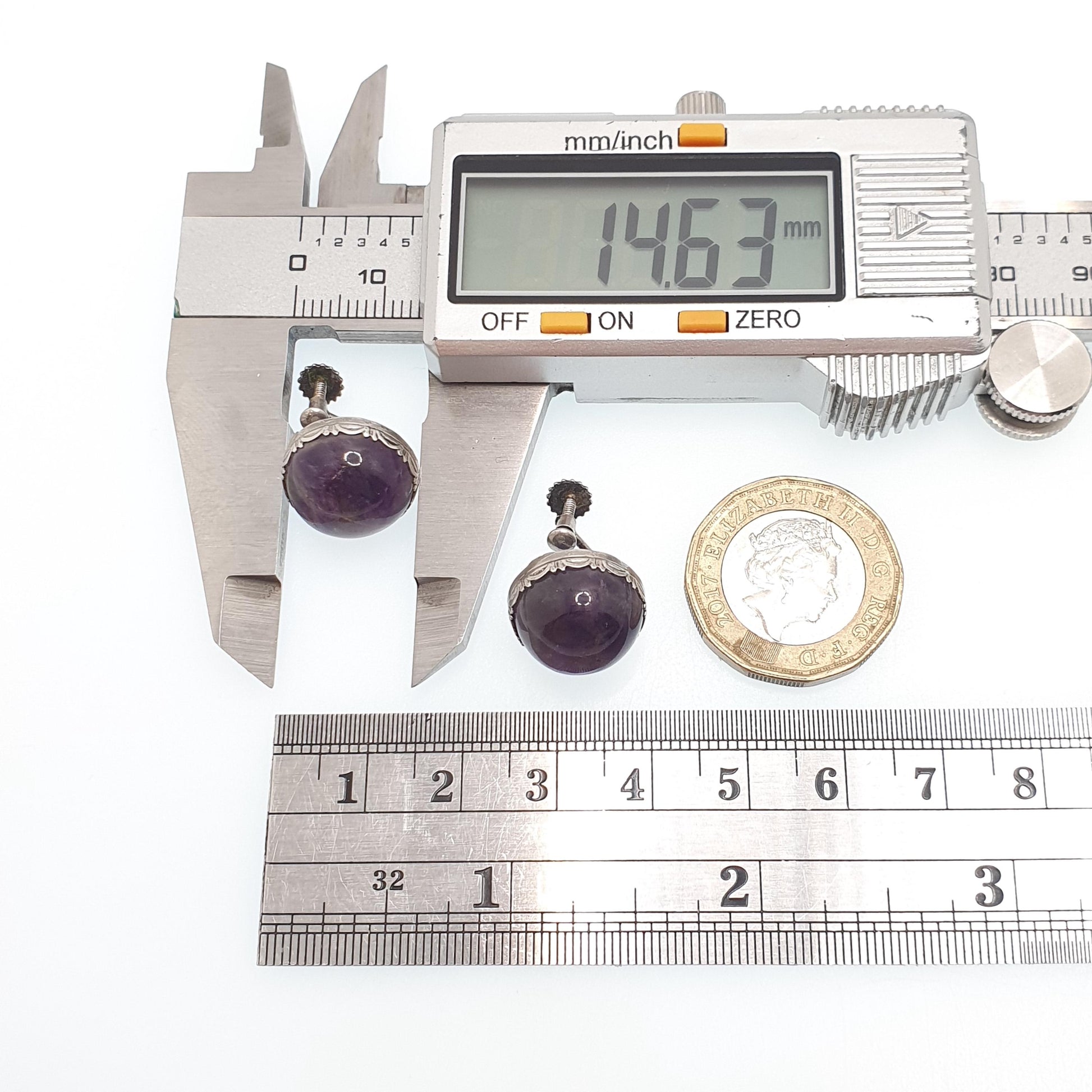 DESCRIPTION: A stunning pair of antique solid silver natural amethyst earrings. The earrings has an arts and crafts style and are screw back. The screws open/close well and are stamped "935" for silver. The earrings weigh a combined total of approx. 5.70g and the size dimensions are in the later photos.