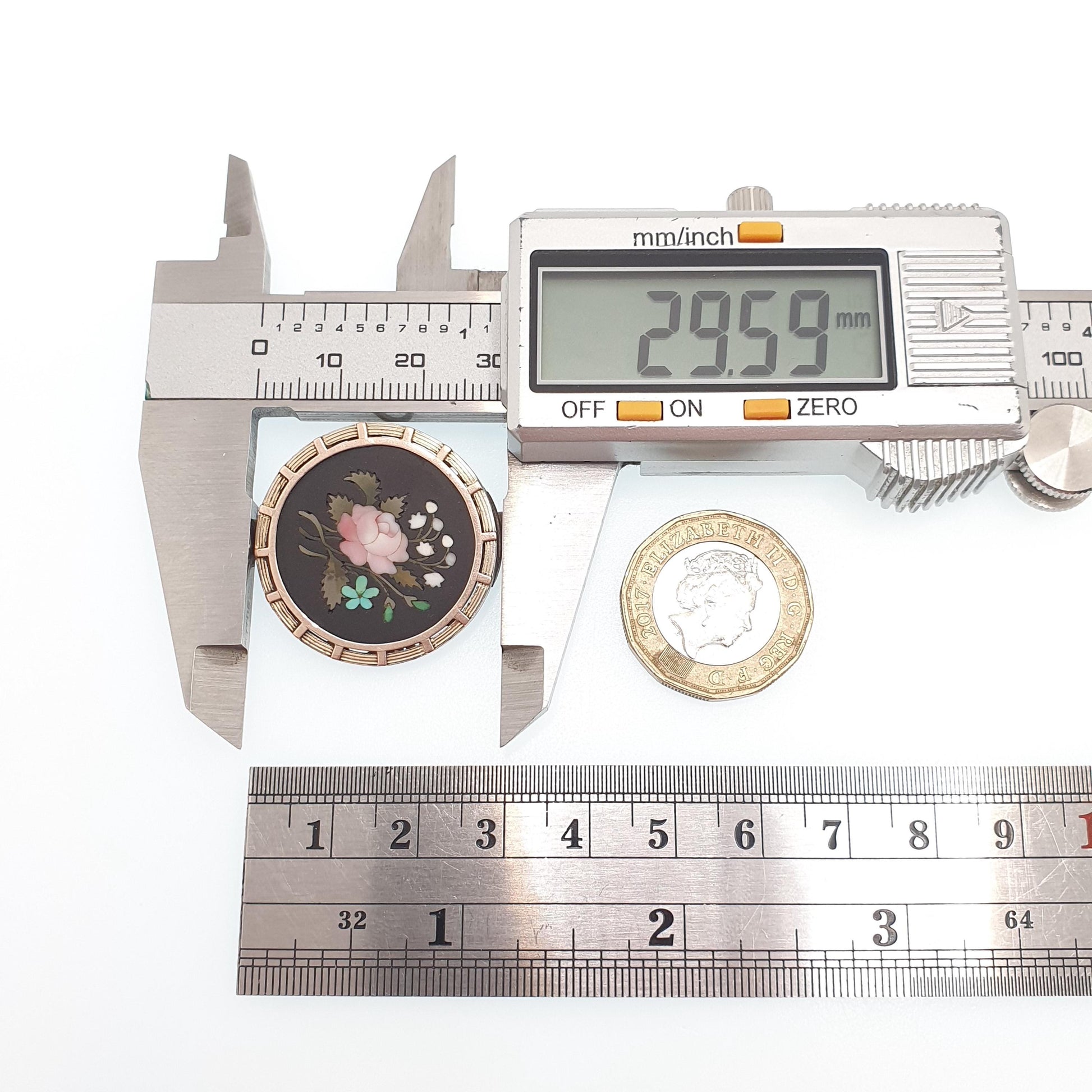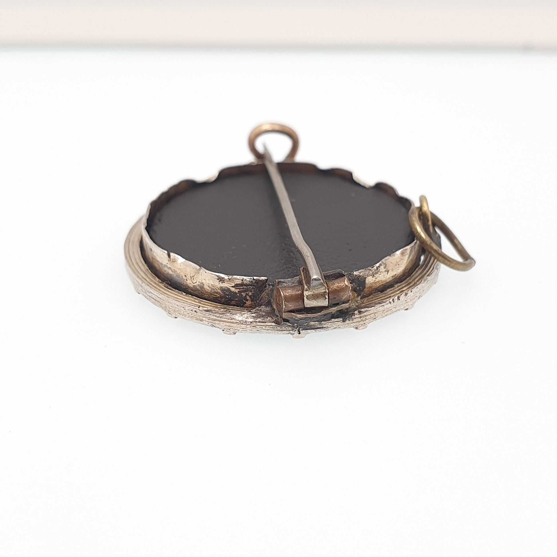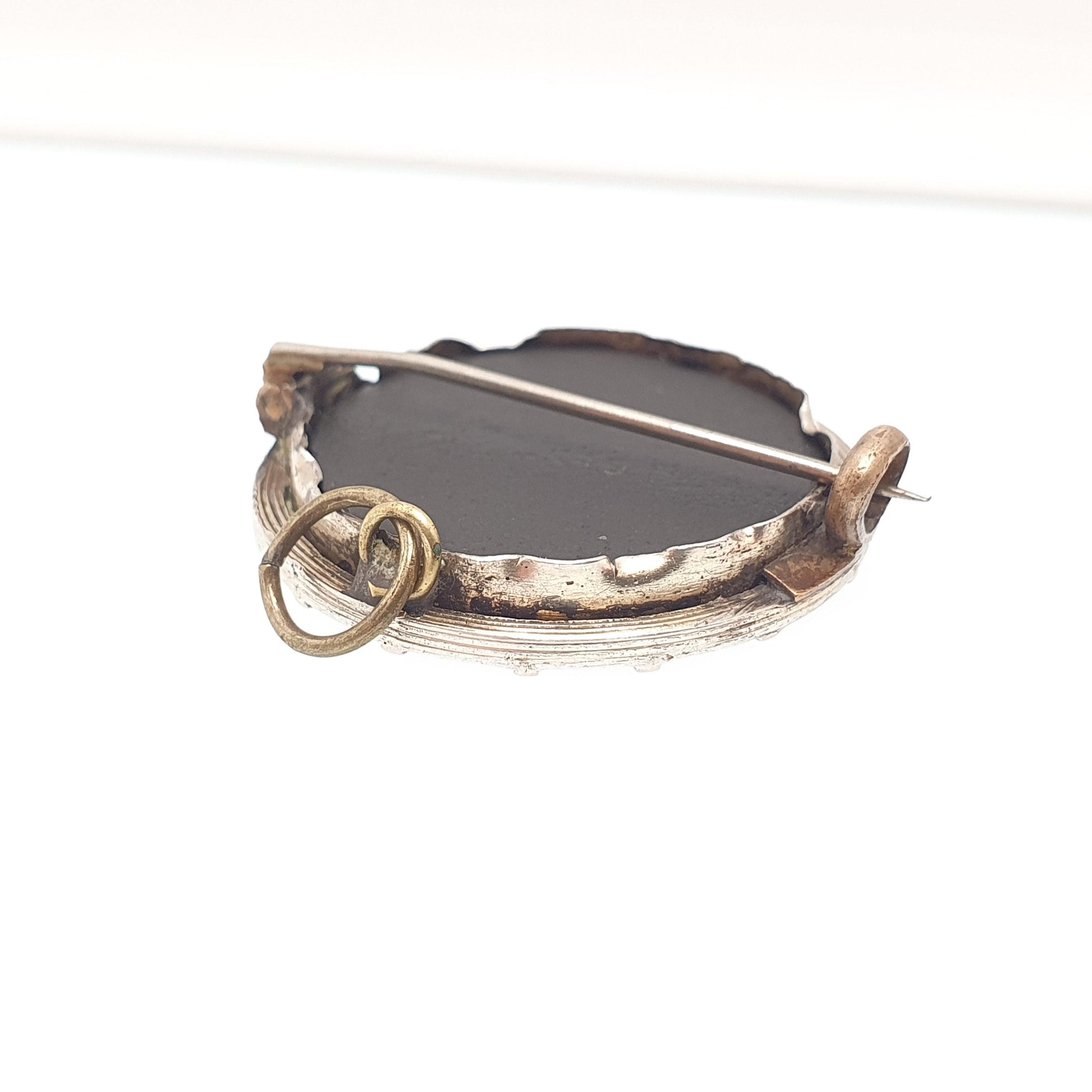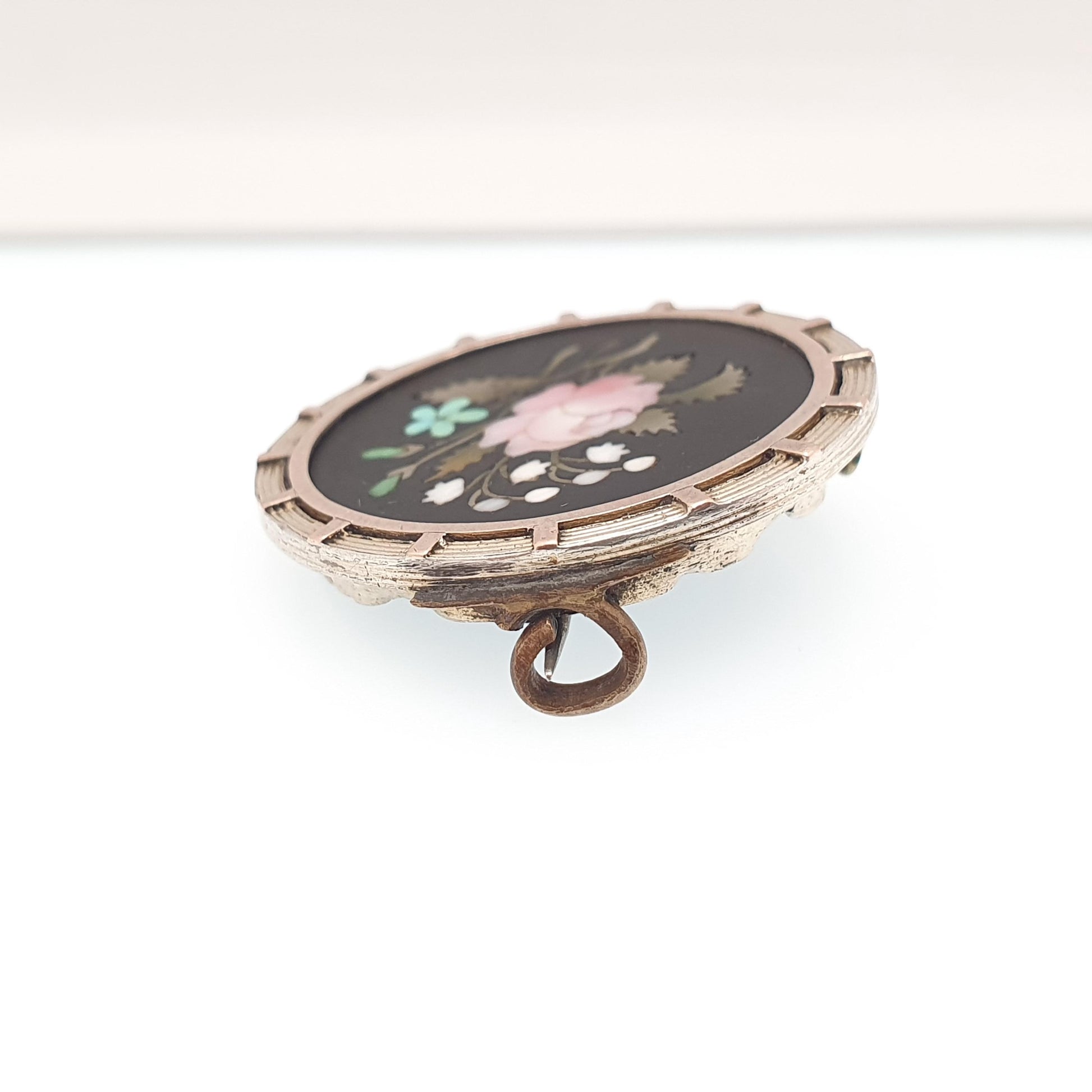 DESCRIPTION: A lovely antique Victorian pietra dura brooch, mounted in a solid silver frame with a gold vermeil finish. The brooch has has nice detail to it, there are some minor chips in areas and a deep scratch on the black hardstone backing, but apart from that the pietra dura isn't in bad shape. As to be expected with the items age, it isn't stamped/hallmarked, it tests for high grade silver (800+). The item has had some old lead repairs to the clasp, hinge and bail (see pictures/video).