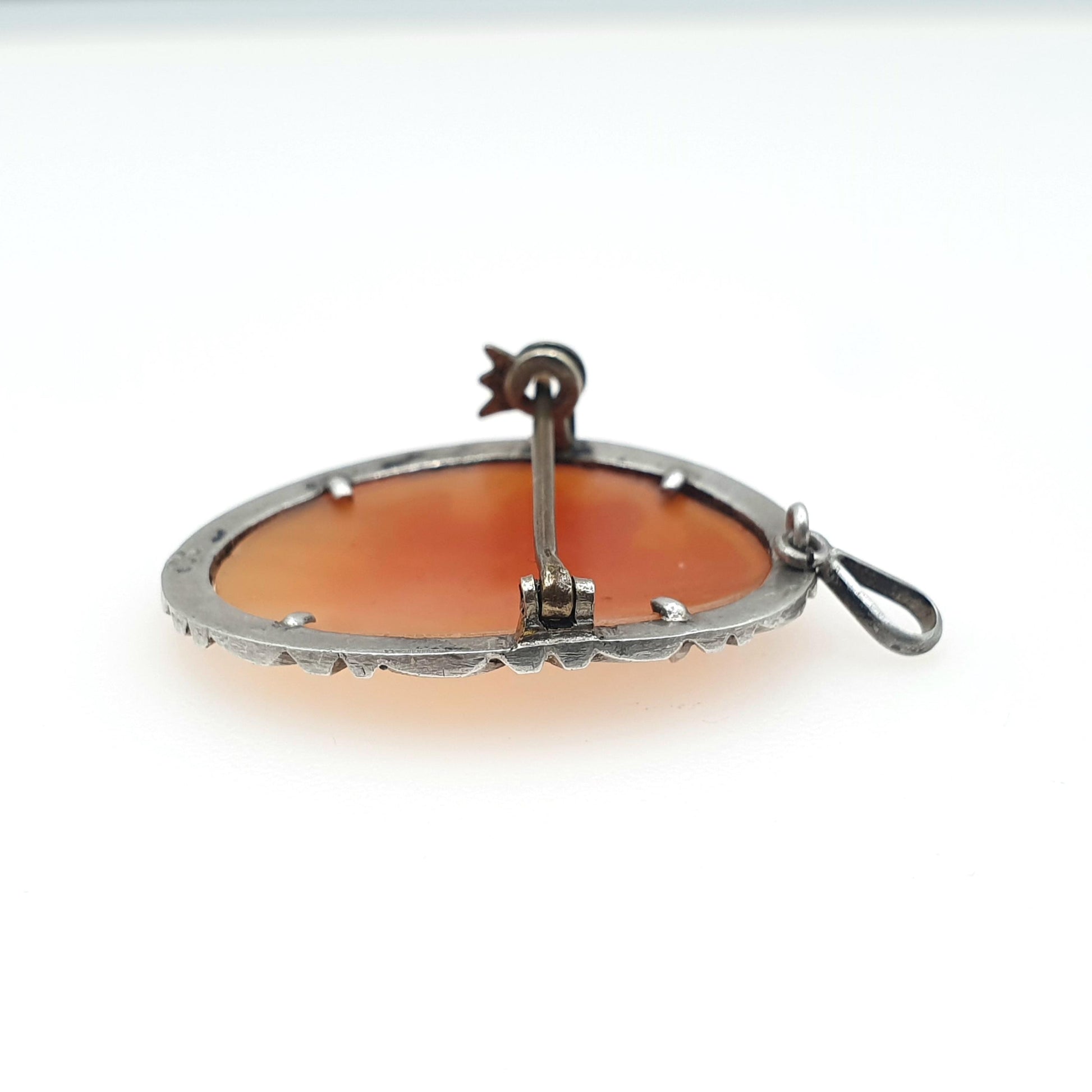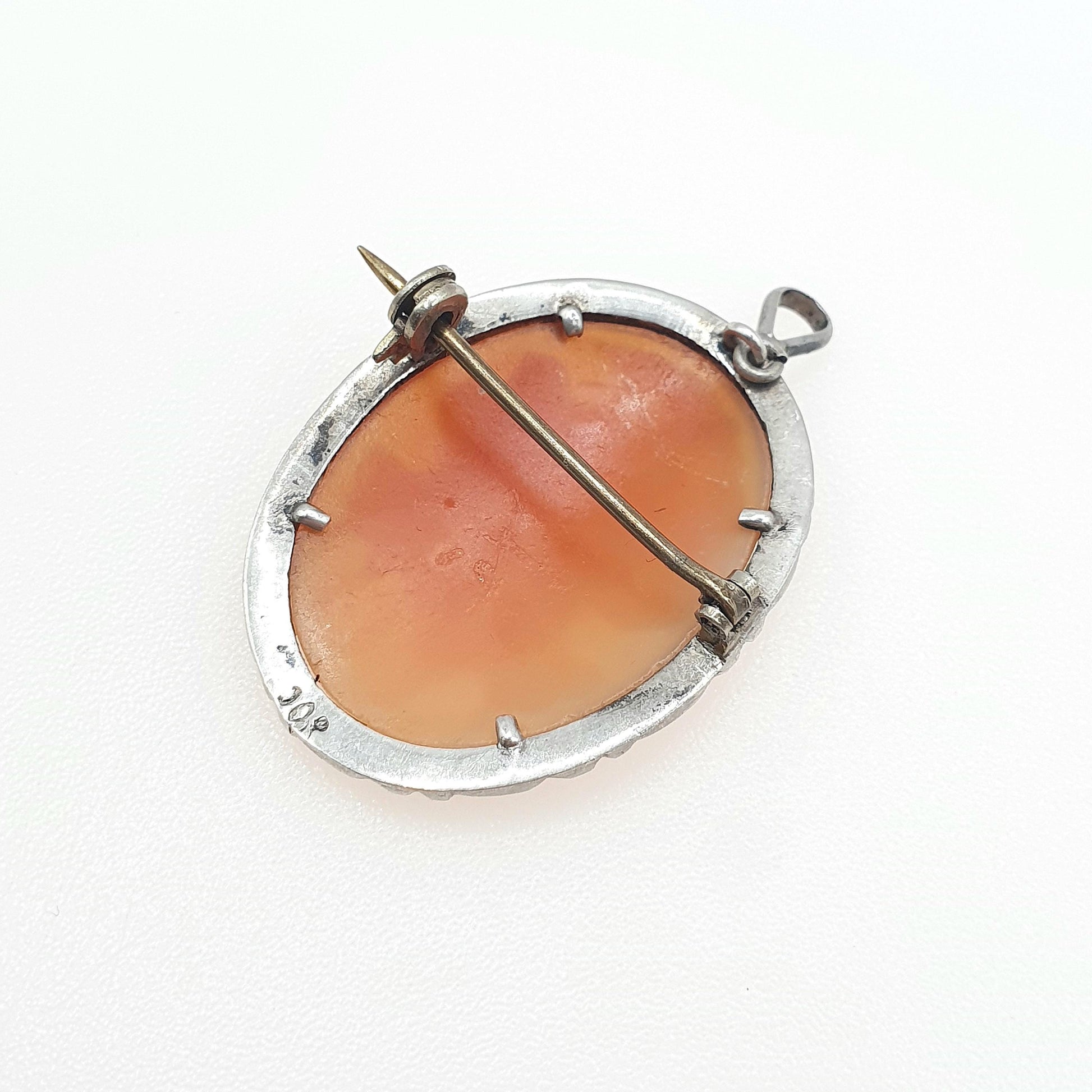 DESCRIPTION: A beautiful antique 1920s three graces cameo pendant brooch, mounted in solid silver and decorated with marcasites. The cameo is genuine hand carved shell and has good detail. It weighs approx. 4.07g and the size dimensions are in the latter photos. The item is stamped "800" for solid silver.