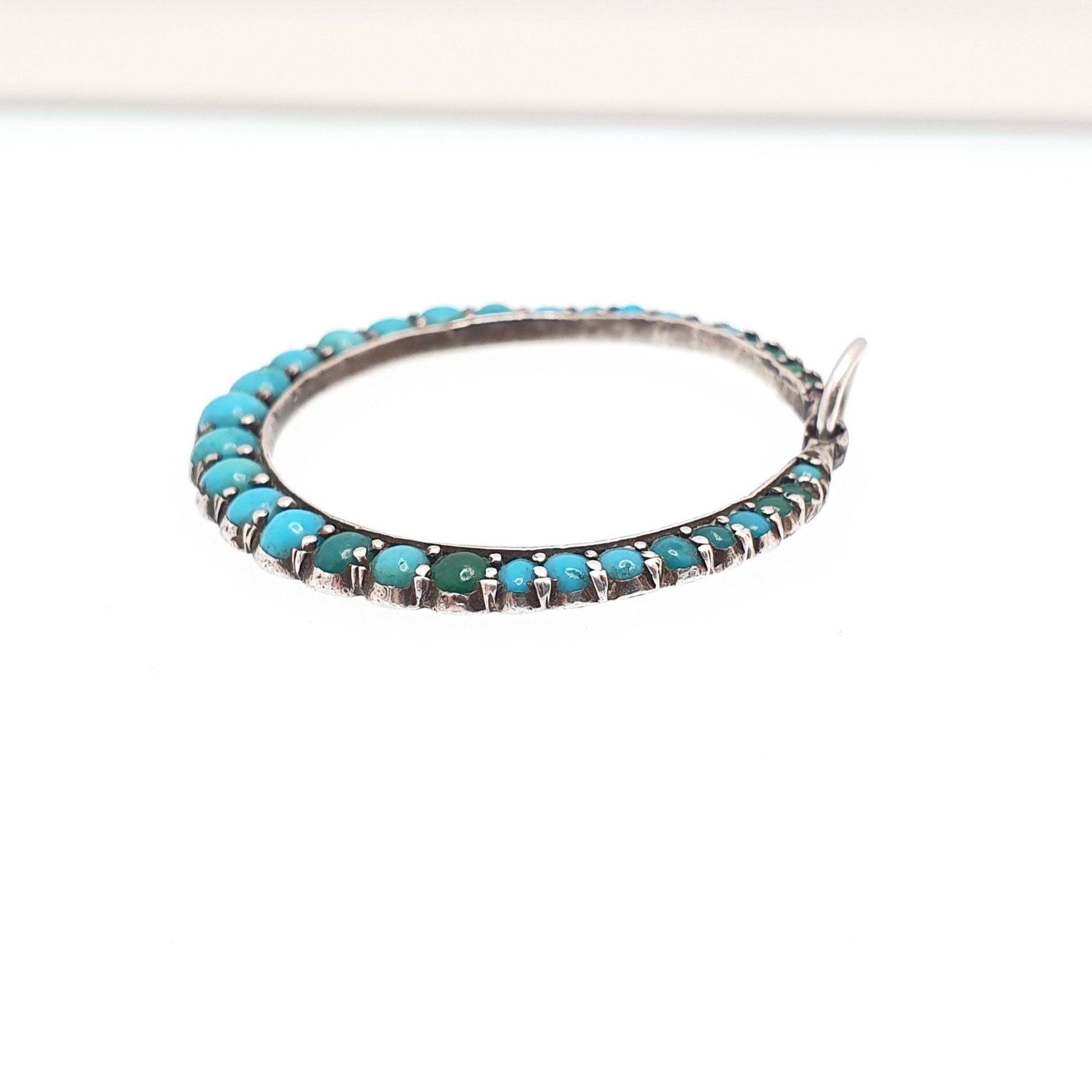 DESCRIPTION: A gorgeous and rare antique Victorian solid silver circle pendant, adorned with numerous natural turquoise gemstones. It weighs approx. 2.03g and the size dimensions are in the later photos. As to be expected with the items age, it isn't stamped/hallmarked, it tests for high grade silver (800+). It has a slight rose gold hue to the rear, it would've had a rose gold vermeil on the rear which has worn with age and use.