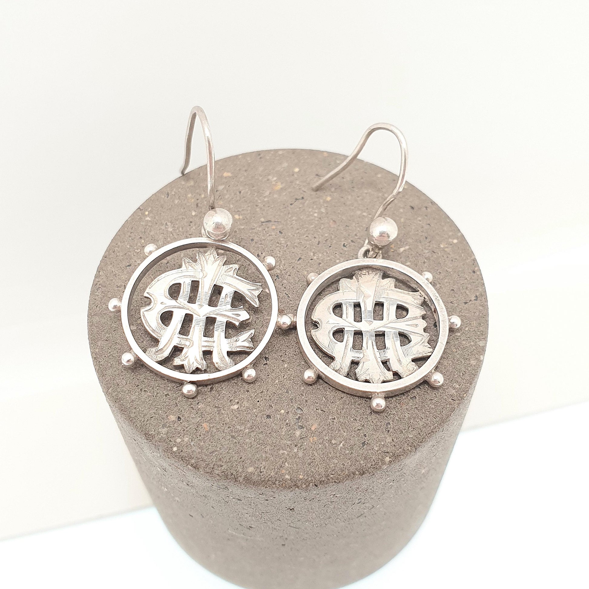 DESCRIPTION: A stunning pair of antique Victorian solid silver hook earrings, with an monogram in the centre. They weigh a total of approx. 2.32g and the size dimensions are in the the later photos. As to be expected with the their age, they're not stamped/hallmarked, they test for high grade silver (800+). They has some dark patina marks in areas, see pictures/video. I think the initial in the monogram are "EM" or "ME".