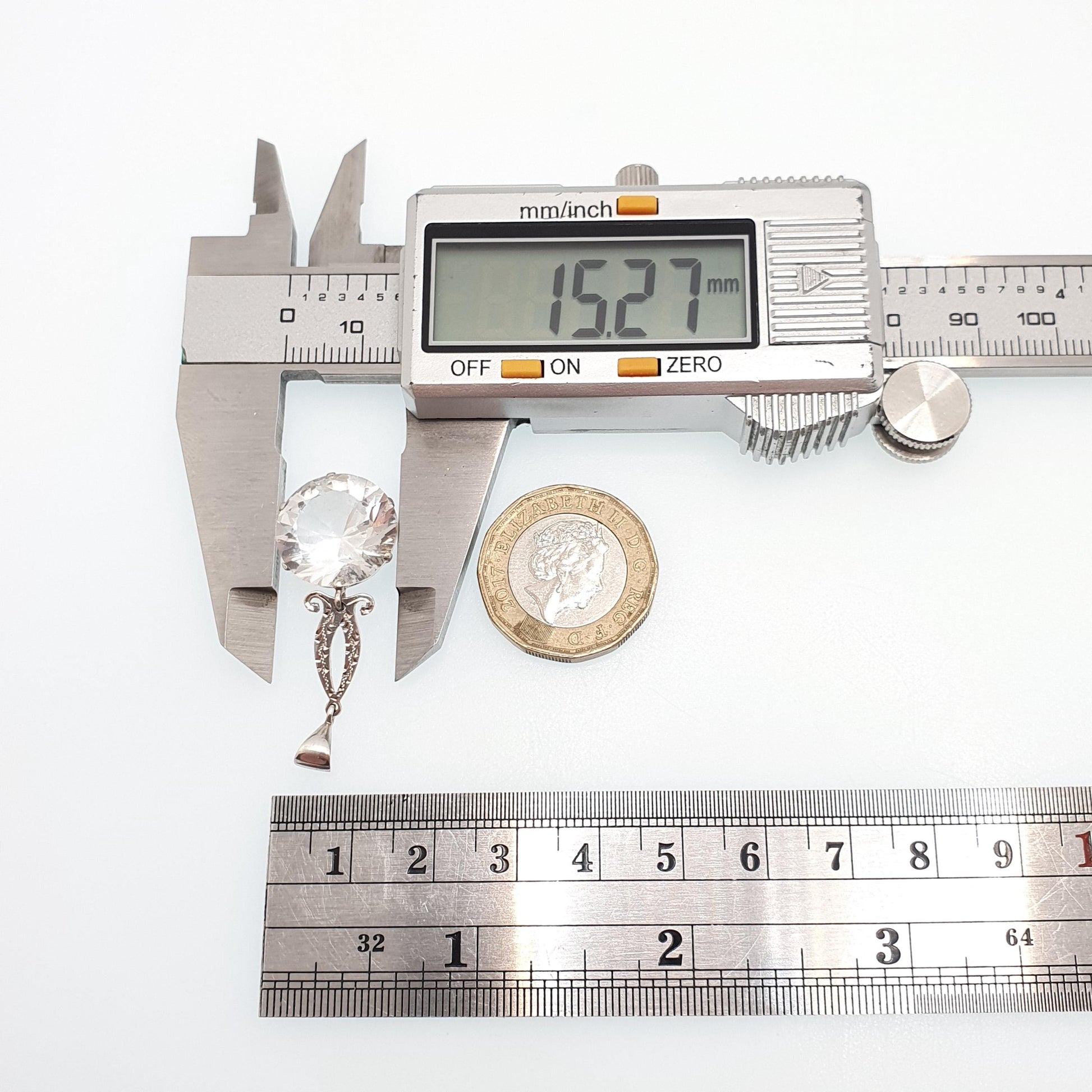 DESCRIPTION: A stunning antique solid silver pendant, adorned with genuine large white sapphire gemstone (100% tested). The gemstones has a beautiful sparkle which I love and an unusual cut. It weighs approx. 5.22g and the size dimensions are in the later photos. As to be expected with the items age, it isn't stamped as to be expected with its age.