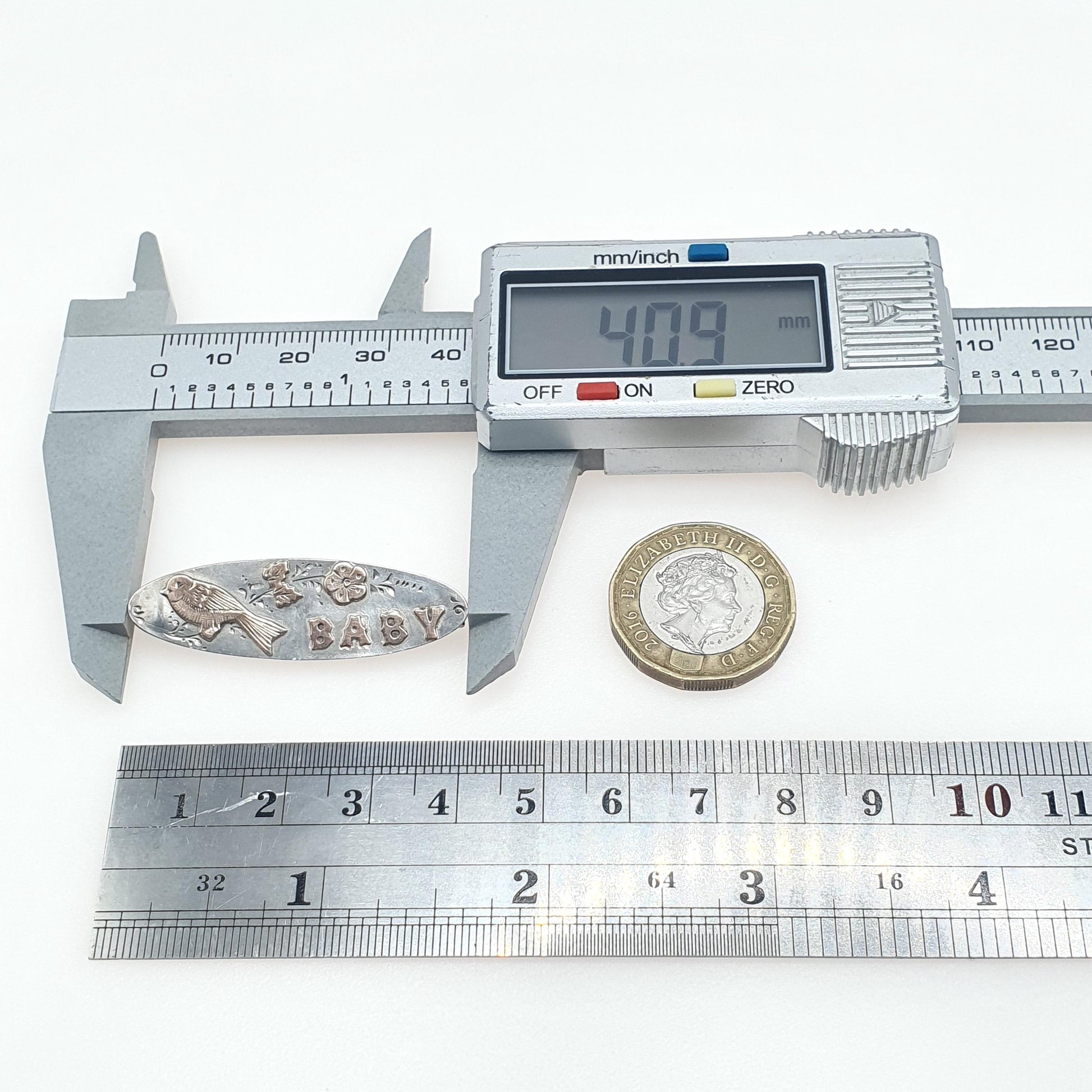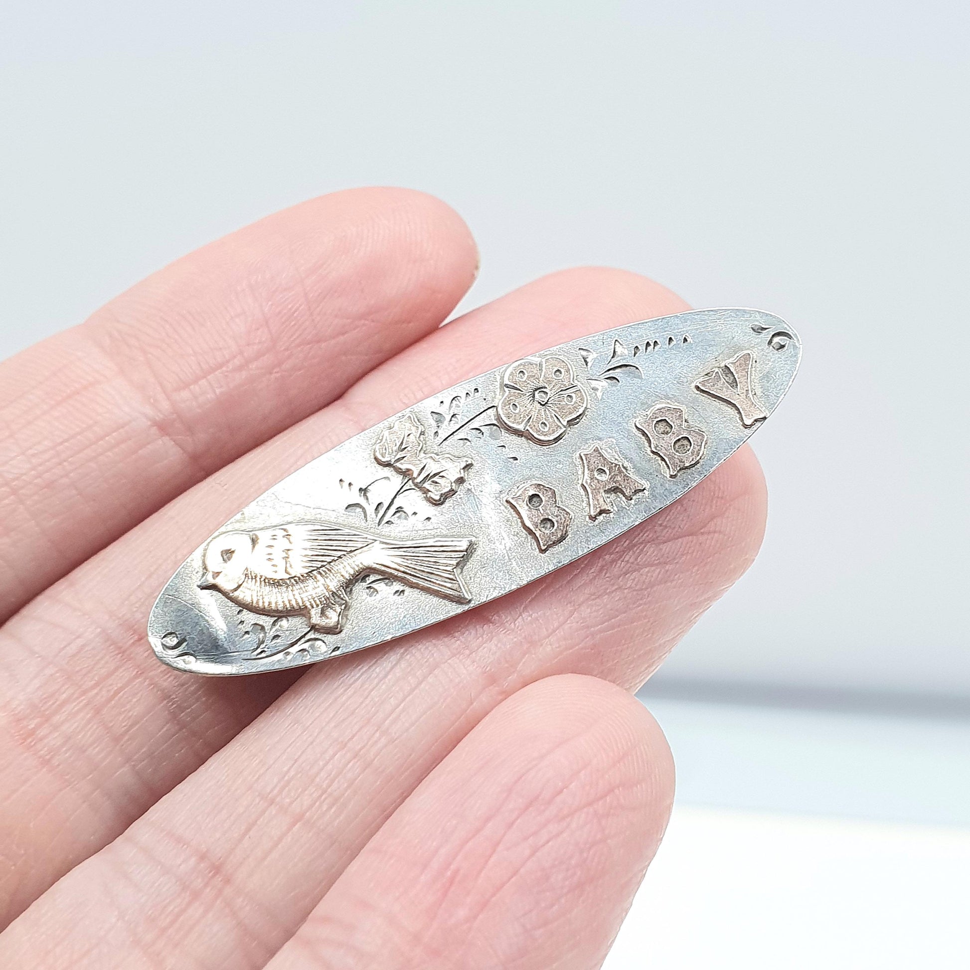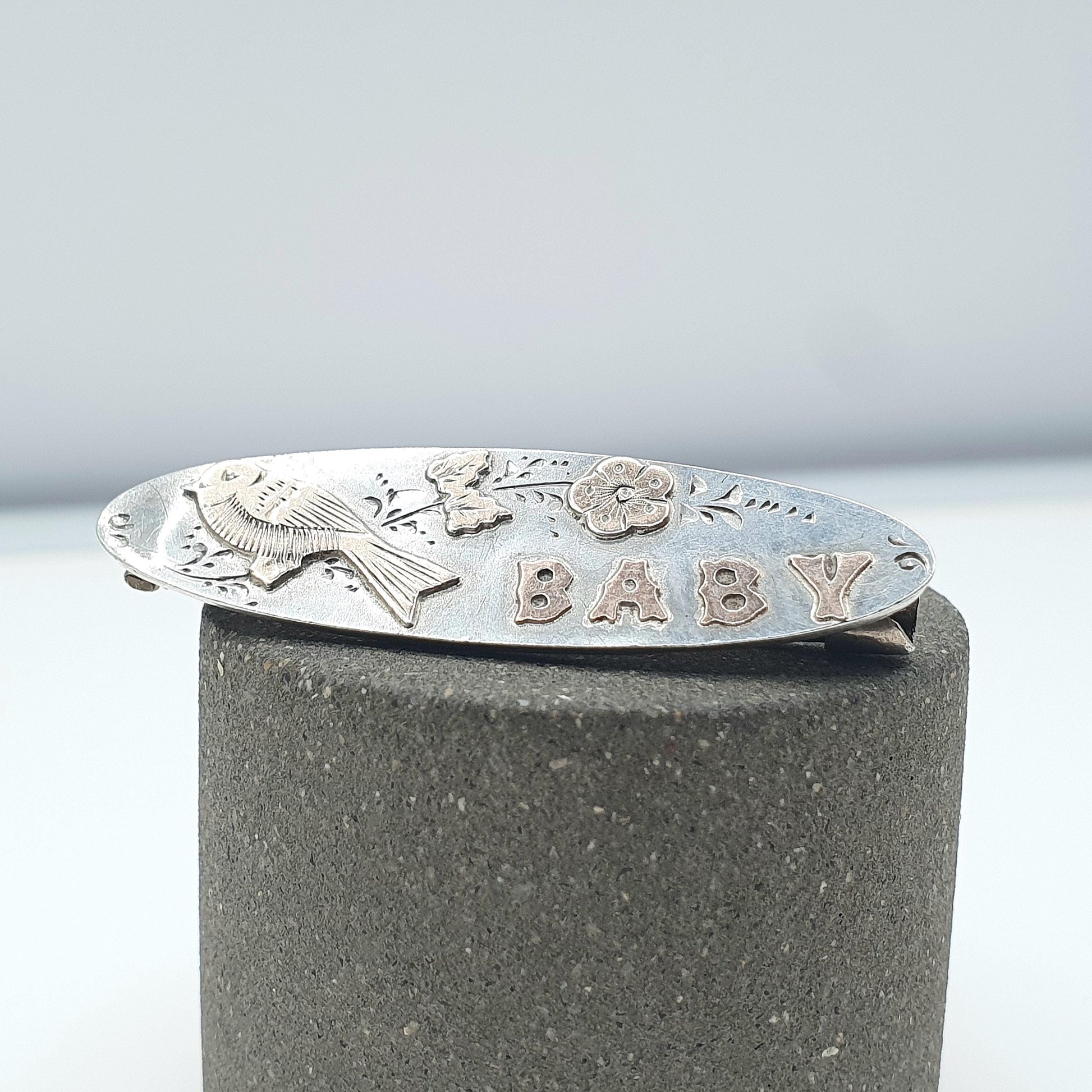 DESCRIPTION: A sweet antique sterling silver brooch with rose gold detailing, featuring a bird, flowers and the word 'BABY'. The brooch is fully hallmarked for sterling silver, dating to 1905. It weighs approx. 2.48g and the size dimensions are in the later photos.
