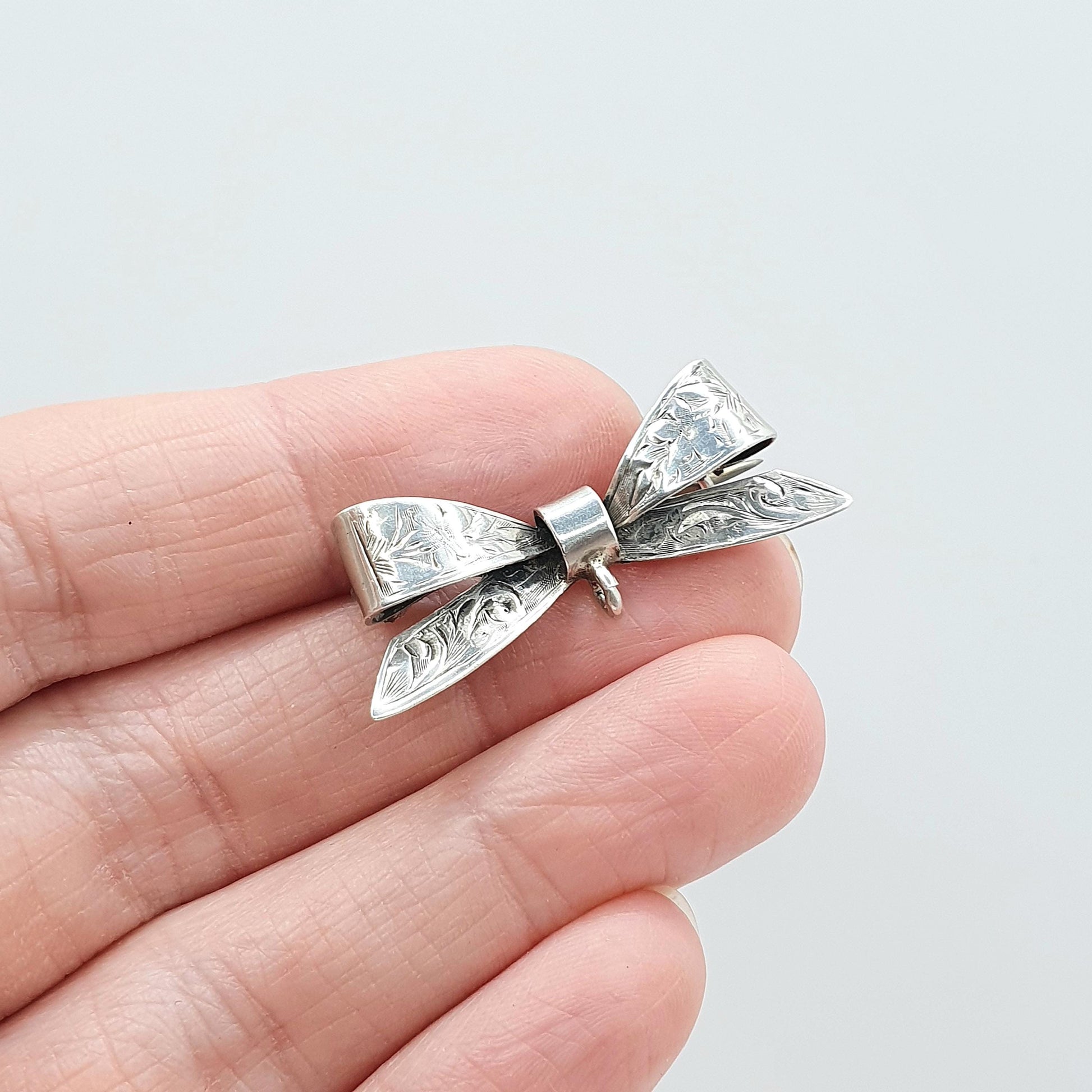 Antique Sterling Silver Bow Brooch Hand Engraved Ribbon Nurse Fob Cute Gift Womens Mens Jewellery Jewelry