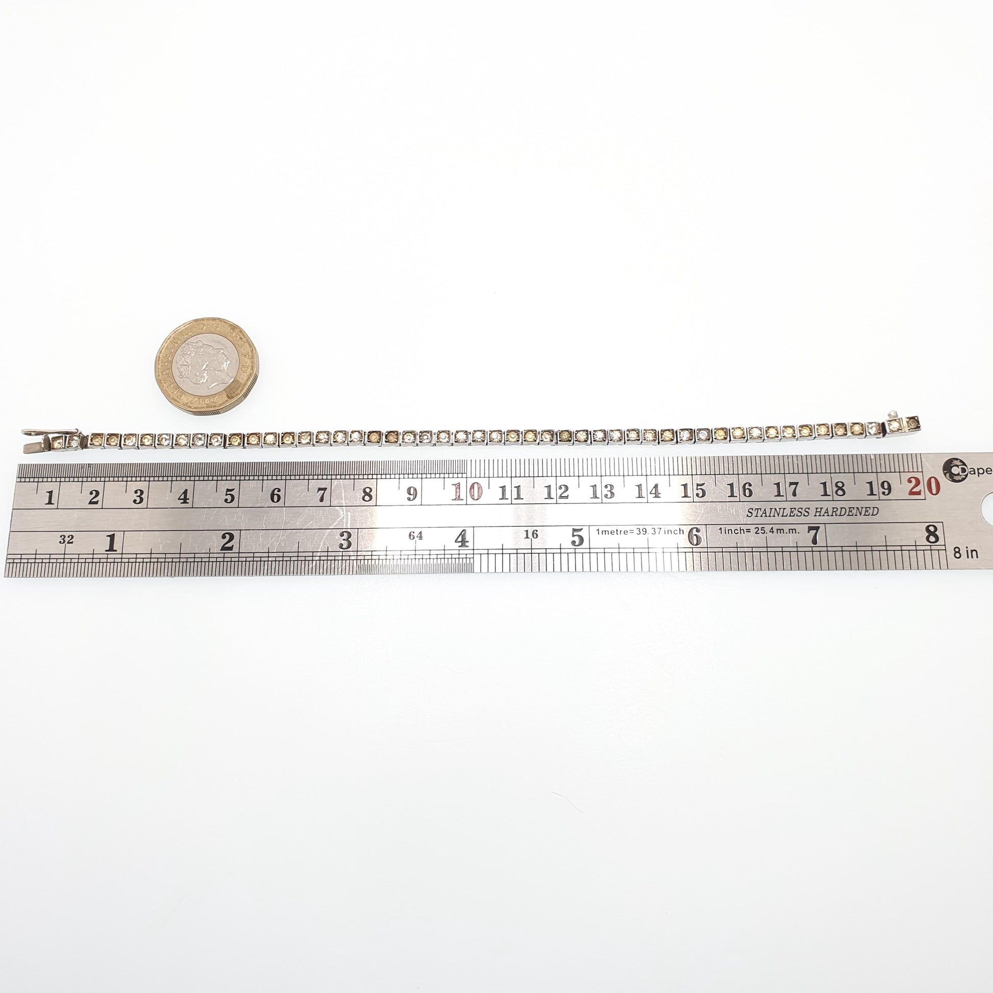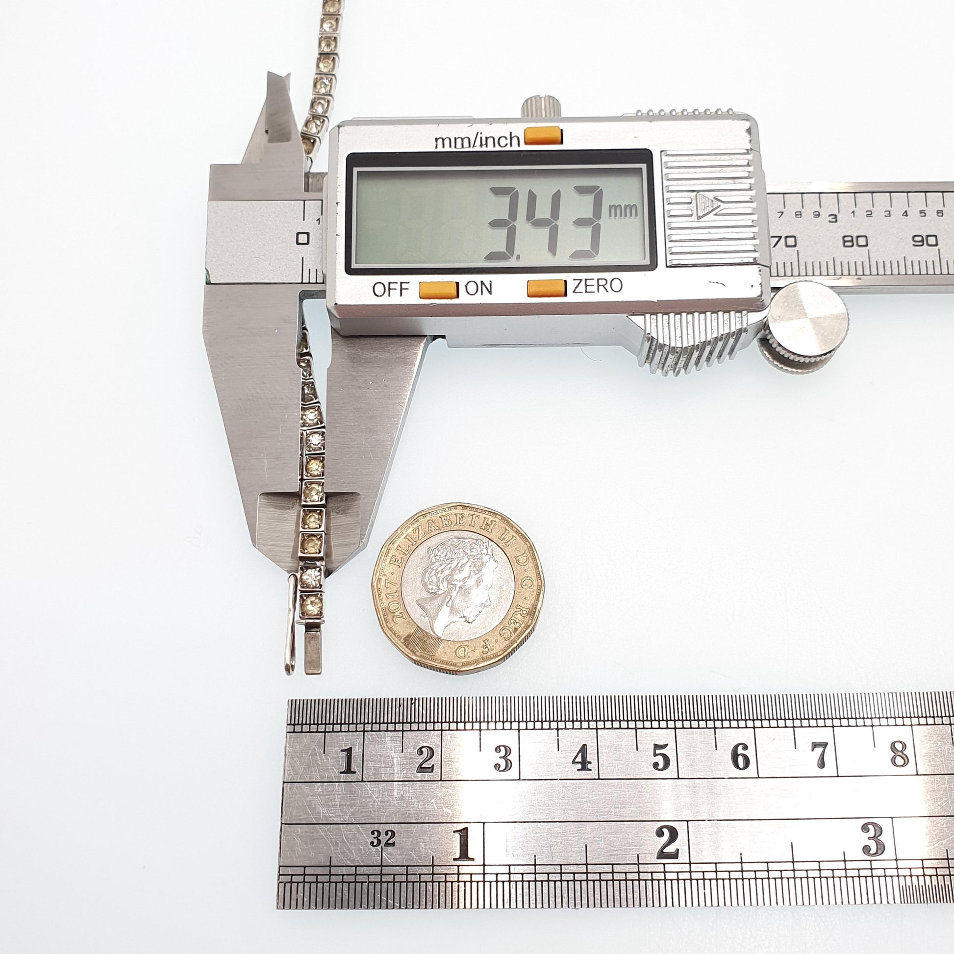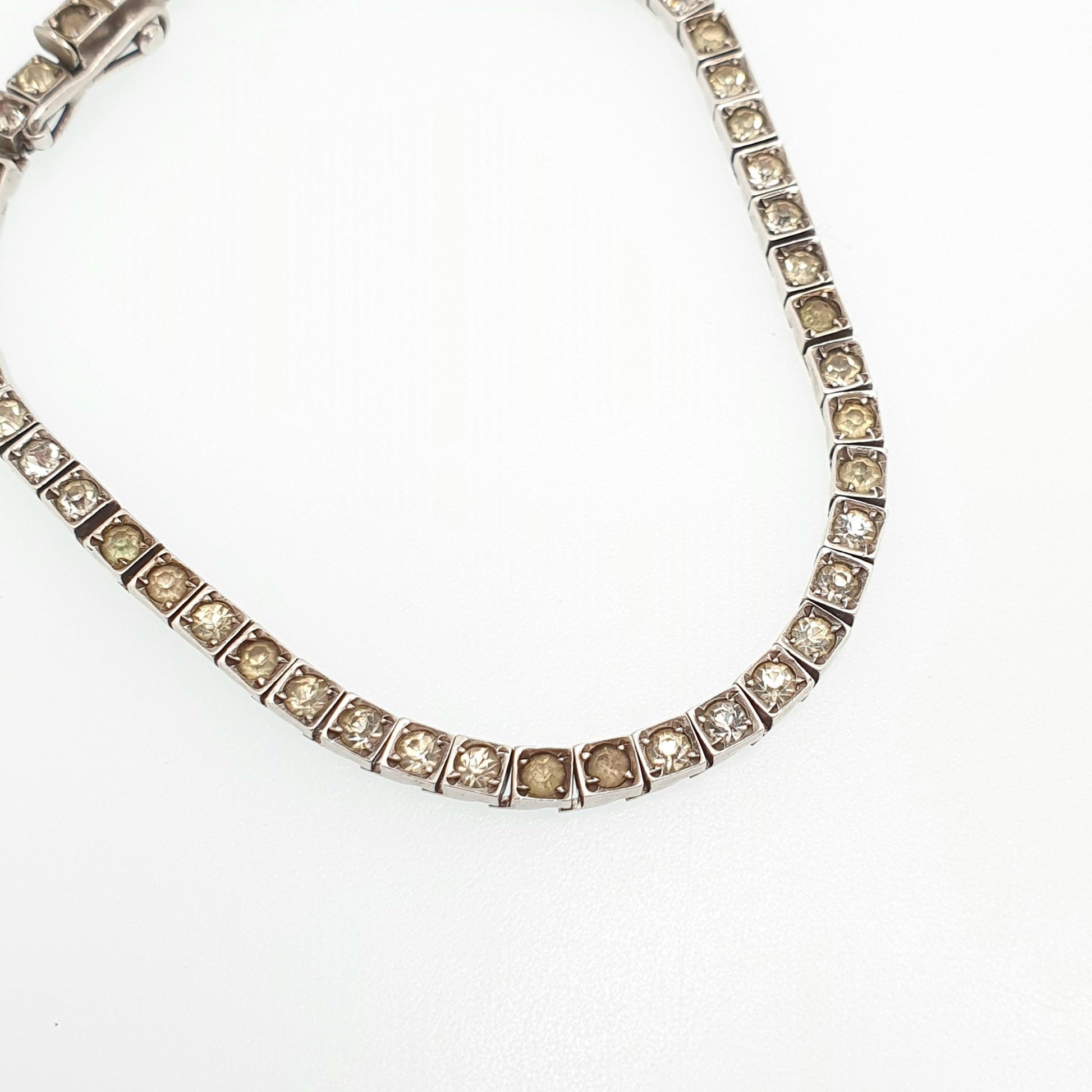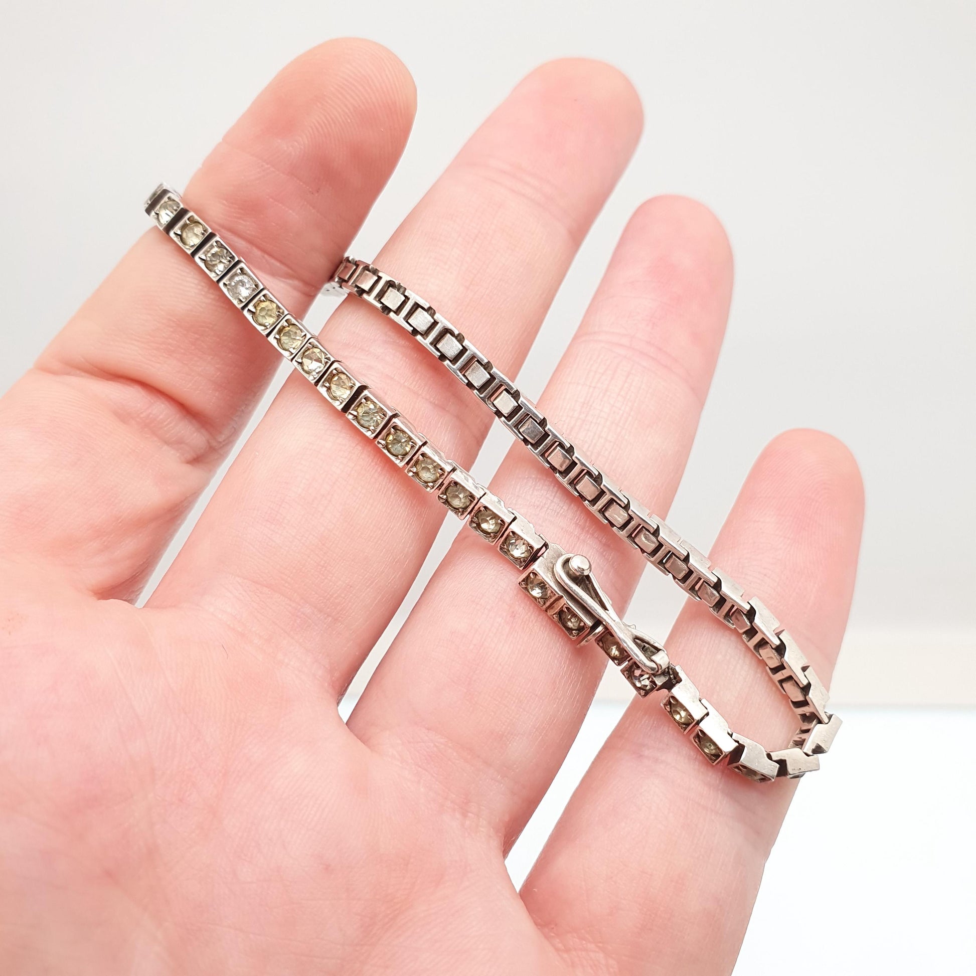 DESCRIPTION: A stunning genuine antique 1920s art deco sterling silver bracelet, adorned with numerous sparkly diamond pastes. All of the pastes are present and the clasp functions as it should. The bracelet is stamped "STERLING", weighs approx. 11.25g and measures approx. 19cm or 7.5" in unfastened length. PLEASE NOTE: Some of the pastes have darkened and yellowed with age (see pictures/video). I've reduced the price accordingly.