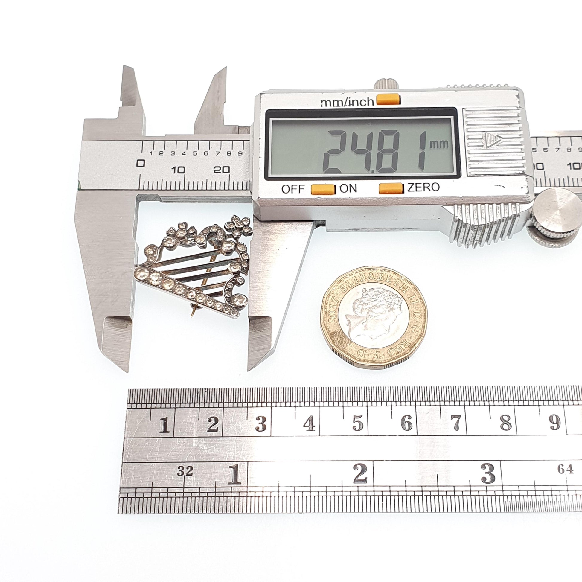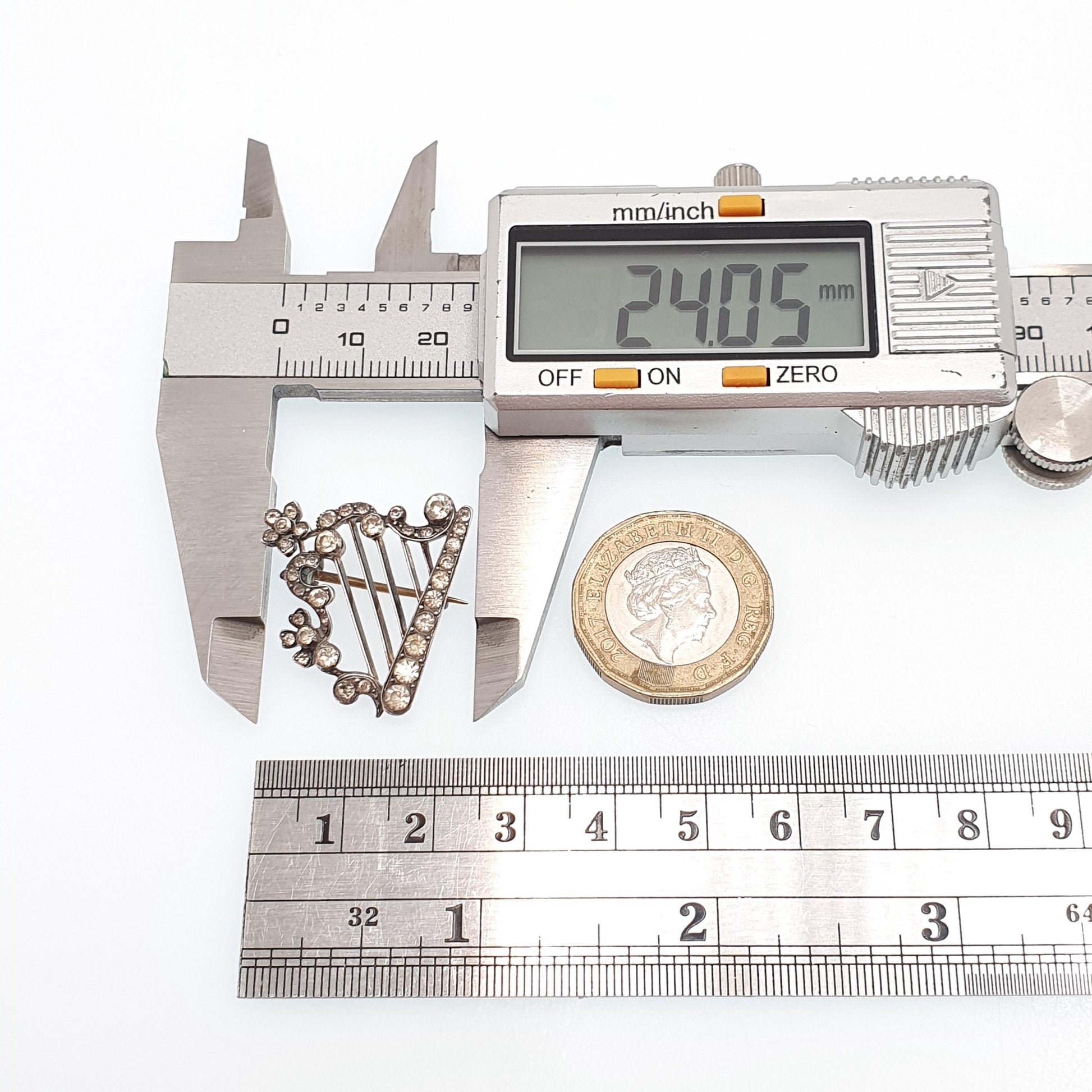 DESCRIPTION: A lovely antique Victorian sterling silver harp brooch, adorned with diamond pastes. The item weighs 5.65g and the size dimensions in the later photos. It's stamped "925" and is made by The Parisian Diamond Company.