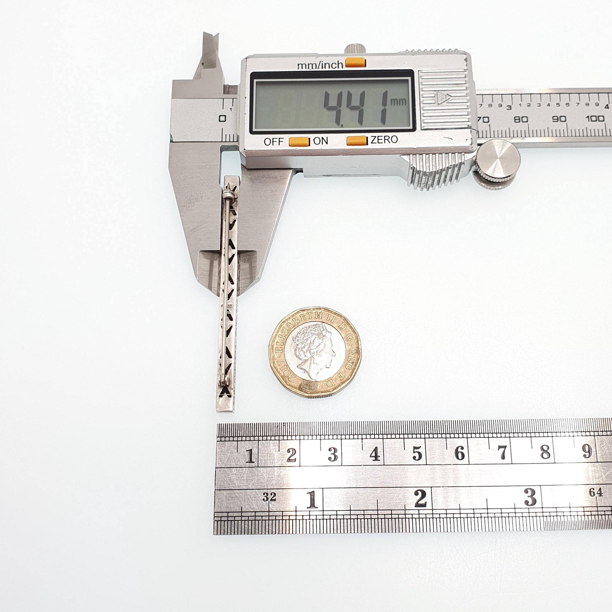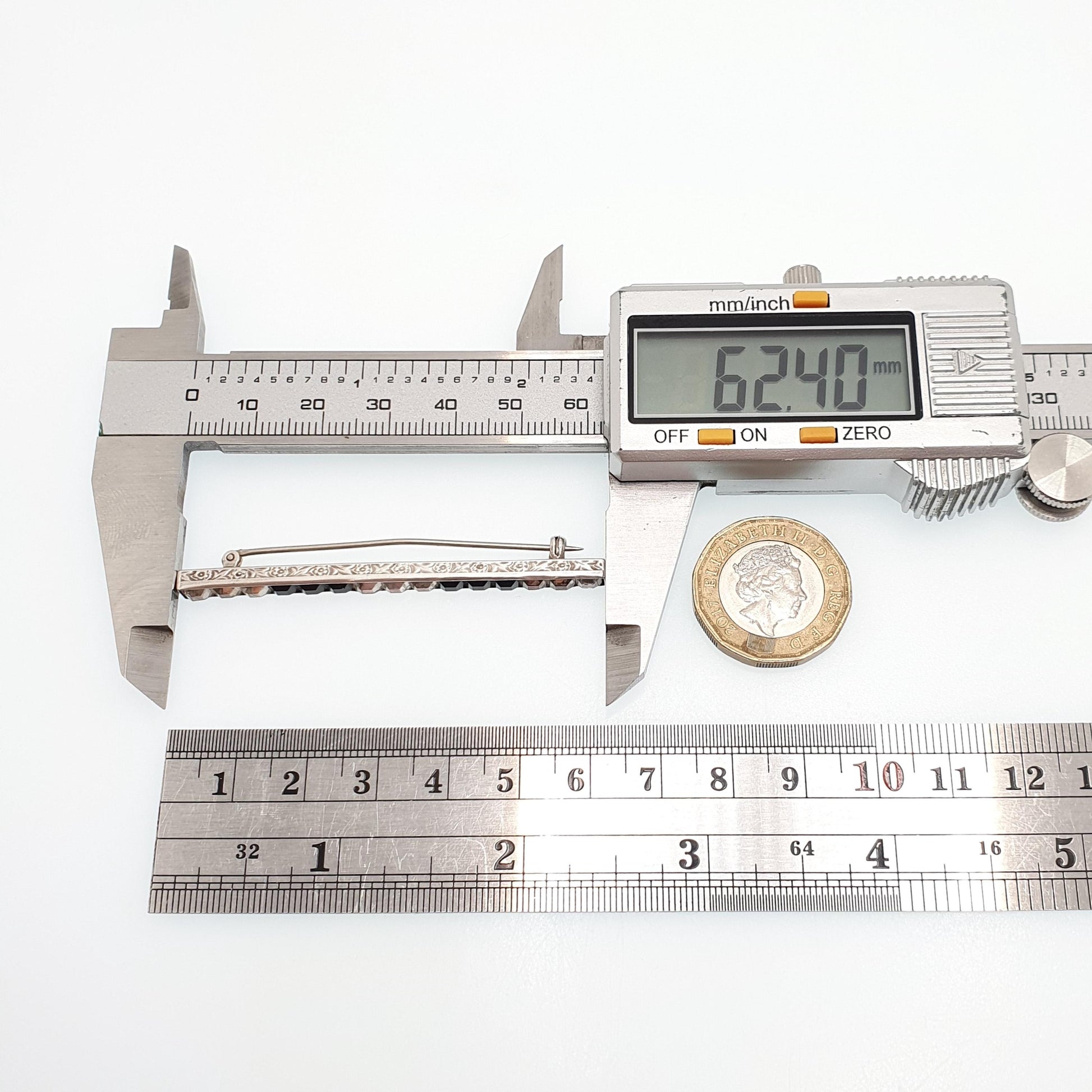 DESCRIPTION: A stunning and sparkly genuine art deco (c1920s) sterling silver brooch, adorned with onyx tone and diamond tone pastes. The paste are square cut and set in a channel setting. The brooch is stamped "STERLING" (worn) and weighs 3.77g. The size dimensions are in the latter photos. All the pastes are present which is a nice touch and they still have a sparkle. One paste on the end has a chip to it (see pictures).