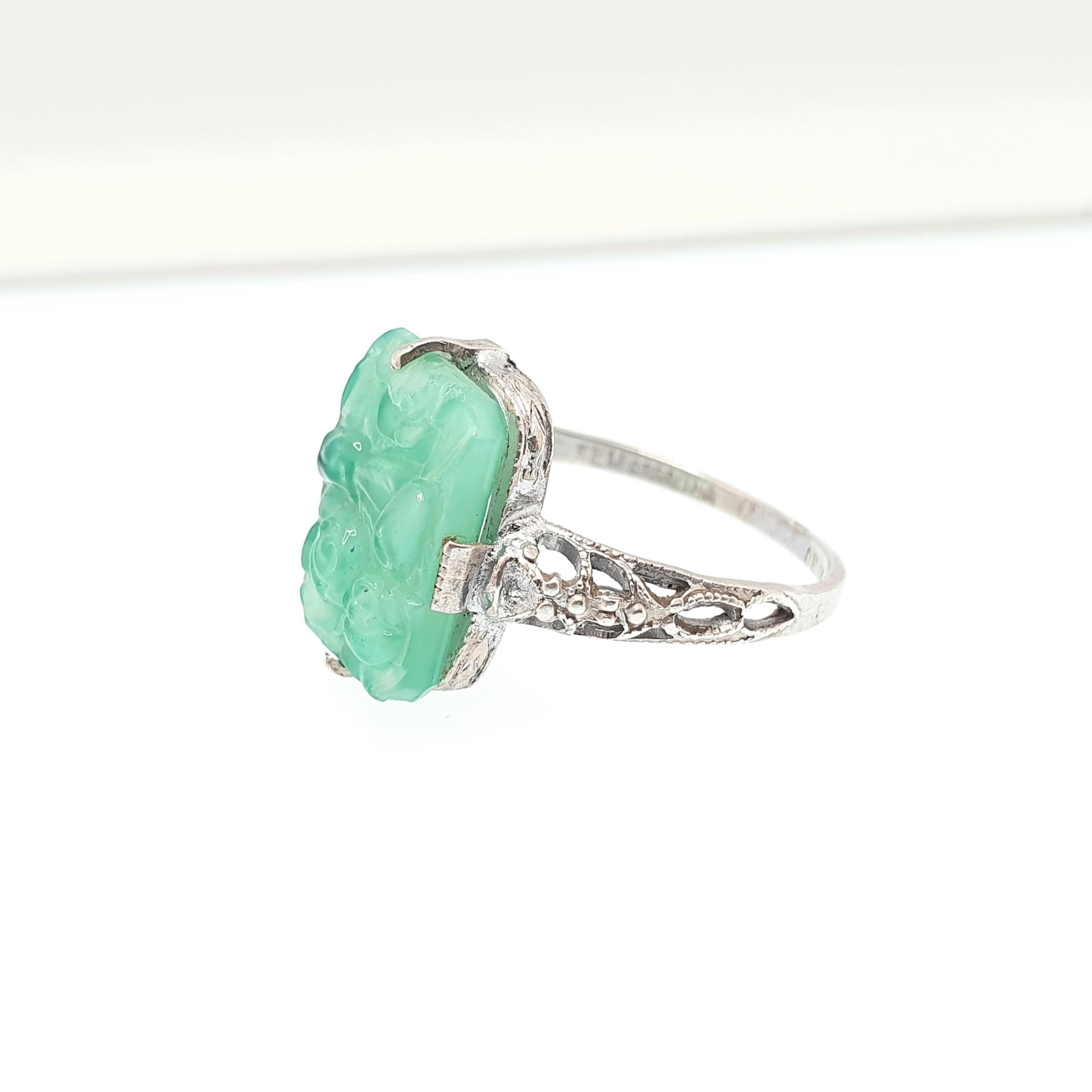 Antique Sterling Silver Peking Glass Jade Ring TLM Thomas L Mott Art Deco Vintage 1920s Womens Green Czech Jewellery Jewelry