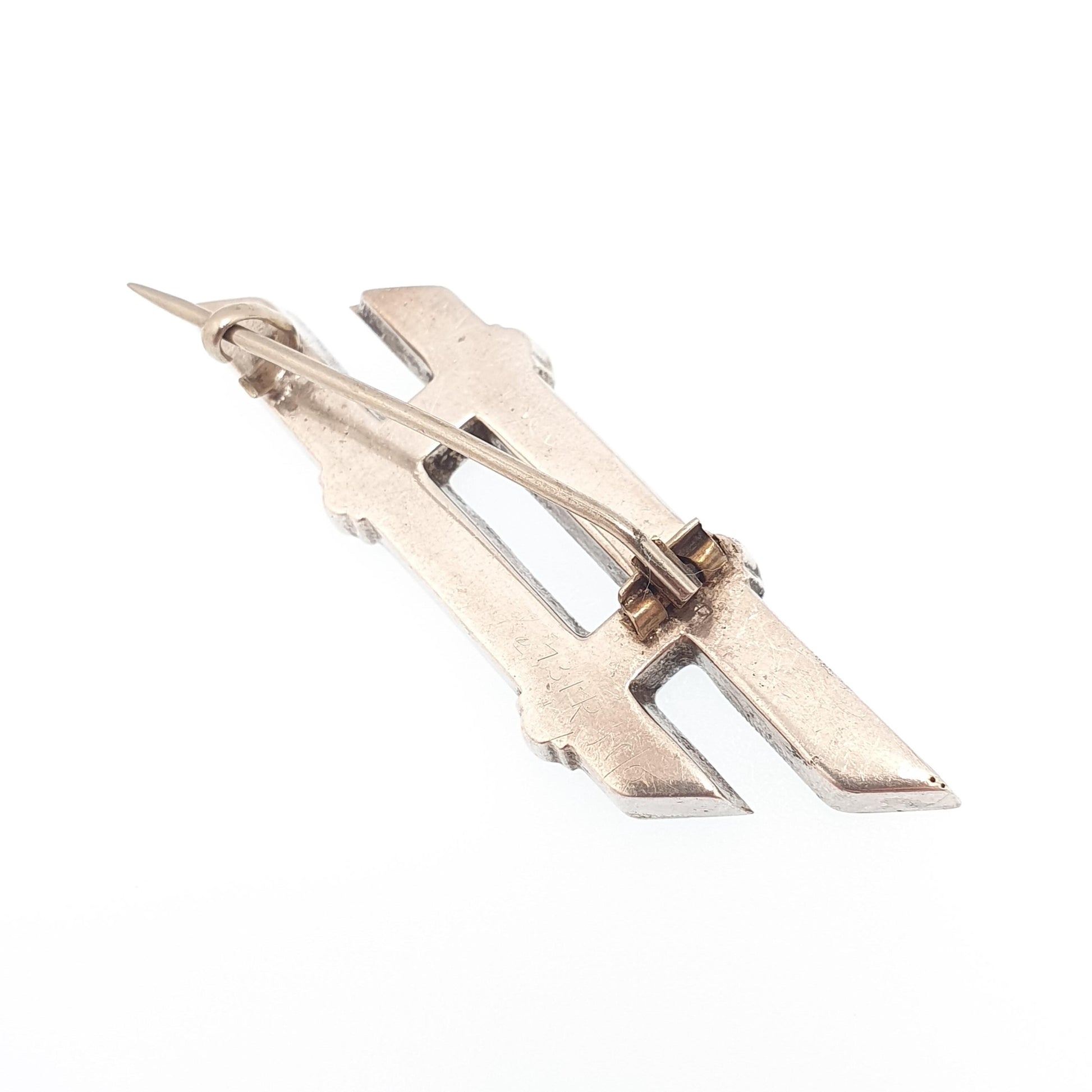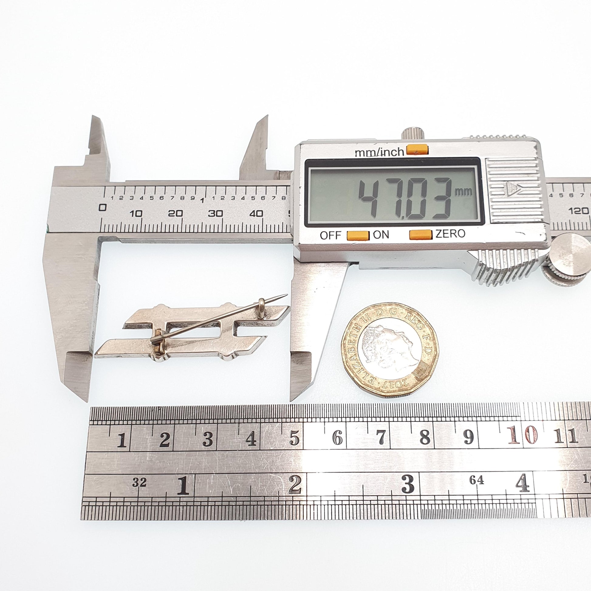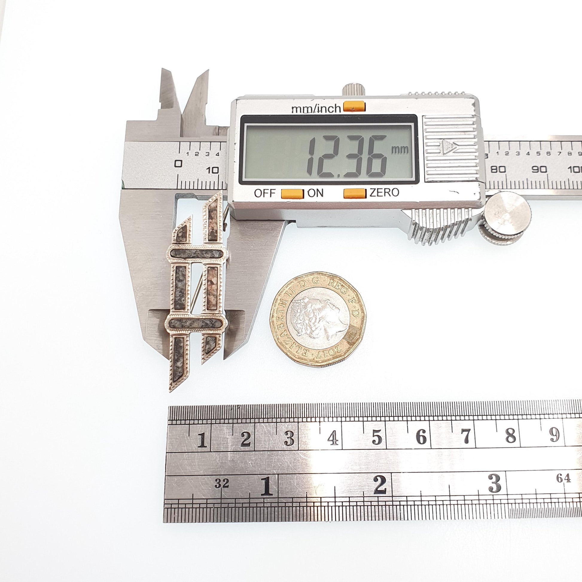 DESCRIPTION: A beautiful antique Victorian Scottish sterling silver brooch, adorned with Aberdeenshire granite. The brooch is fashioned in a parallel and traversal shape (I'm unsure of its symbolism but I'd be interested to find out). The item weighs approx. 4.80g and the size dimensions are in the later photos. As to be expected with its age, it isn't stamped/hallmarked, it tests for sterling 925 silver.