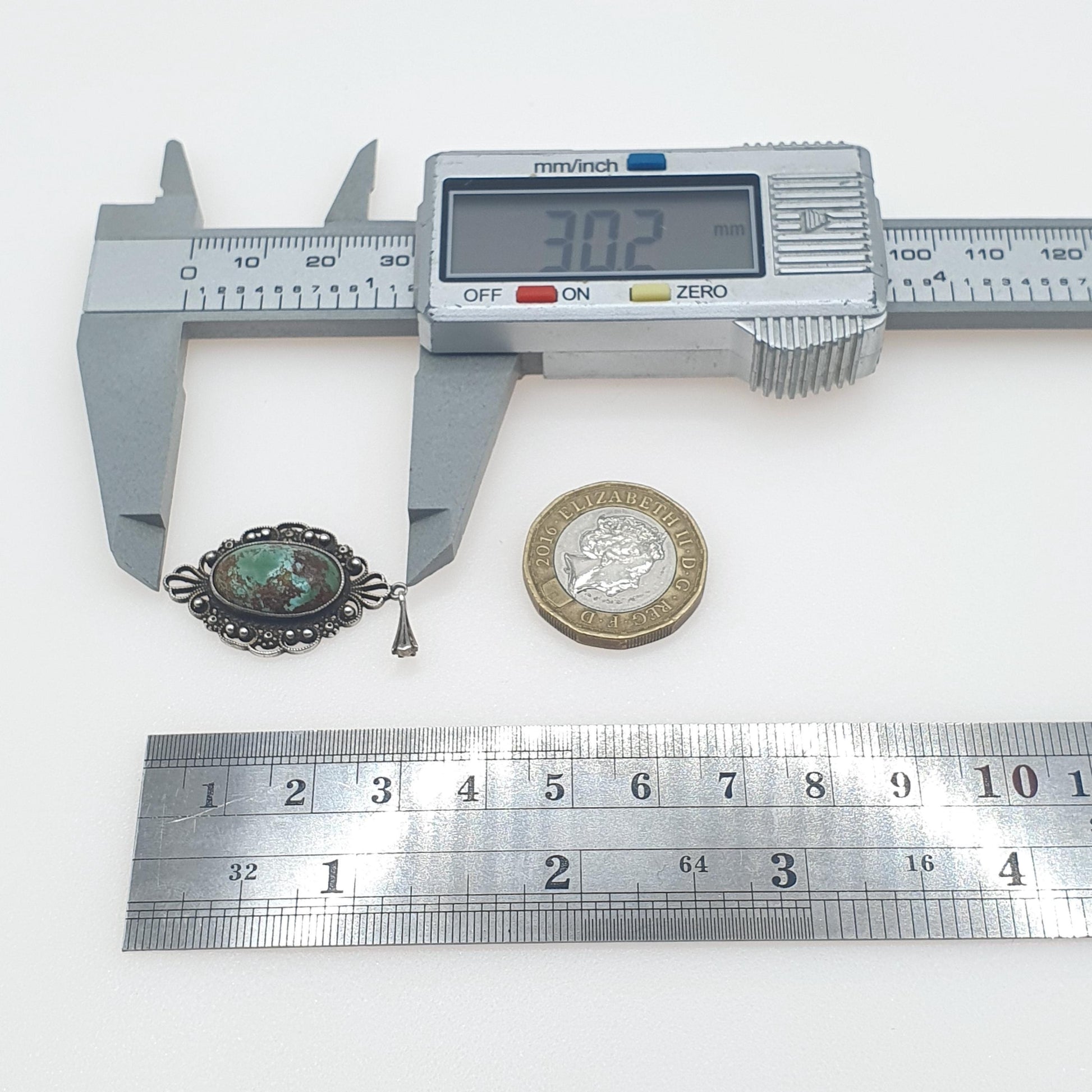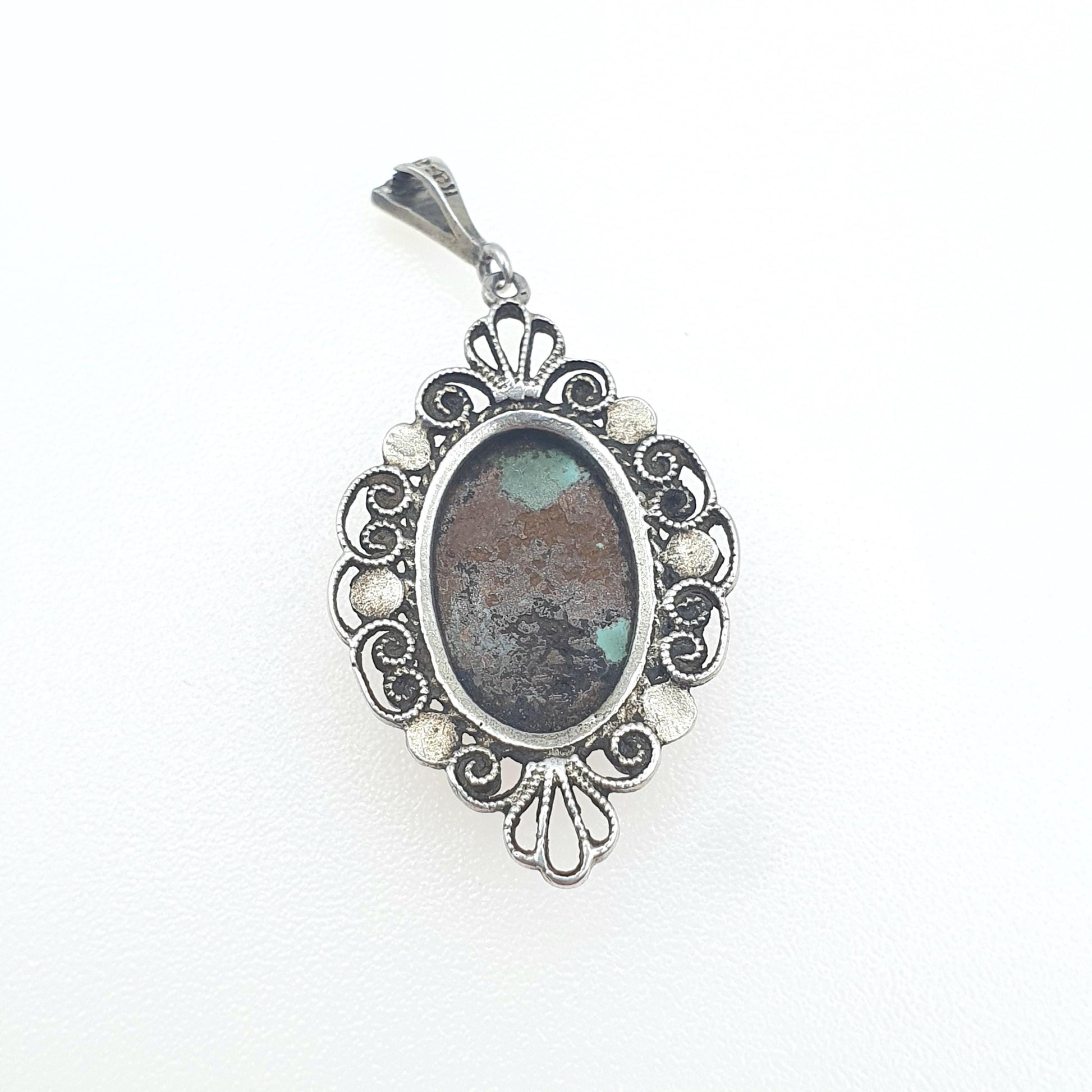 DESCRIPTION: A stunning antique sterling silver filigree pendant, adorned with a natural turquoise gemstone. The pendant is stamped "925GH" for sterling silver and it weighs 3.27g. The items size dimensions are in the latter photos.