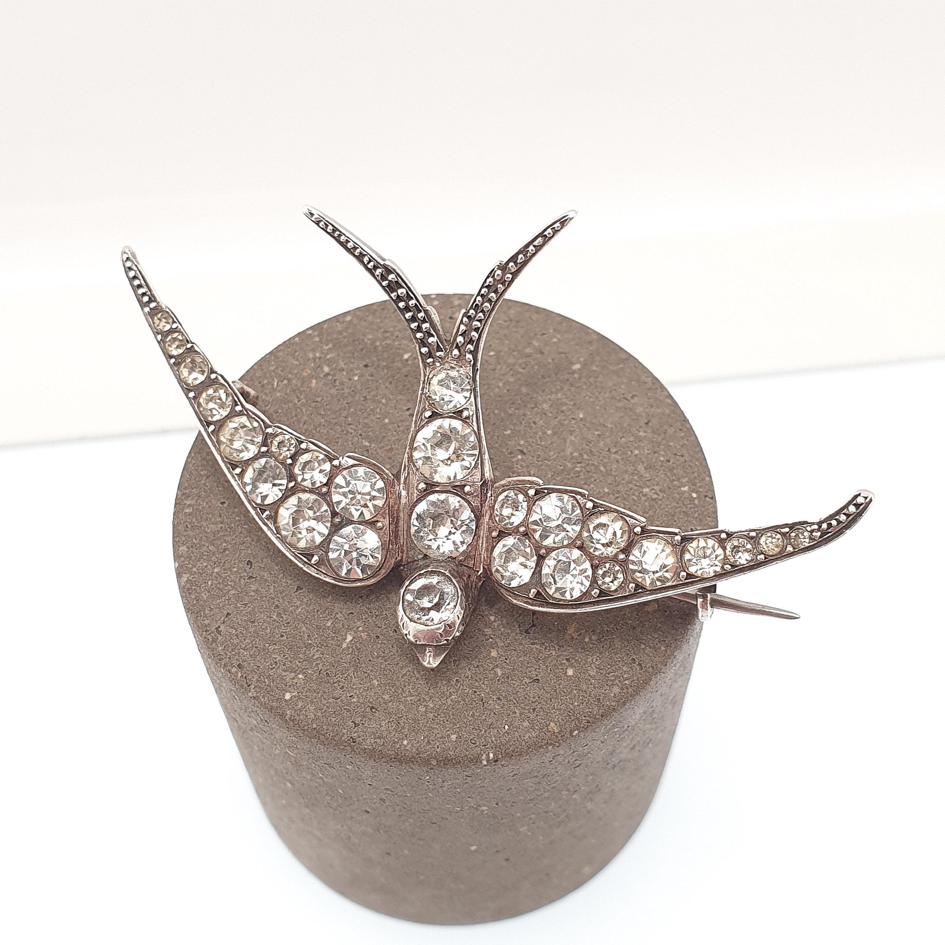 DESCRIPTION: A stunning and large Victorian sterling silver swallow bird brooch, adorned with numerous foiled pastes. It weighs approx. 10.23g and the size dimensions are in the later photos. It's made by The Parisian Diamond Company who were prominent paste jewellery maker in the late 1800s. It's stamped with their makers mark and "925" for sterling silver.