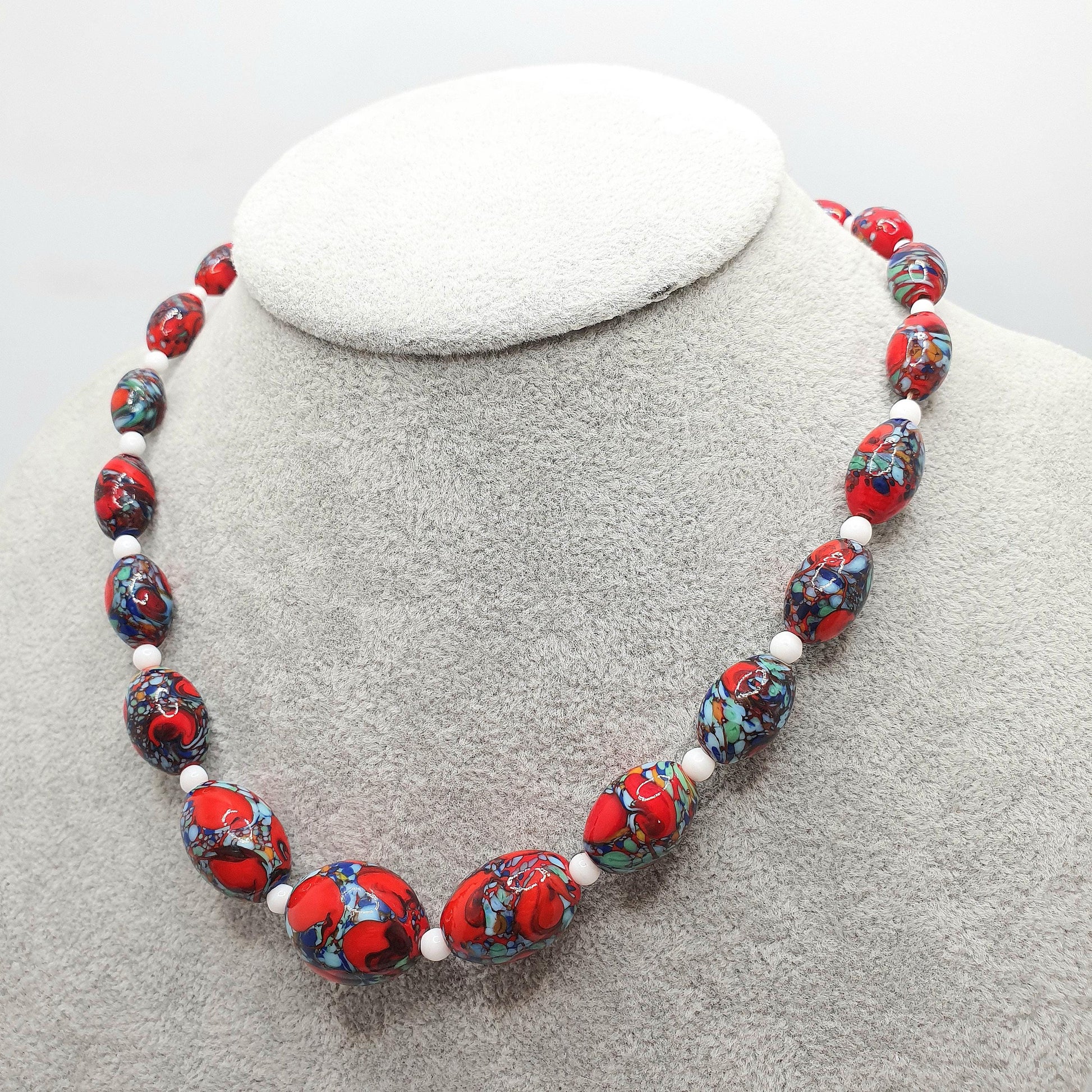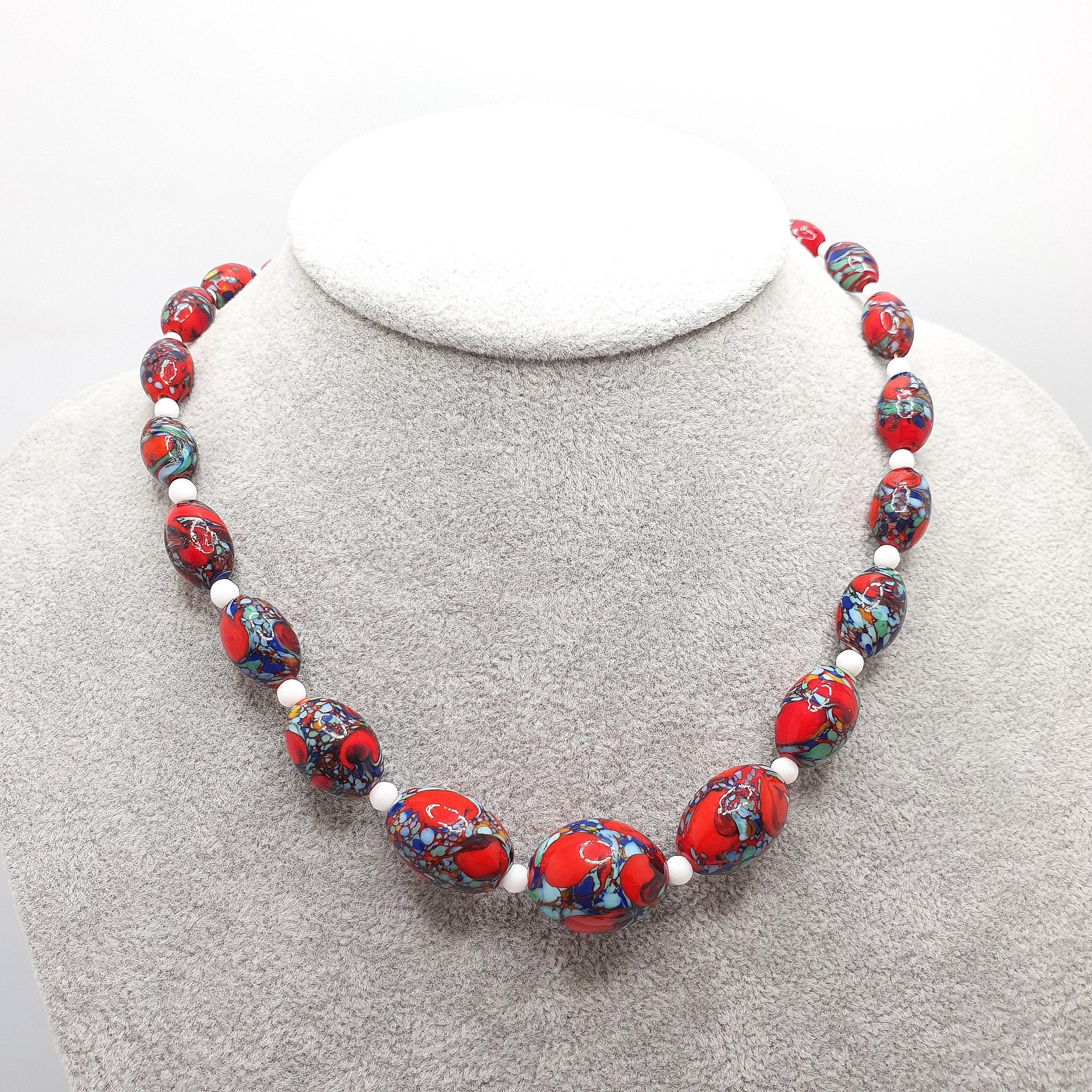 Antique Venetian Murano Glass Bead Necklace Millefiori Pebble Dash Red Blue 1920s 42cm 48.49g Venice Vintage Italian Jewelry Jewellery