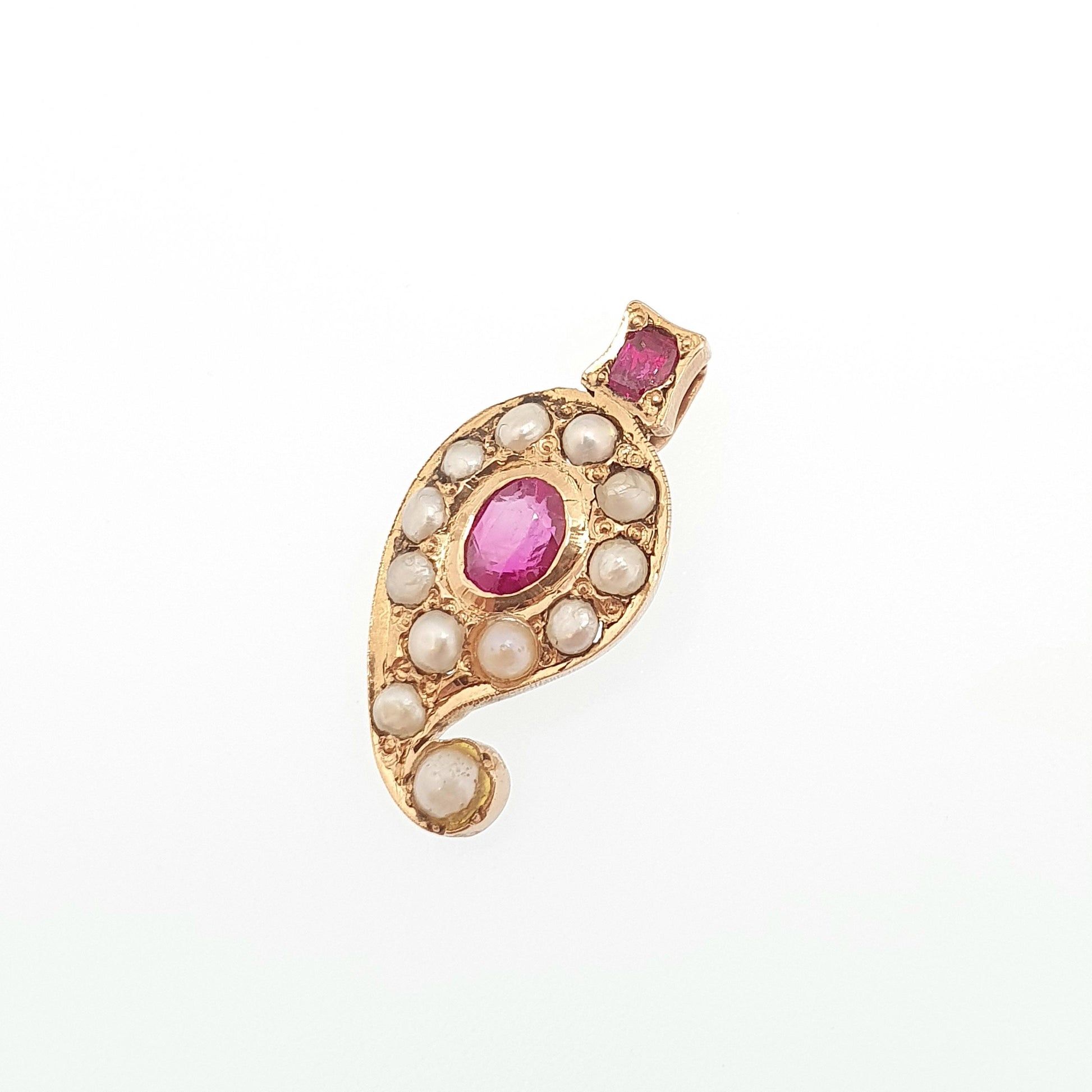 DESCRIPTION: A stunning antique Victorian solid 18ct gold teardrop pendant, adorned with rubies and seed pearls. The item has been crafted to a beautiful standard and is a handmade. It looks like the item used to be an earring and has been converted to a pendant in the 1980s. The item is hallmarked for 18ct gold, the hallmark dates to 1990, this is when the item would've been converted to a pendant, the original part of the necklace is antique Victorian. It weighs approx. 1.51g and the size dimensions are in the later photos. The border has a small section missing on one side, see pictures/video.