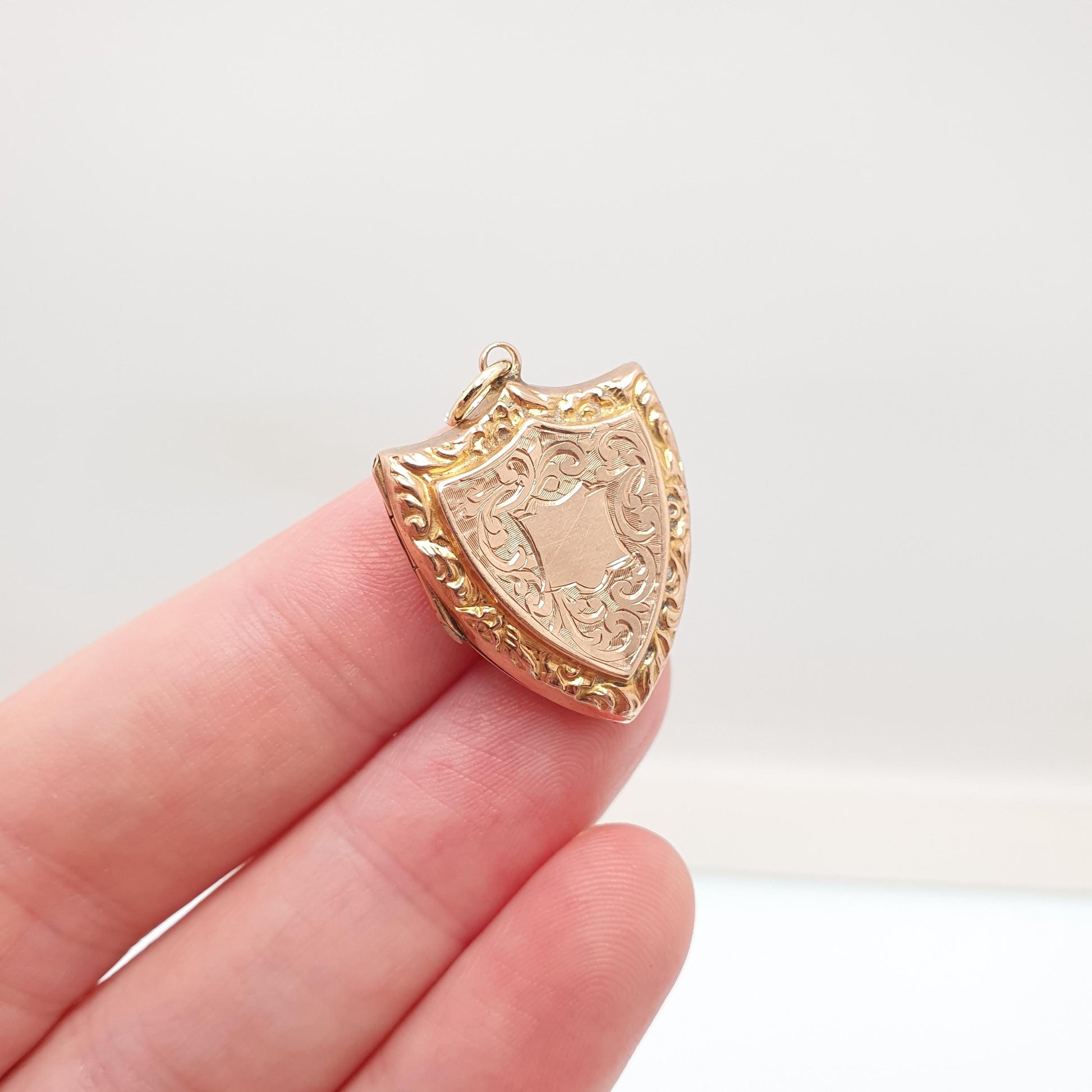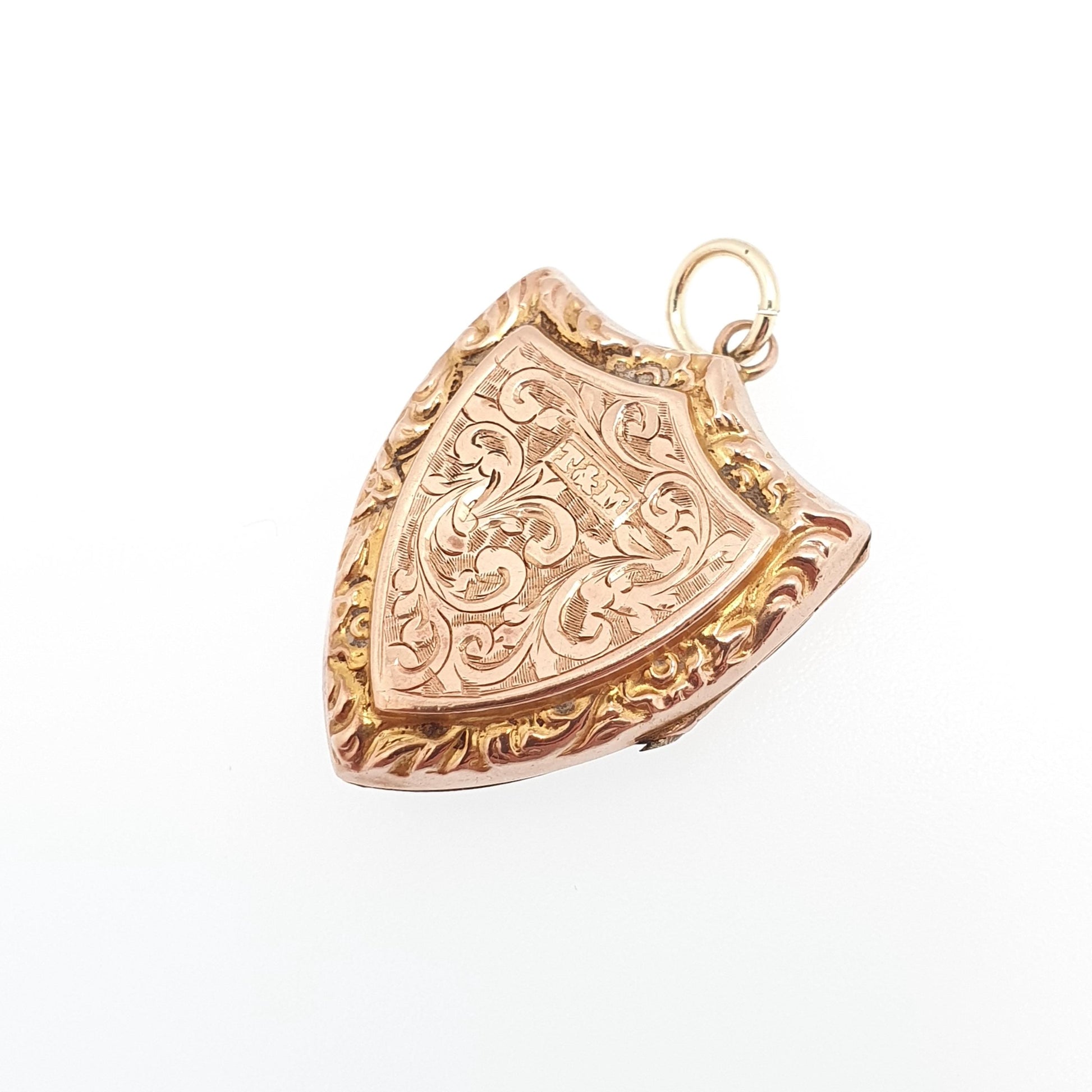 DESCRIPTION: A stunning antique Victorian shield locket, made with a solid 9ct 375 rose gold front and back. It's not a rolled gold or gold filled locket, the outer casing of the front and back is solid 9ct 375 gold. The item has been ornately hand engraved and it has the original innards. It weighs approx. 3.22g, opens/closes well and the size dimensions are in the later photos. As to be expected with the items age, it isn't hallmarked/stamped apart from a makers mark, it tests as explained above.