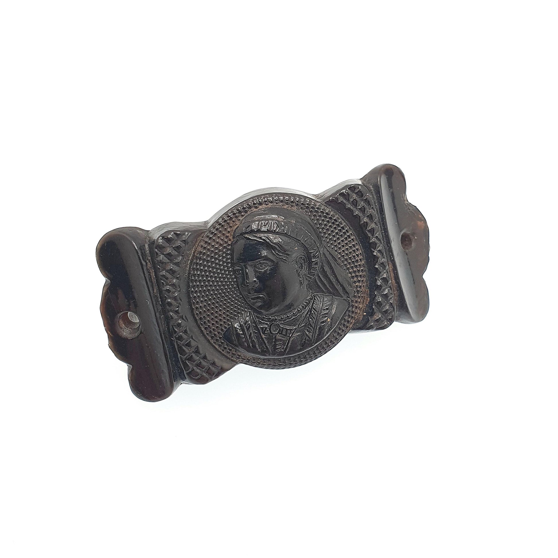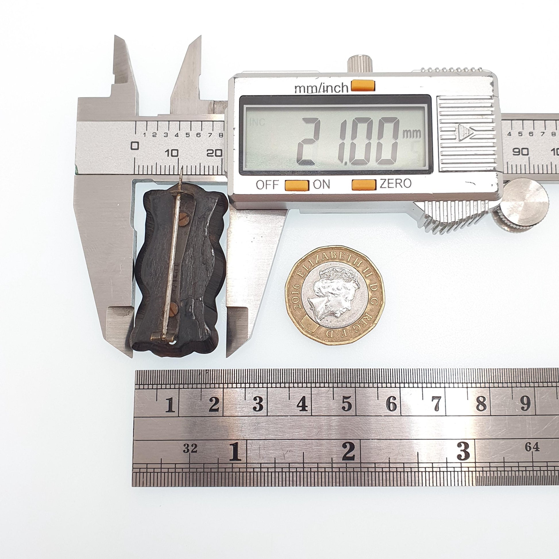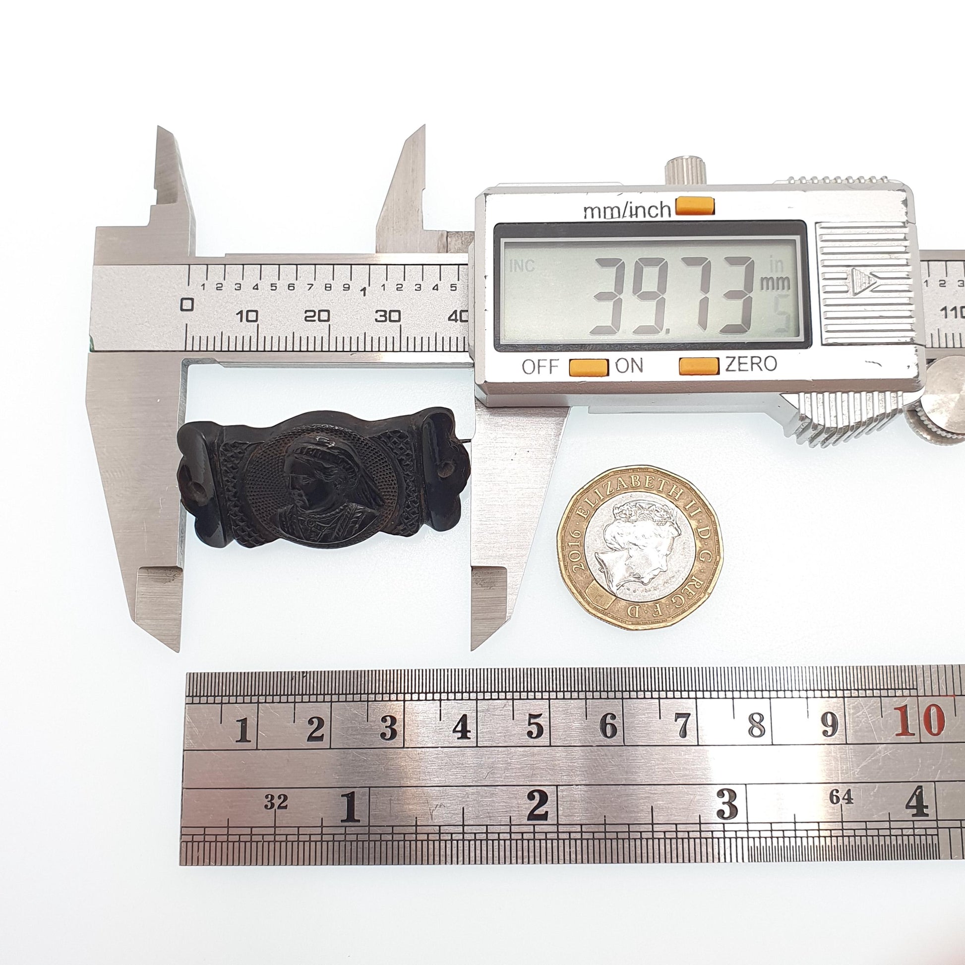 DESCRIPTION: A gorgeous and rare antique Victorian bog oak brooch, engraved with Queen Victorian. The item is made from bog oak wood, used to imitate Whitby Jet in the Victorian. It's fossilised wood found in peat bogs. The item weighs approx. 5.40g and the size dimensions are in the later photos. It has some chips and surface cracking in areas as to be expected with age and use.
