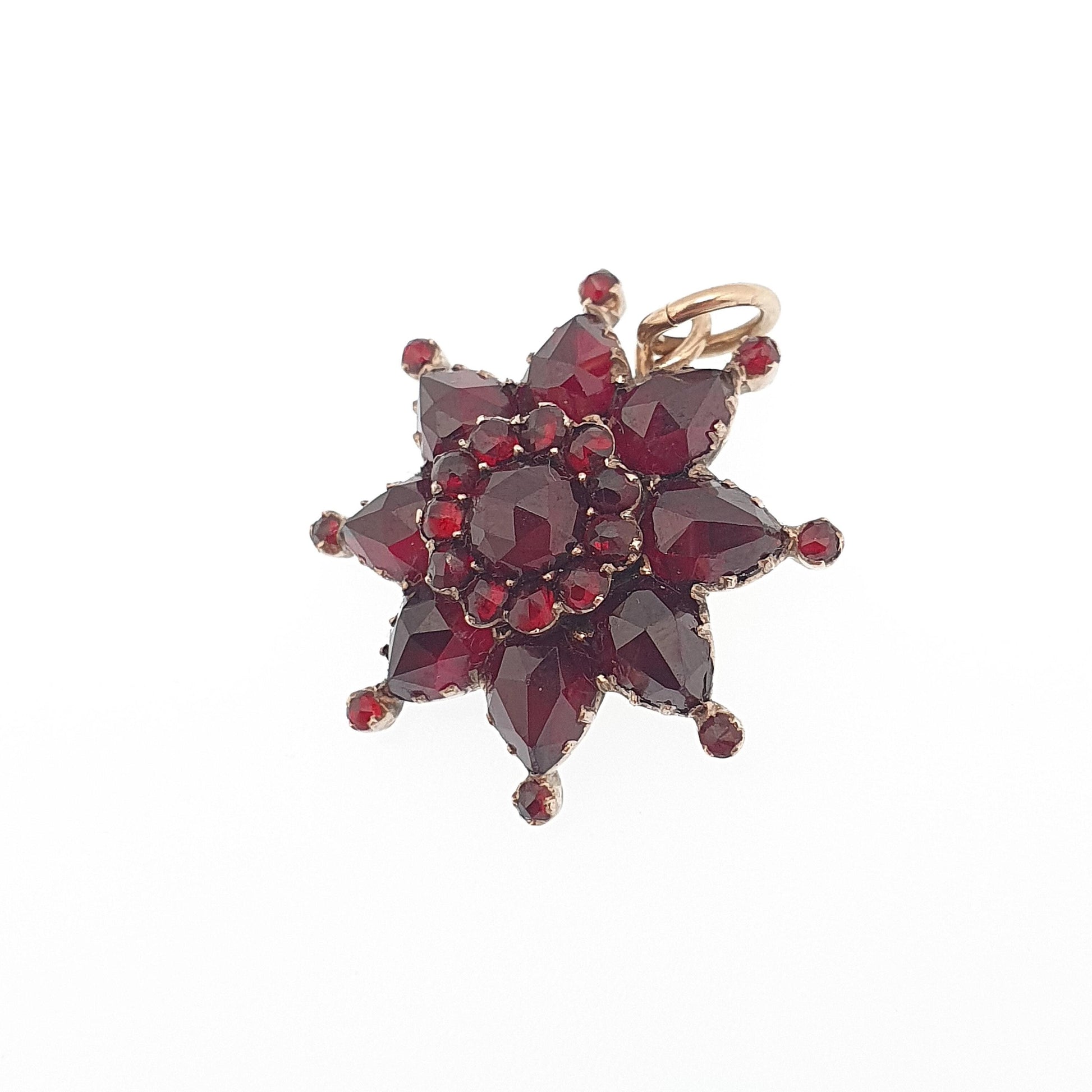 DESCRIPTION: An absolutely stunning antique Victorian rolled gold bohemian garnet pendant, in a star style shape. The brooch is adorned with numerous pyrope garnets, which have been hand cut and mounted onto a rolled gold body. It weighs approx. 2.54g and the size dimensions are in the later photos. The bail for the pendant has been lead solder onto the rear (see pictures/video).
