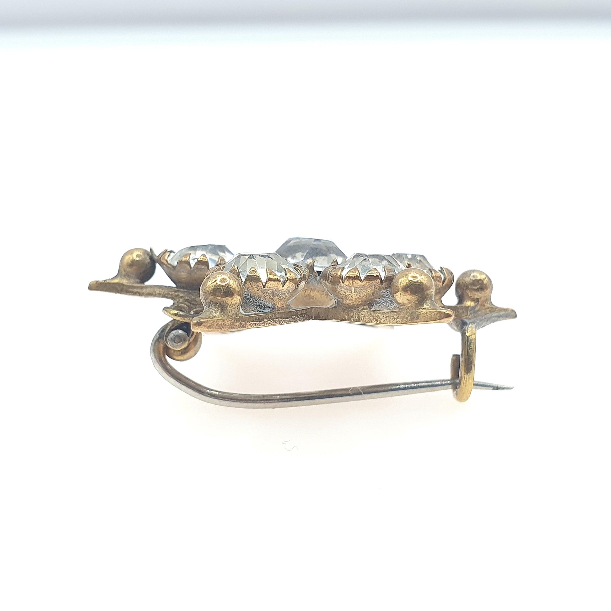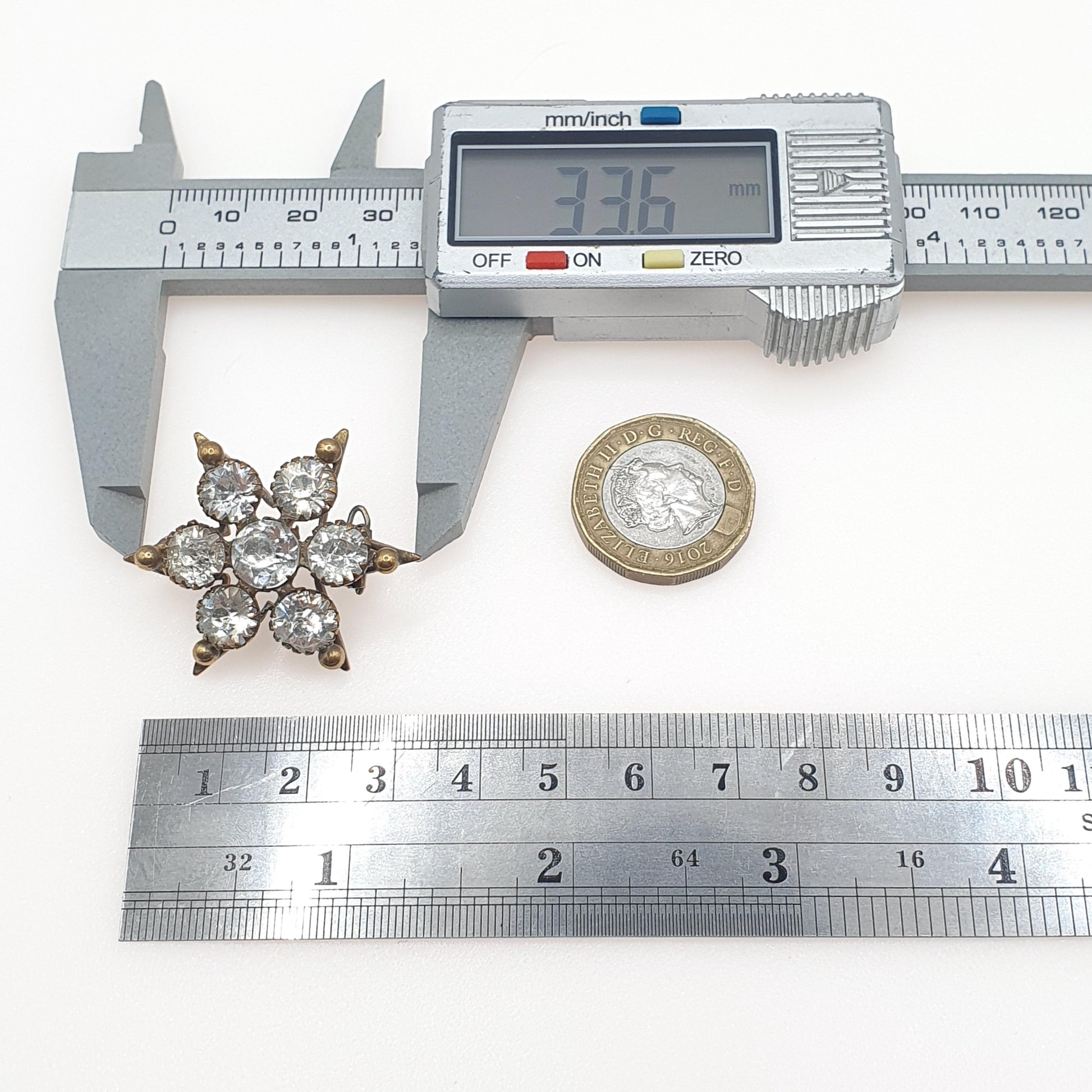 DESCRIPTION: A gorgeous antique Victorian gold tone base metal diamond paste star brooch. The item weighs 7.28g and the size dimensions are in the later photos. PLEASE NOTE: Some of the pastes are marked and rubbed. The hinge pin has also been replaced with wire (see pictures/video).