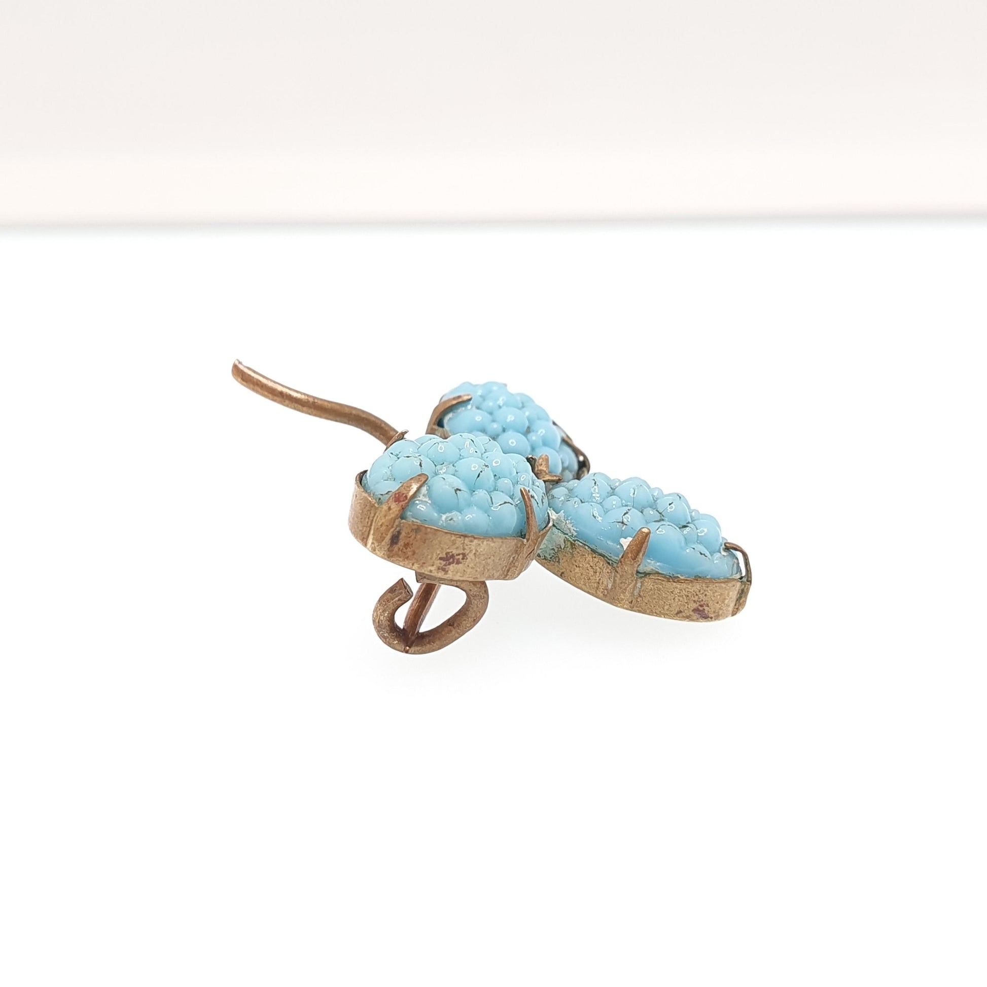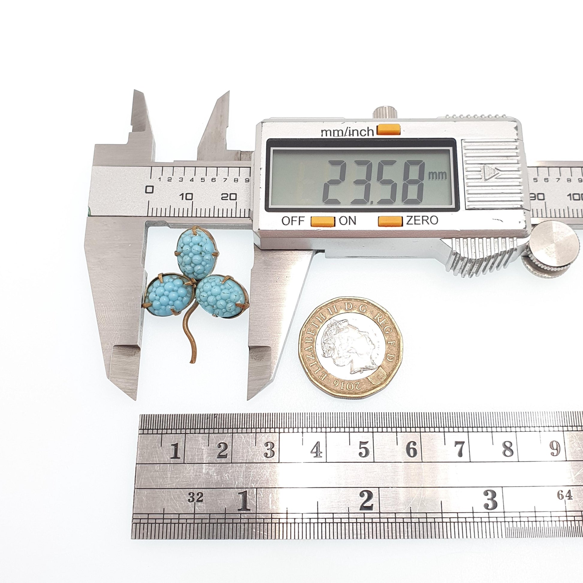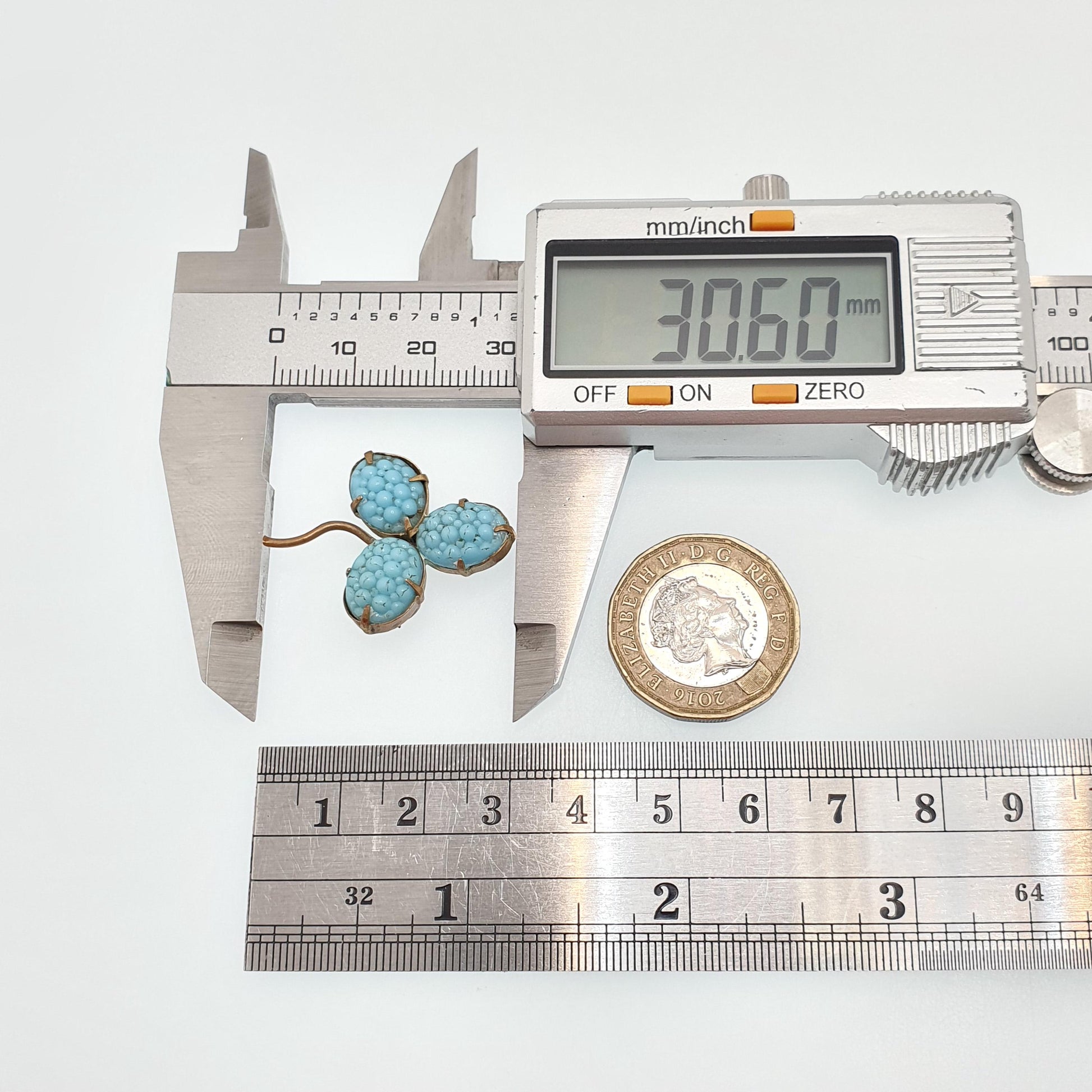 DESCRIPTION: A brilliant antique Victorian faux turquoise (glass) clover brooch, made from a gold tone base metal. It weighs approx. 3.41g and the size dimensions are in the later photos.